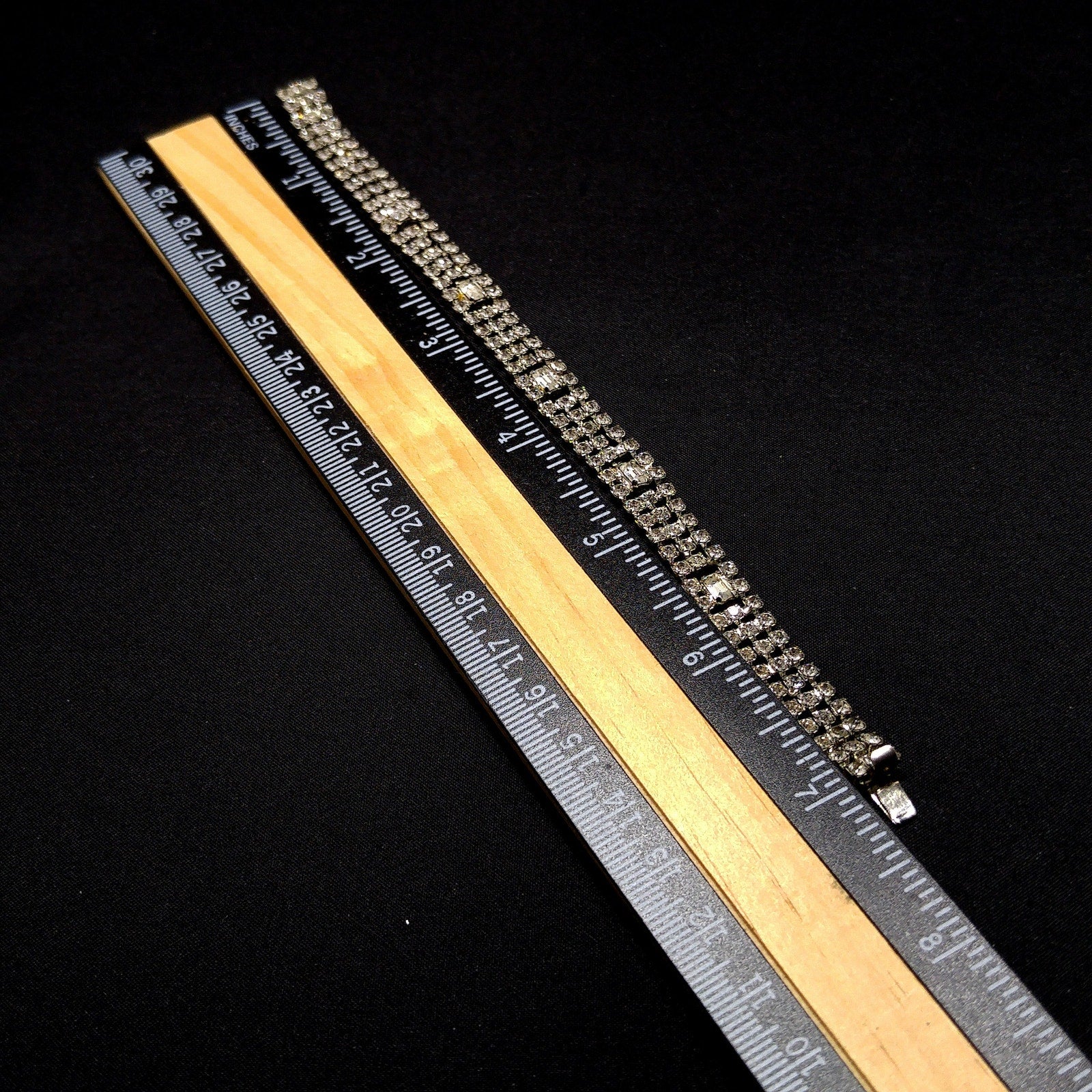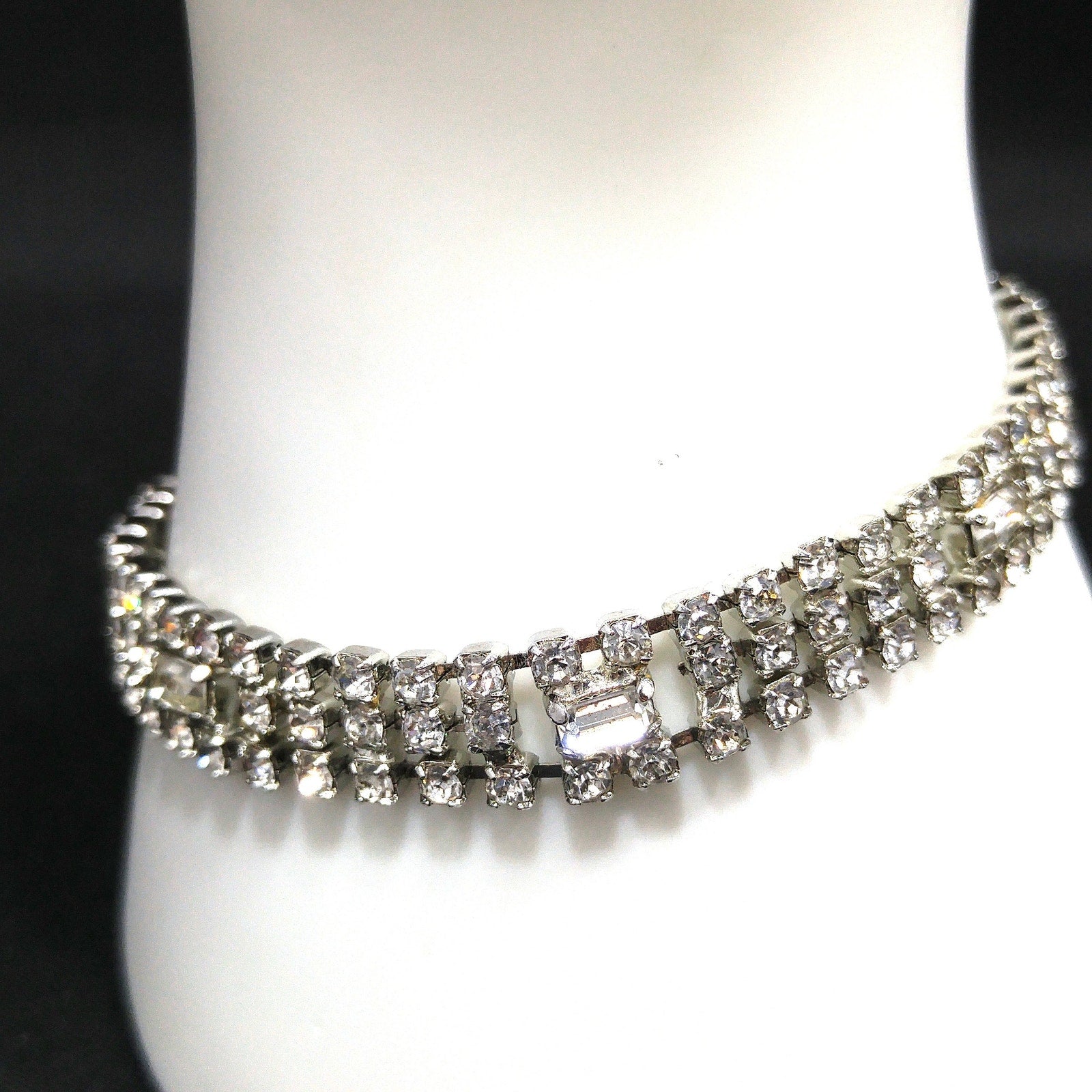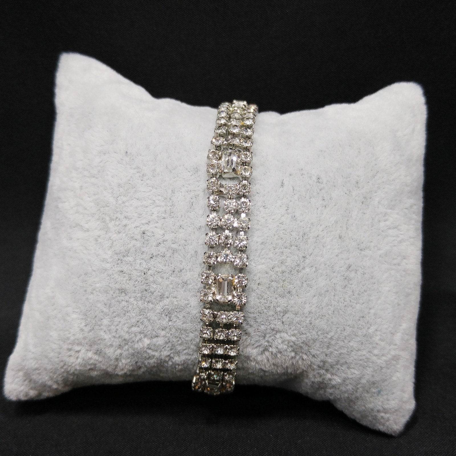 *Description: This is a beautiful Kramer clear rhinestone rhodium plated bracelet from the 1950s. The bracelet would be perfect for a wedding or any formal event. It has three rows of clear rhinestones with 5 emerald cut clear rhinestones down the center spaced apart. The clasp is a hidden box clasp and KRAMER is stamped on the back of the bracelet.