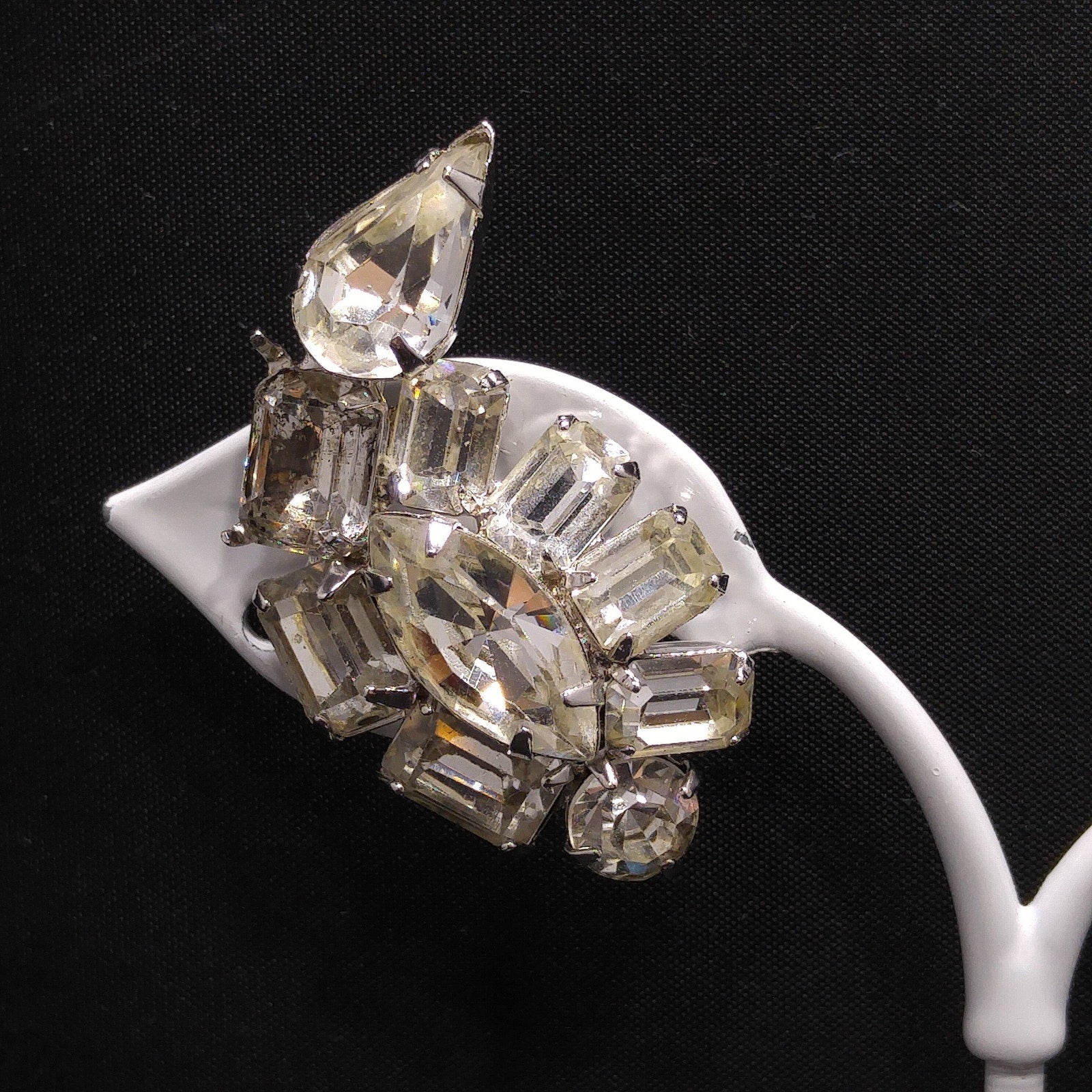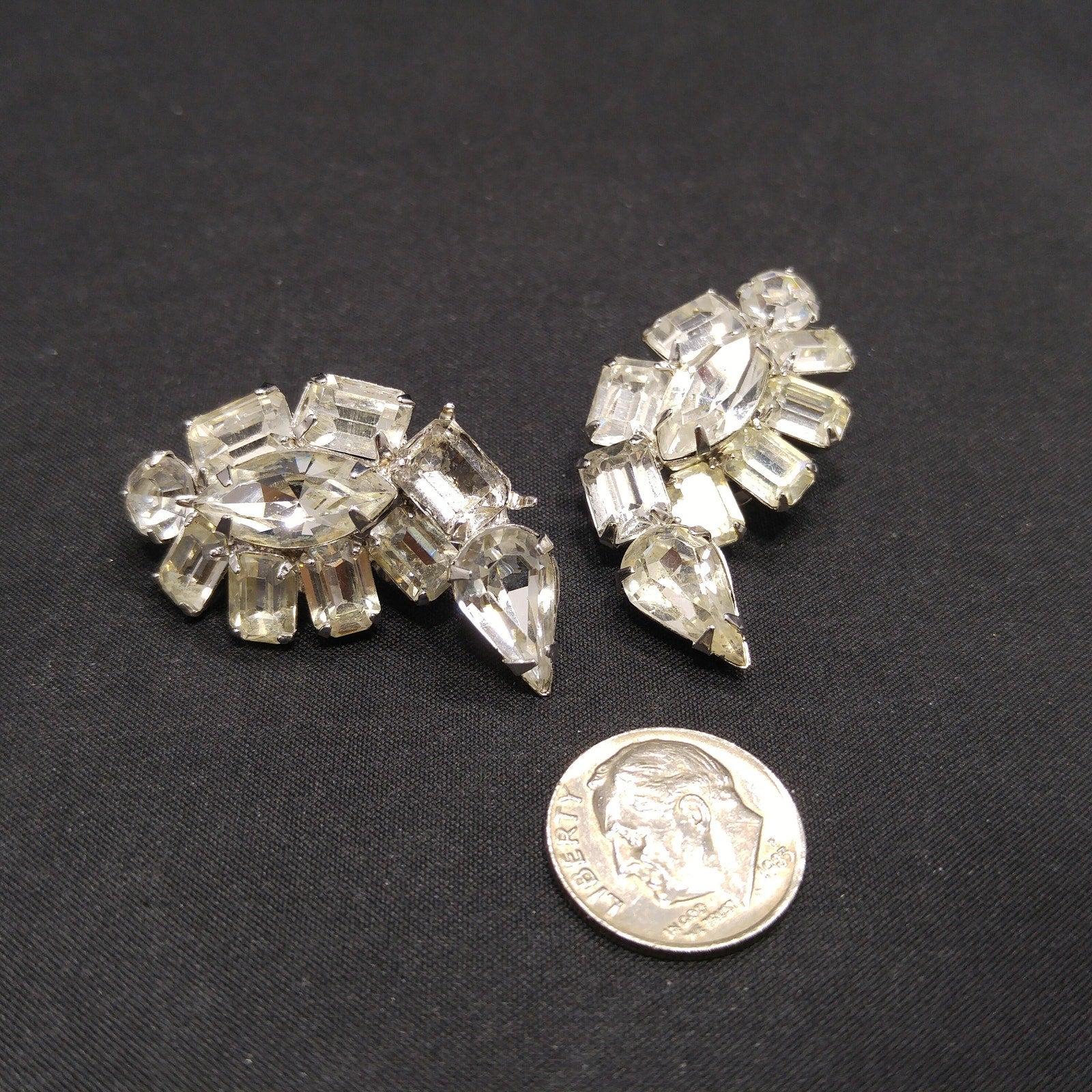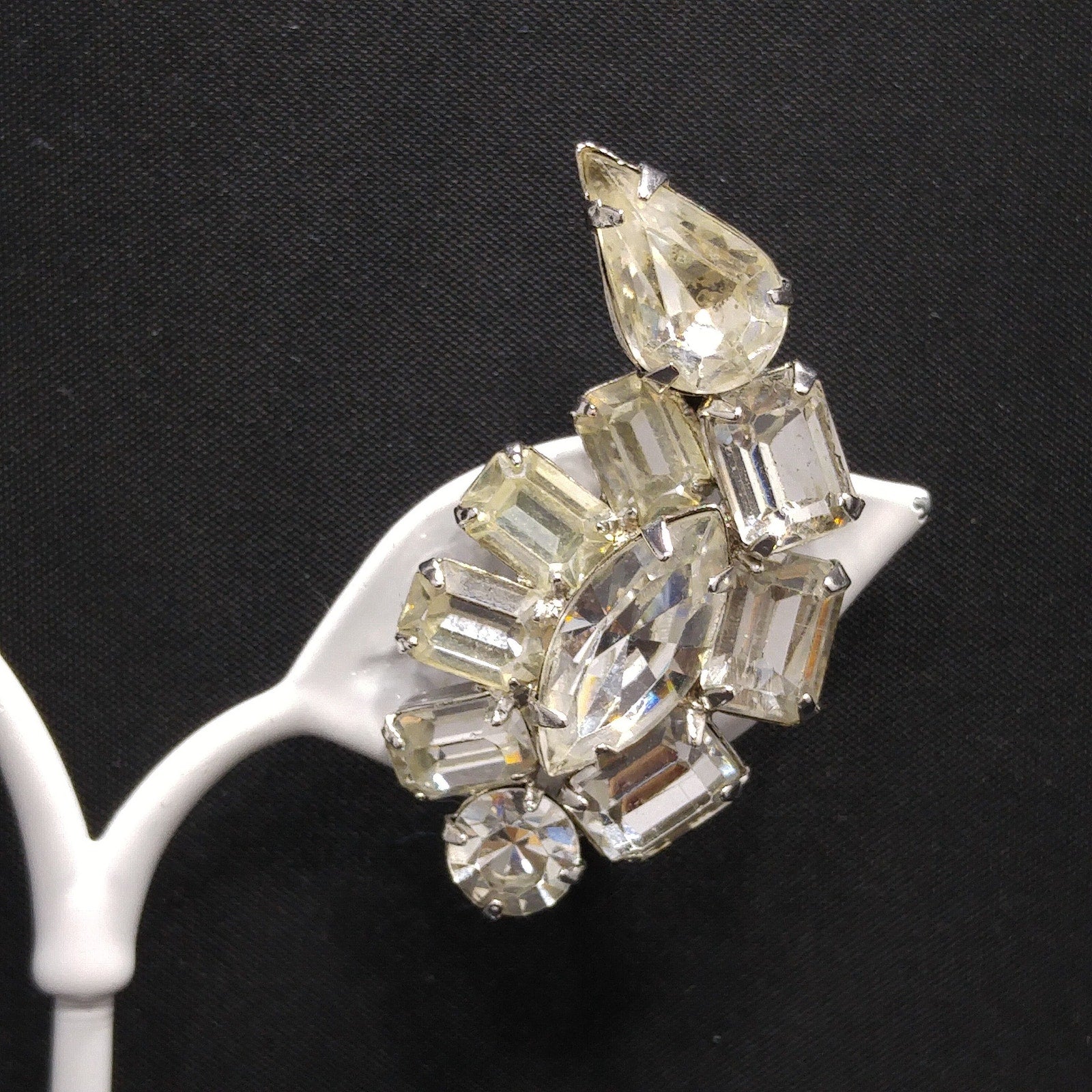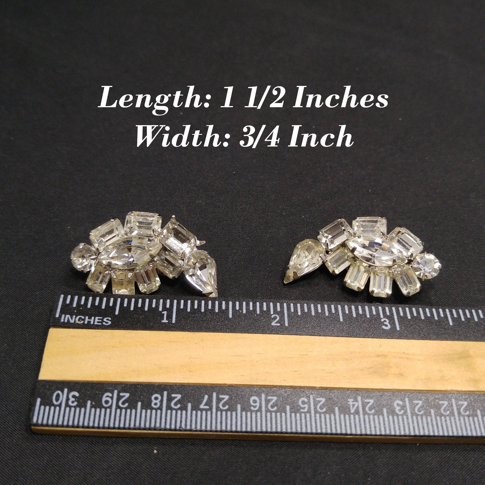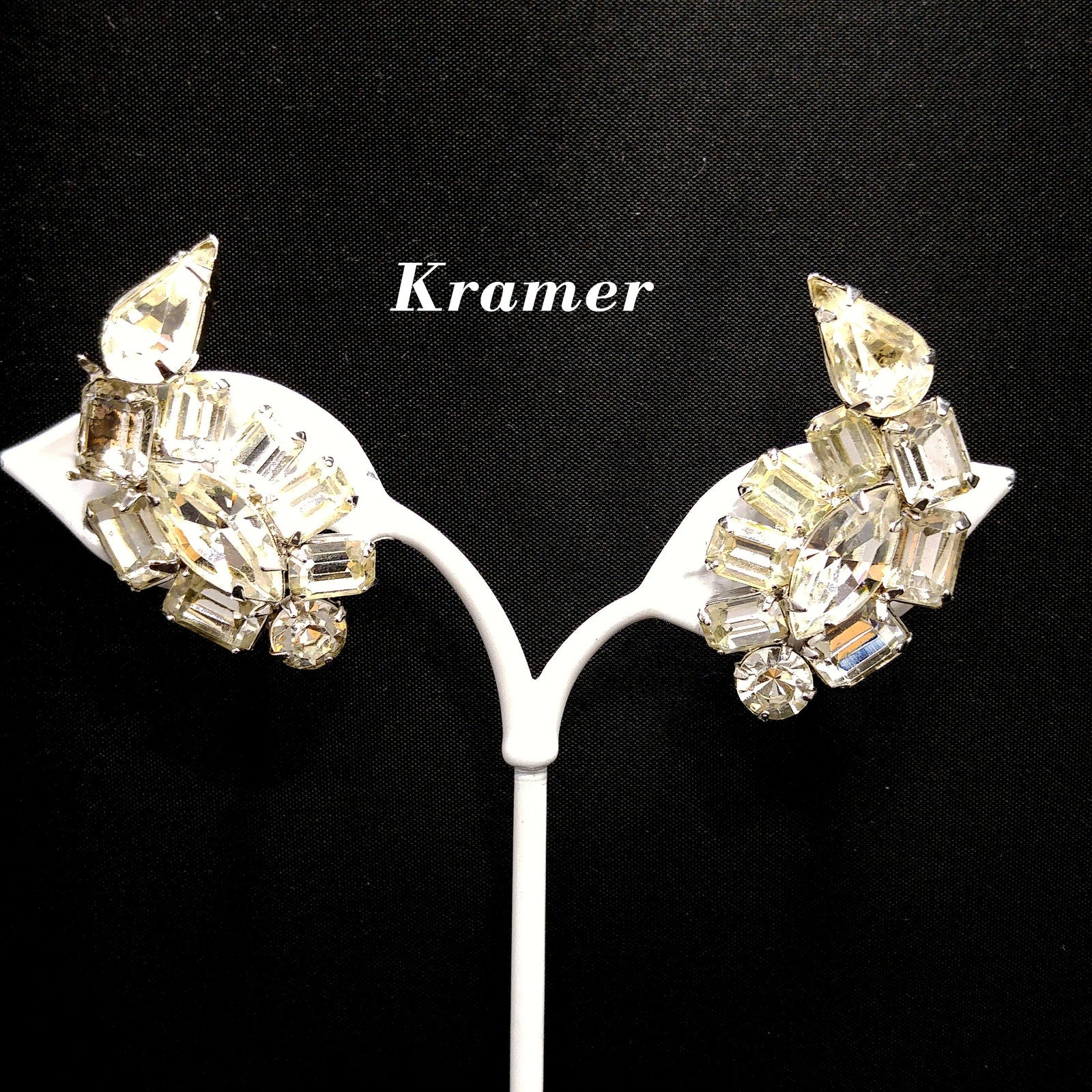 *Description: This is a beautiful pair of Kramer of New York clear rhinestone, ear climber clip on earrings from the 1950s. These earrings would be perfect for a wedding or any formal event. There are four rhinestone cuts within this earring set: chaton, marquise, emerald, and tear drop cuts. The earrings are rhodium plated and have a bright silver finish. This would be a great addition to your vintage jewelry collection or make a great vintage gift!