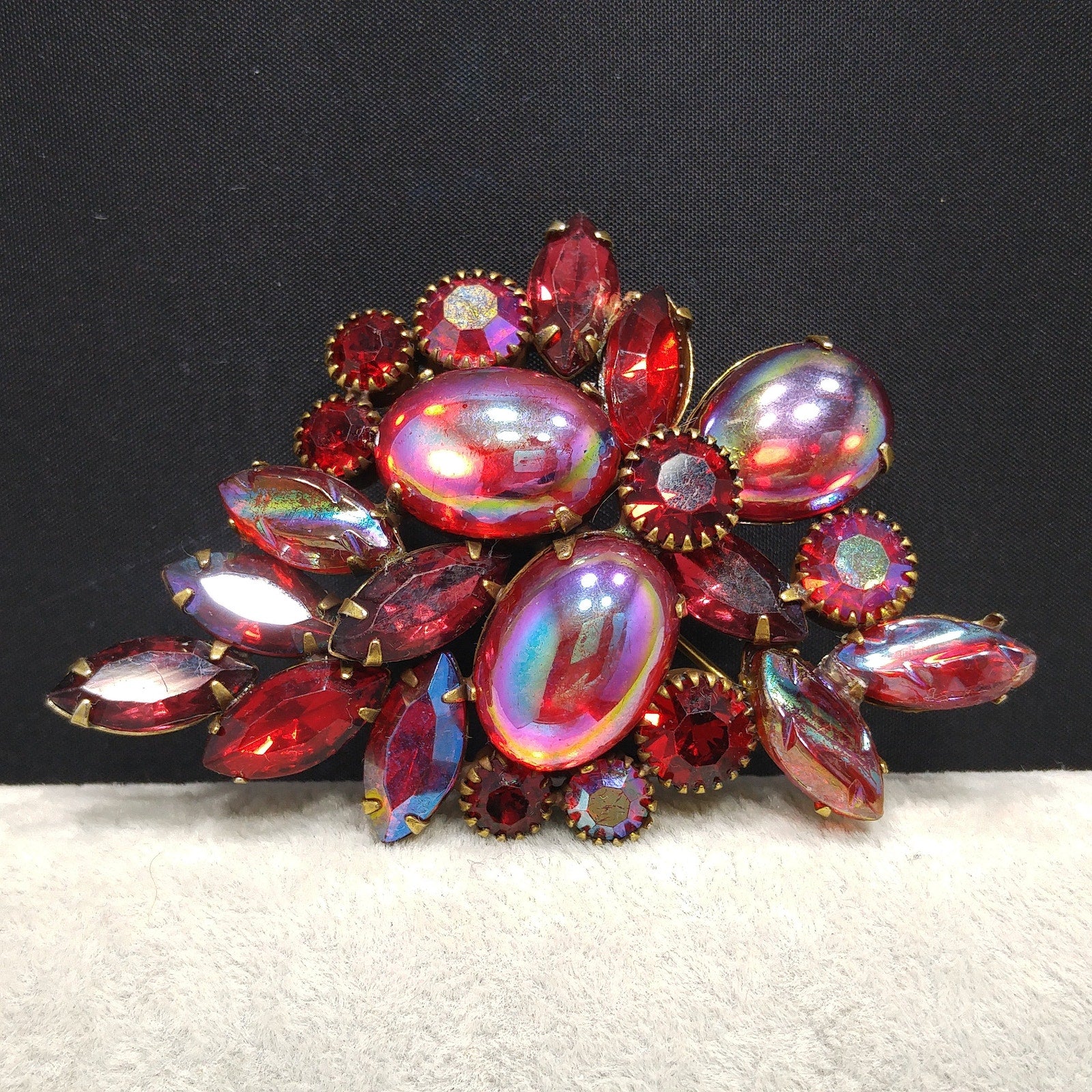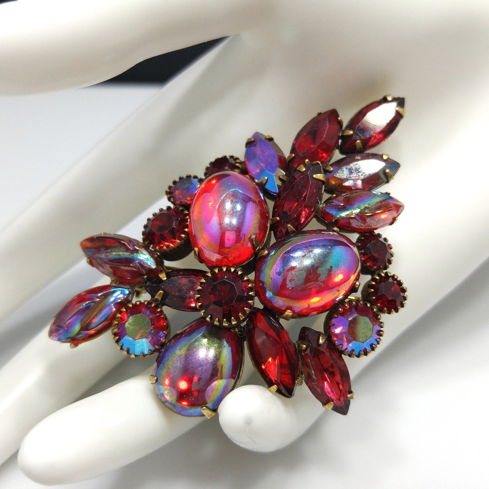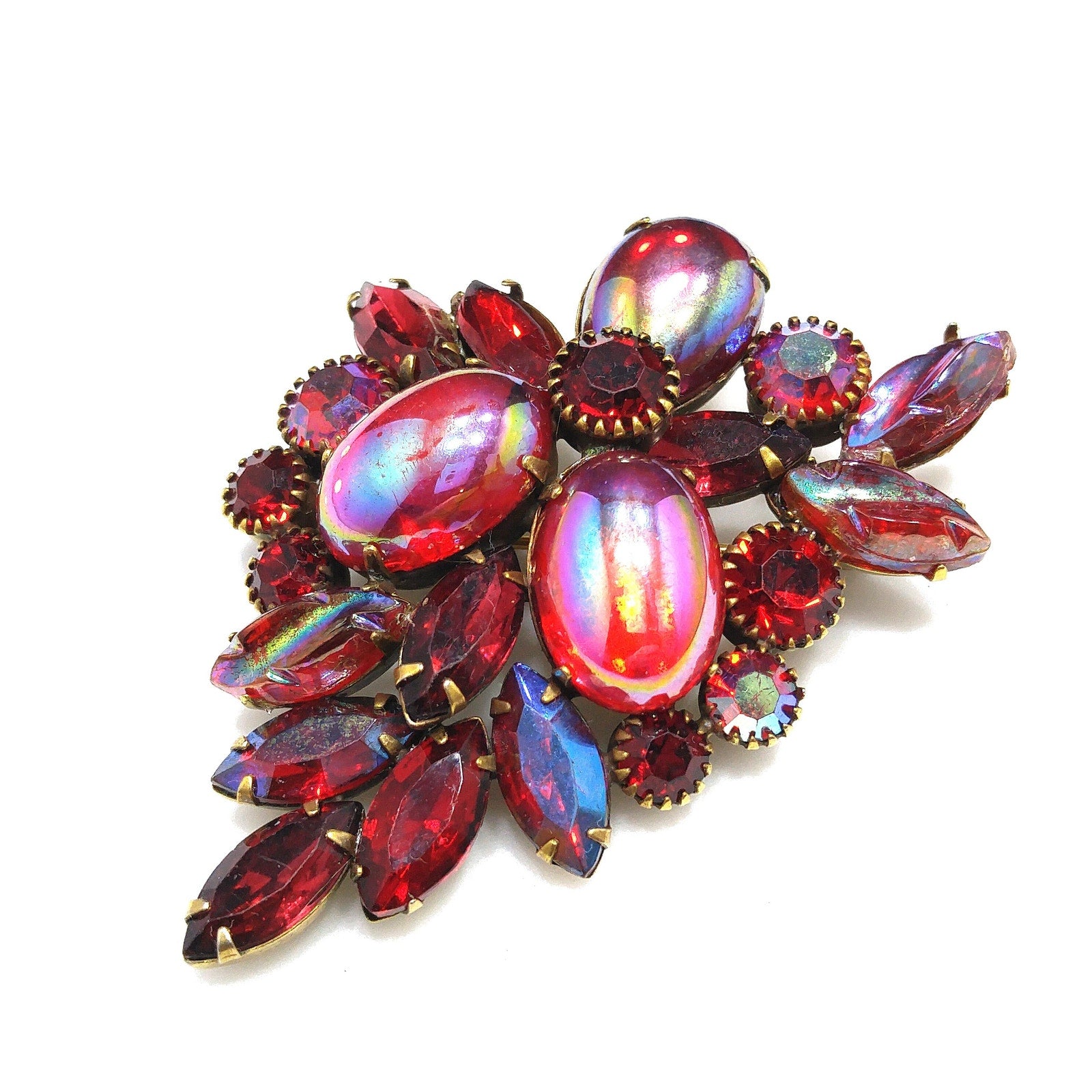 *Description: This is a gorgeous Kramer of New York red rhinestone and iridescent red cabochon brooch in a floral design from the 1960s. The combination of red rhinestones, aurora borealis, and red iridescent art glass is stunning. The antique gold tone backing is the perfect setting for the red designs. This would be a great addition to your vintage jewelry collection or make a great vintage gift!