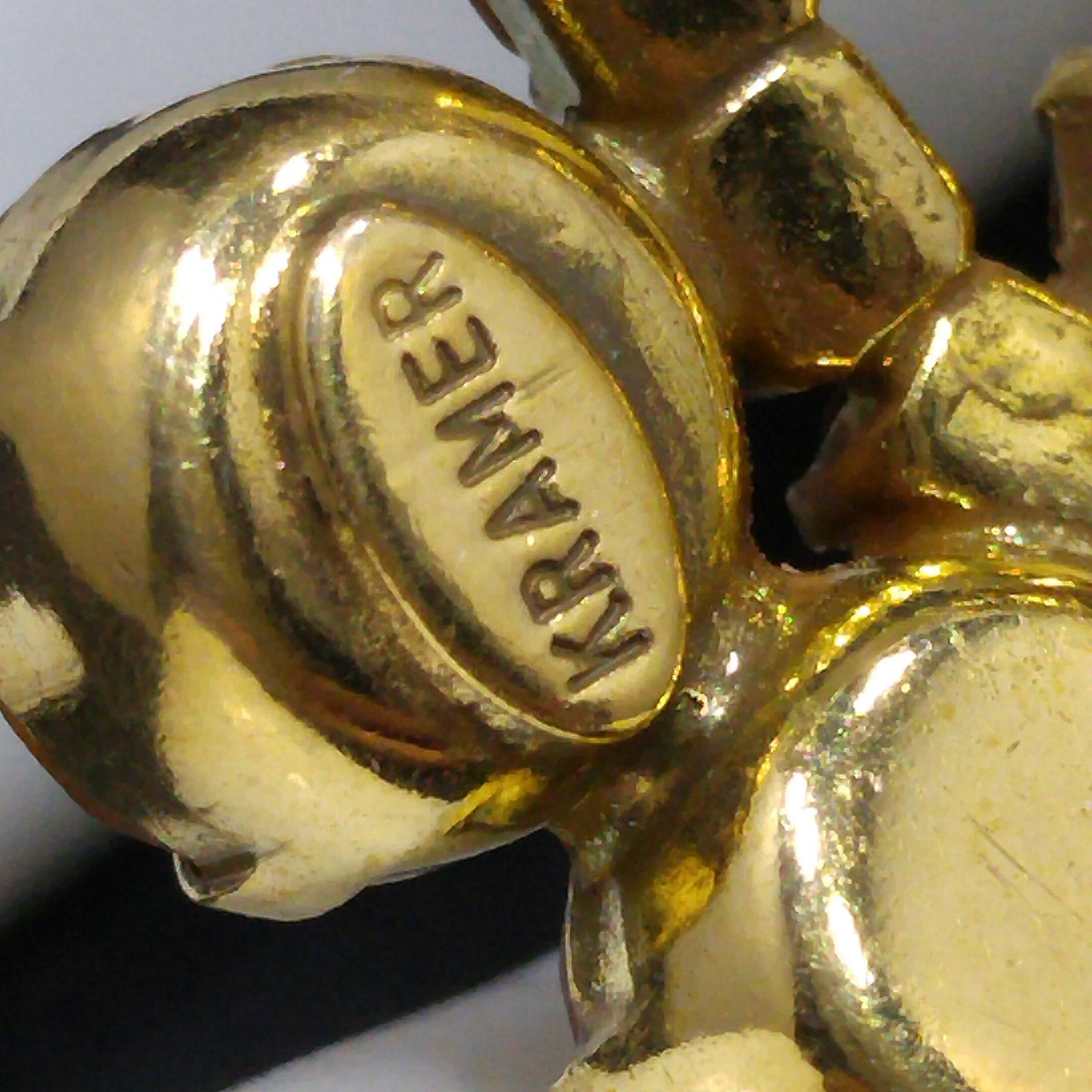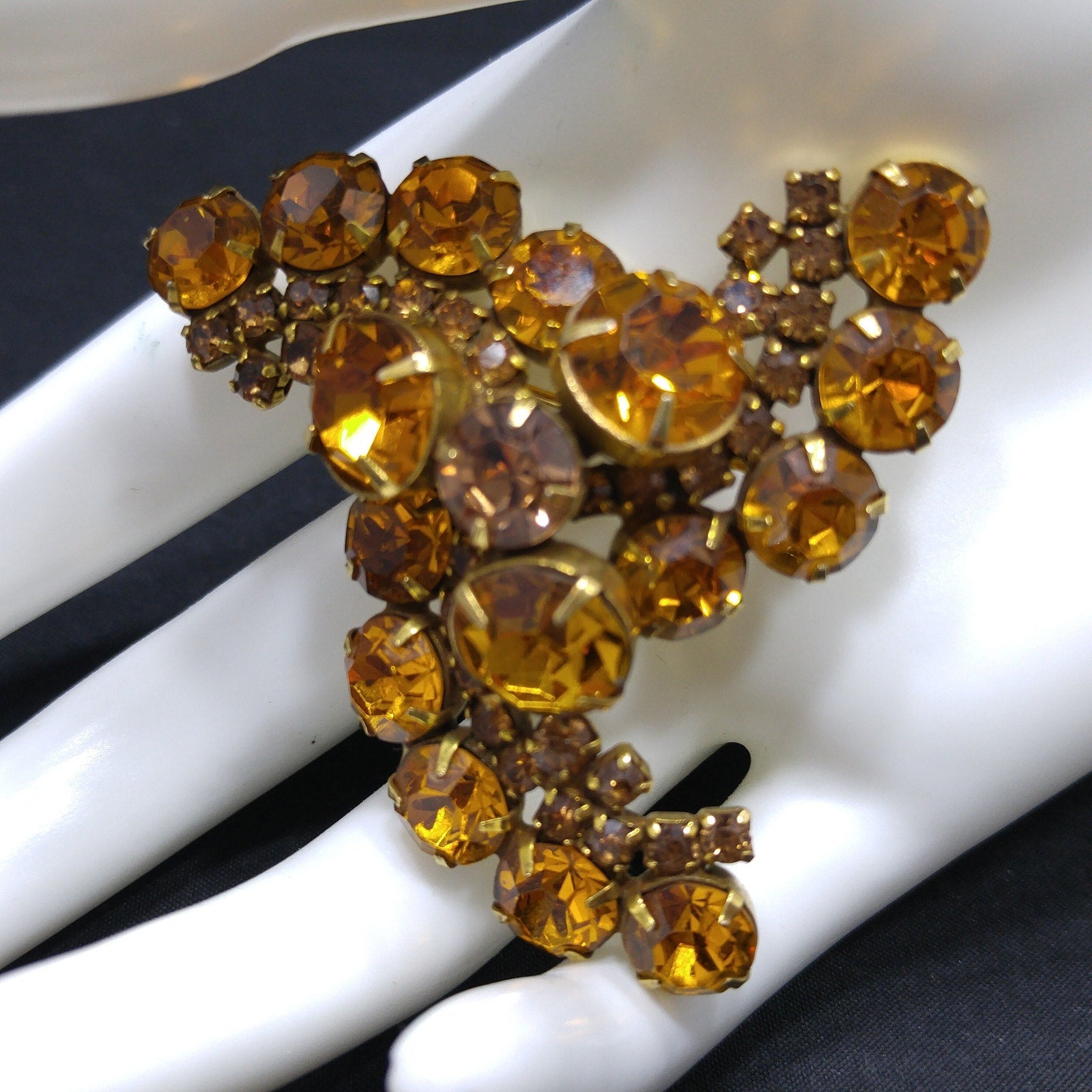 *Description: This is a gorgeous Kramer sparkling light topaz rhinestone brooch with a three dimensional look which takes on a spiral design from the 1960s. The back is a bright gold plated backing with a raised cartouche signed KRAMER. This is a gorgeous brooch. This would be a great addition to your vintage jewelry collection or make a great vintage gift!
