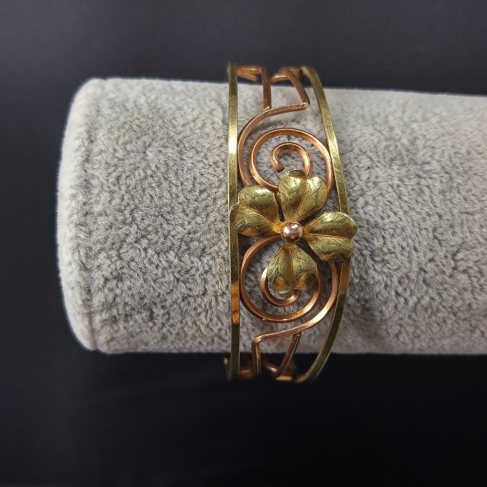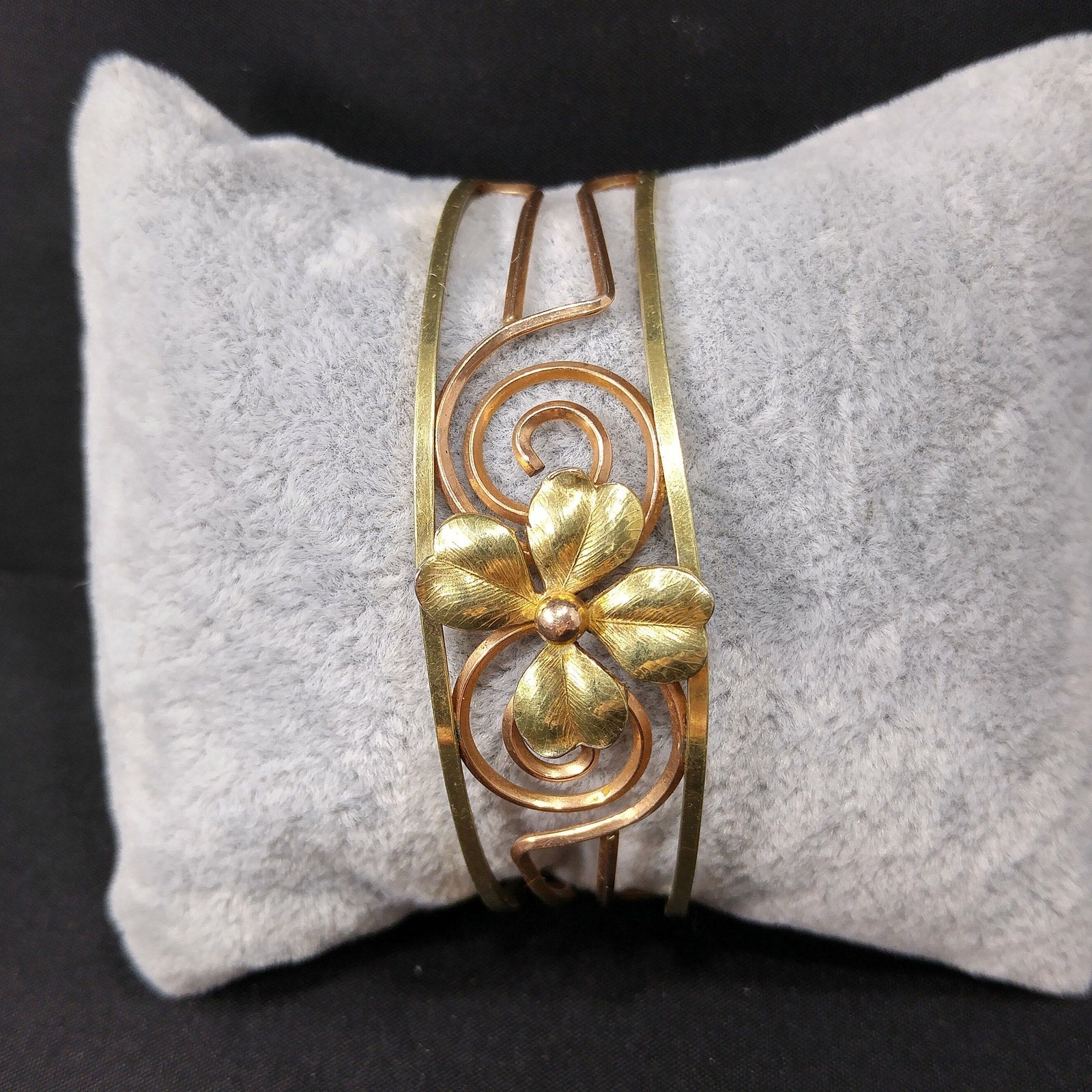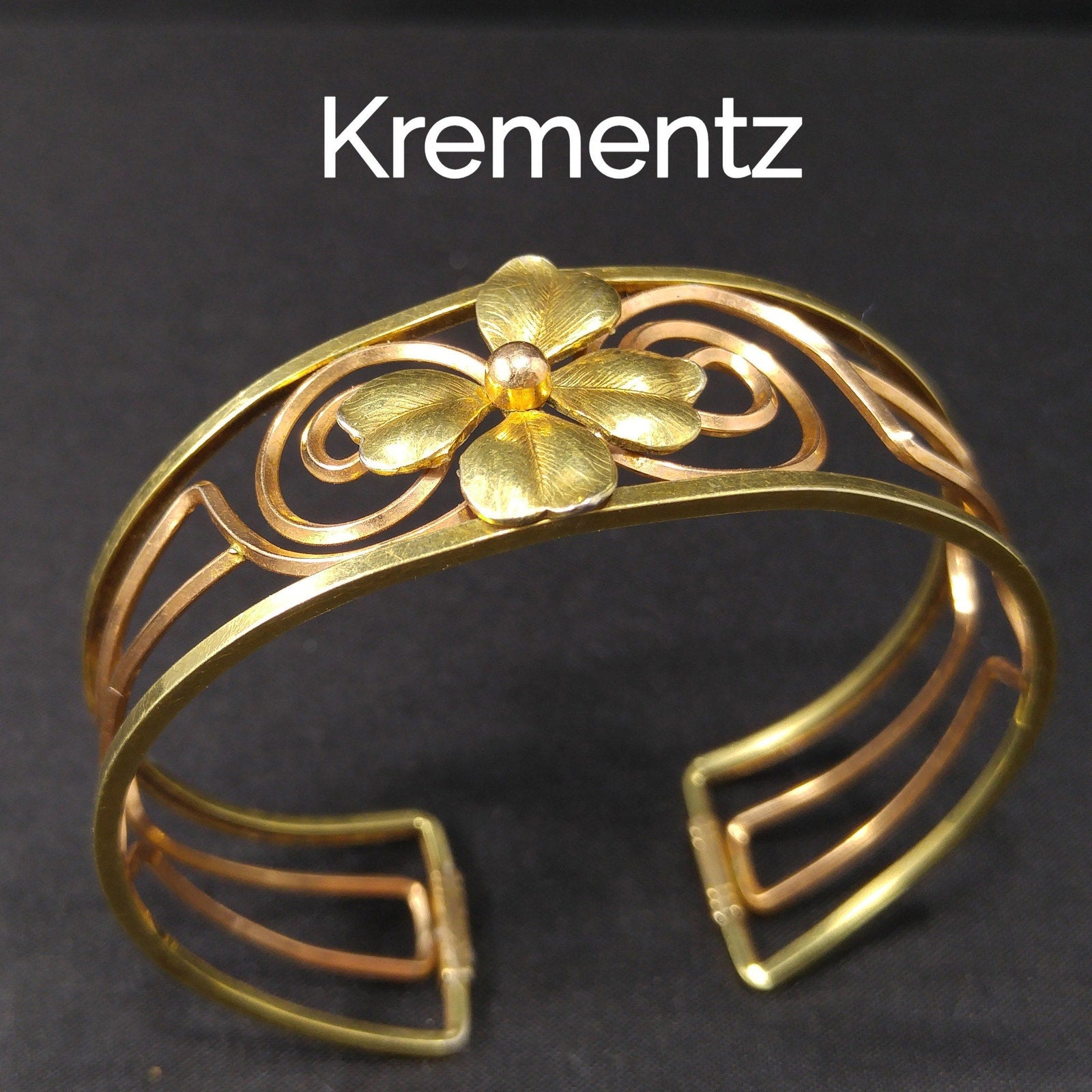 *Description: This is a beautiful 14 K rolled gold overlay Krementz cuff bracelet featuring a gold four leaf clover in the center. The open work makes the bracelet light on your wrist. On the end of each side of the cuff is the KREMENTZ stamp. The bracelet is six inches around the inside with 3/4 of an inch gap. This cuff bracelet would be a great gift or wonderful addition to your vintage jewelry collection.