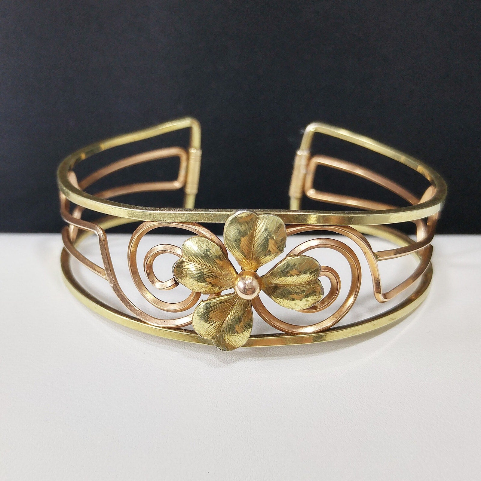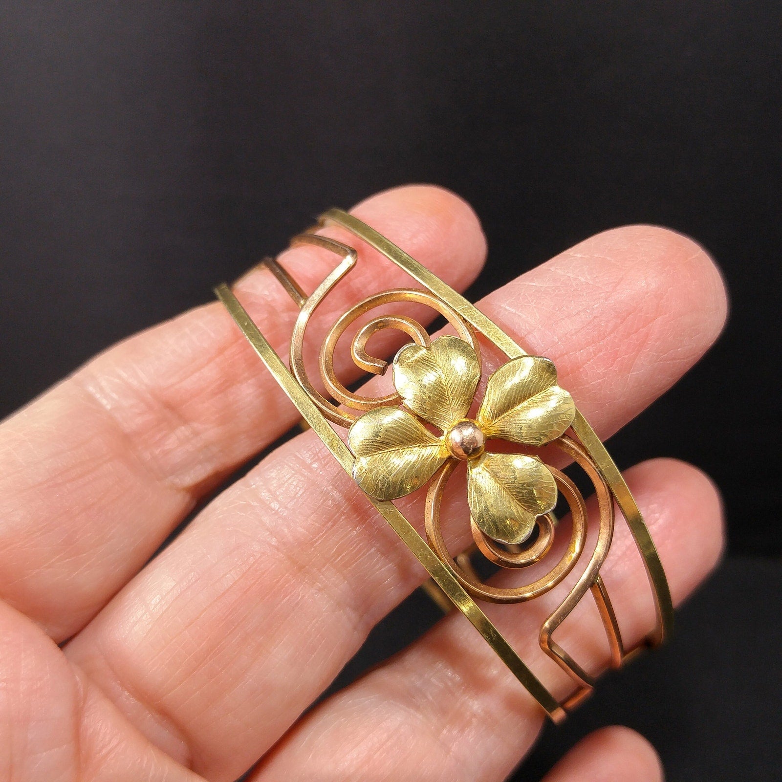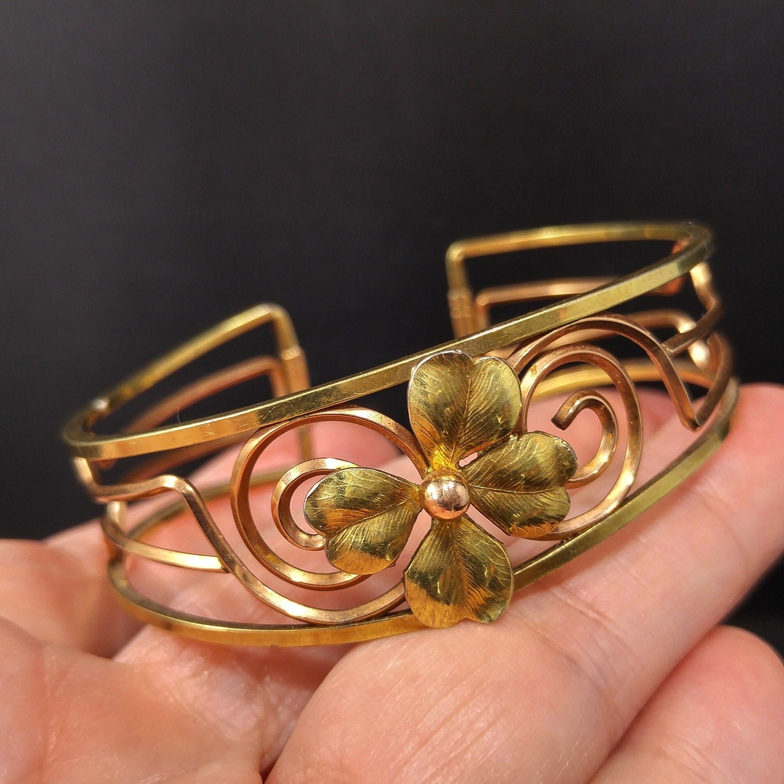 Krementz 14K Rolled Gold Overlay Cuff Bracelet, Openwork Gold Clover Center, Signed Krementz, 1960s Vintage Jewelry