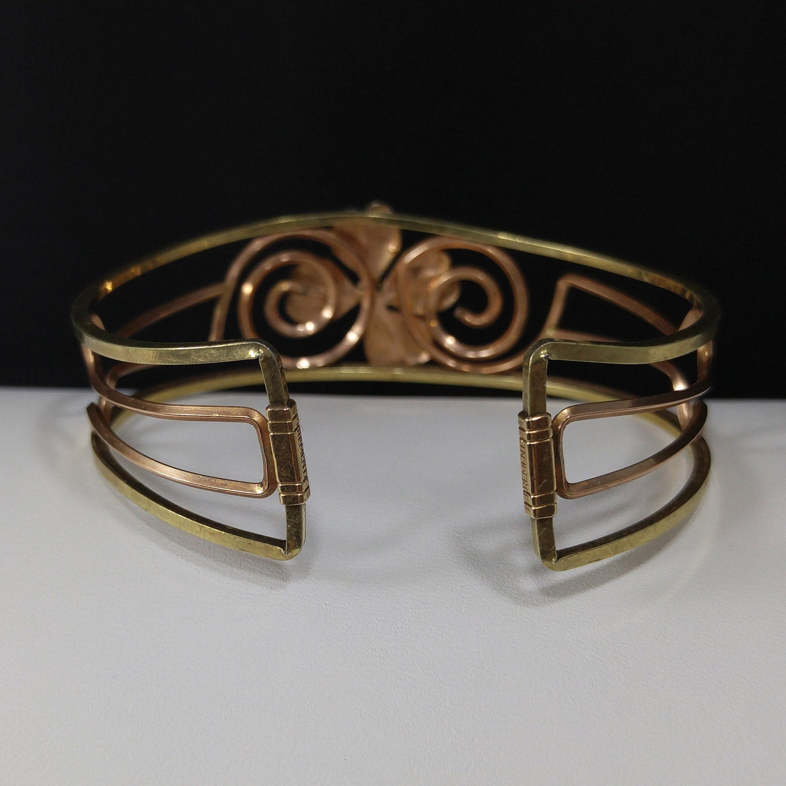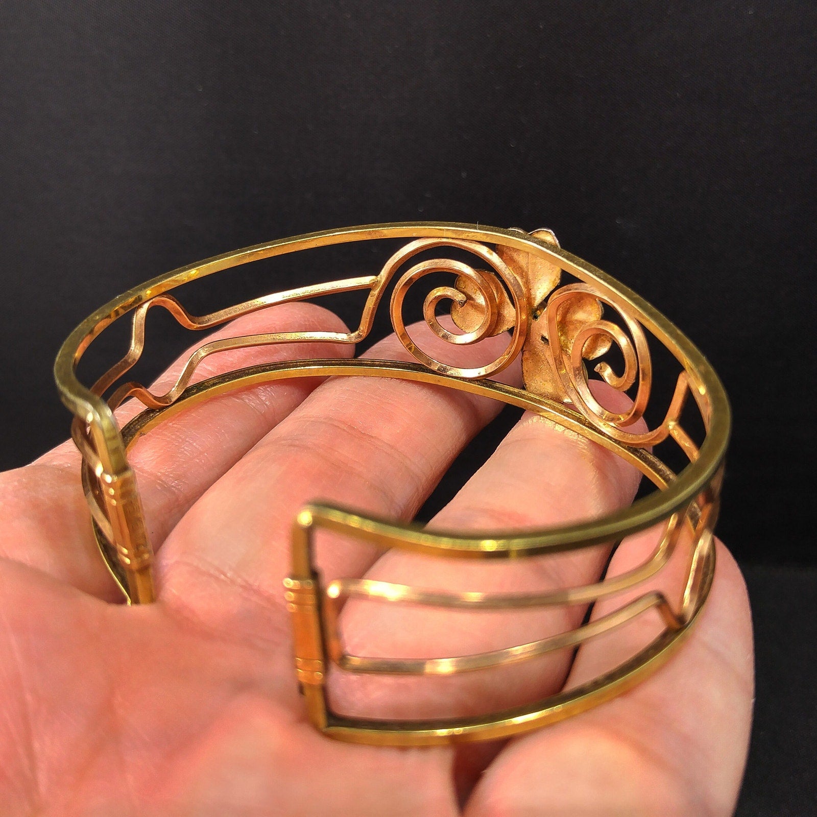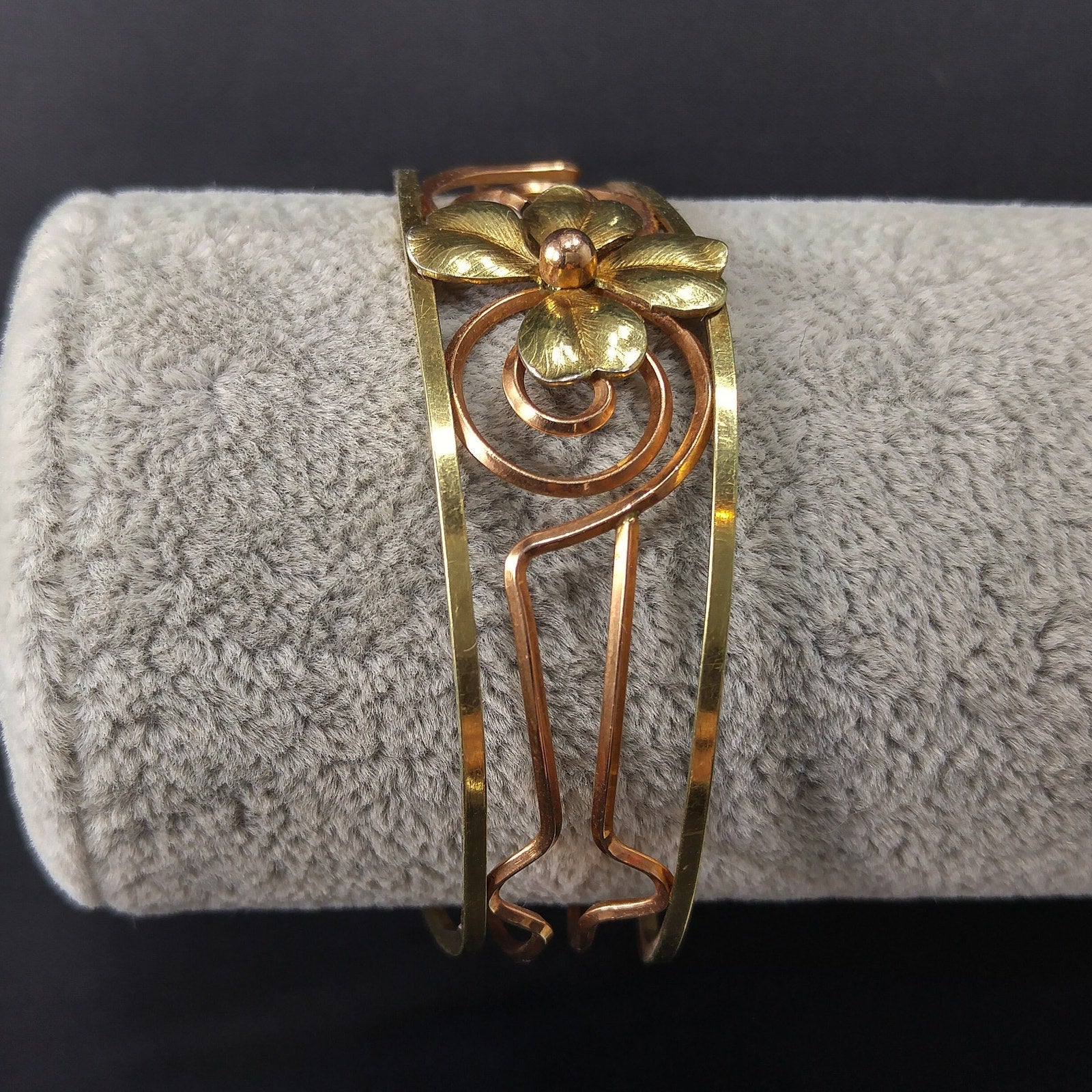 Krementz 14K Rolled Gold Overlay Cuff Bracelet, Openwork Gold Clover Center, Signed Krementz, 1960s Vintage Jewelry