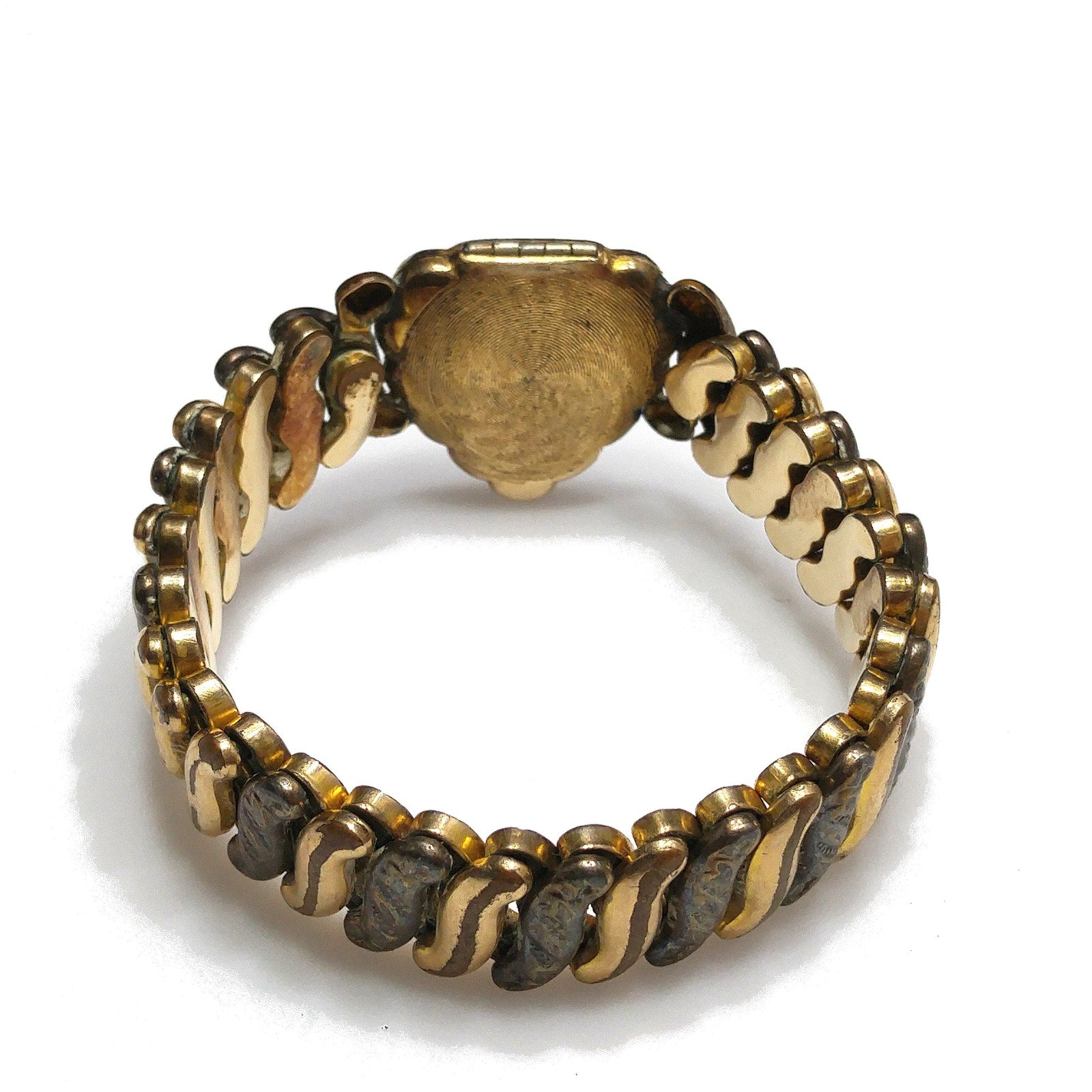 La Mode 1920s Guilloche Enamel Heart Locket Expansion Bracelet 12K GF Antique