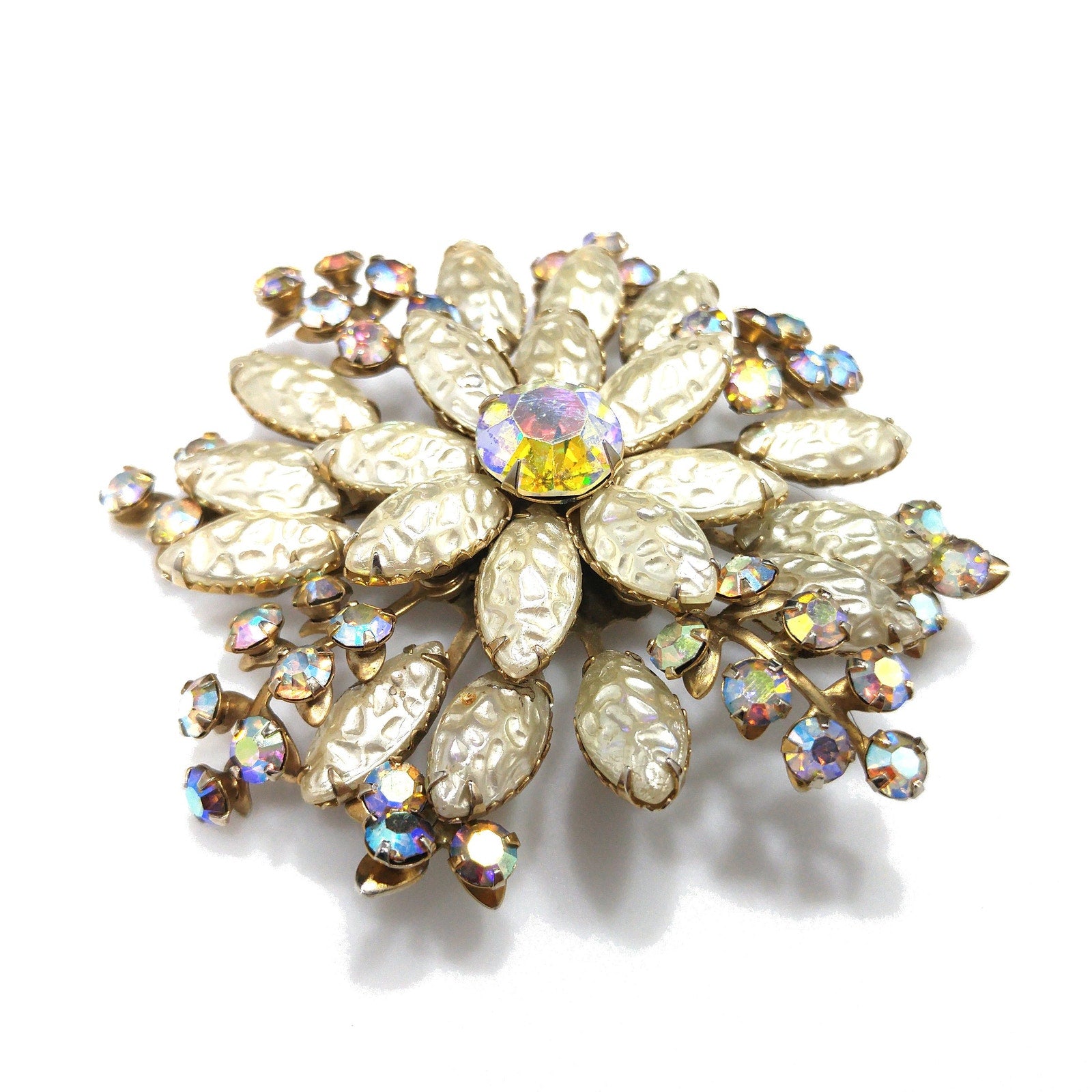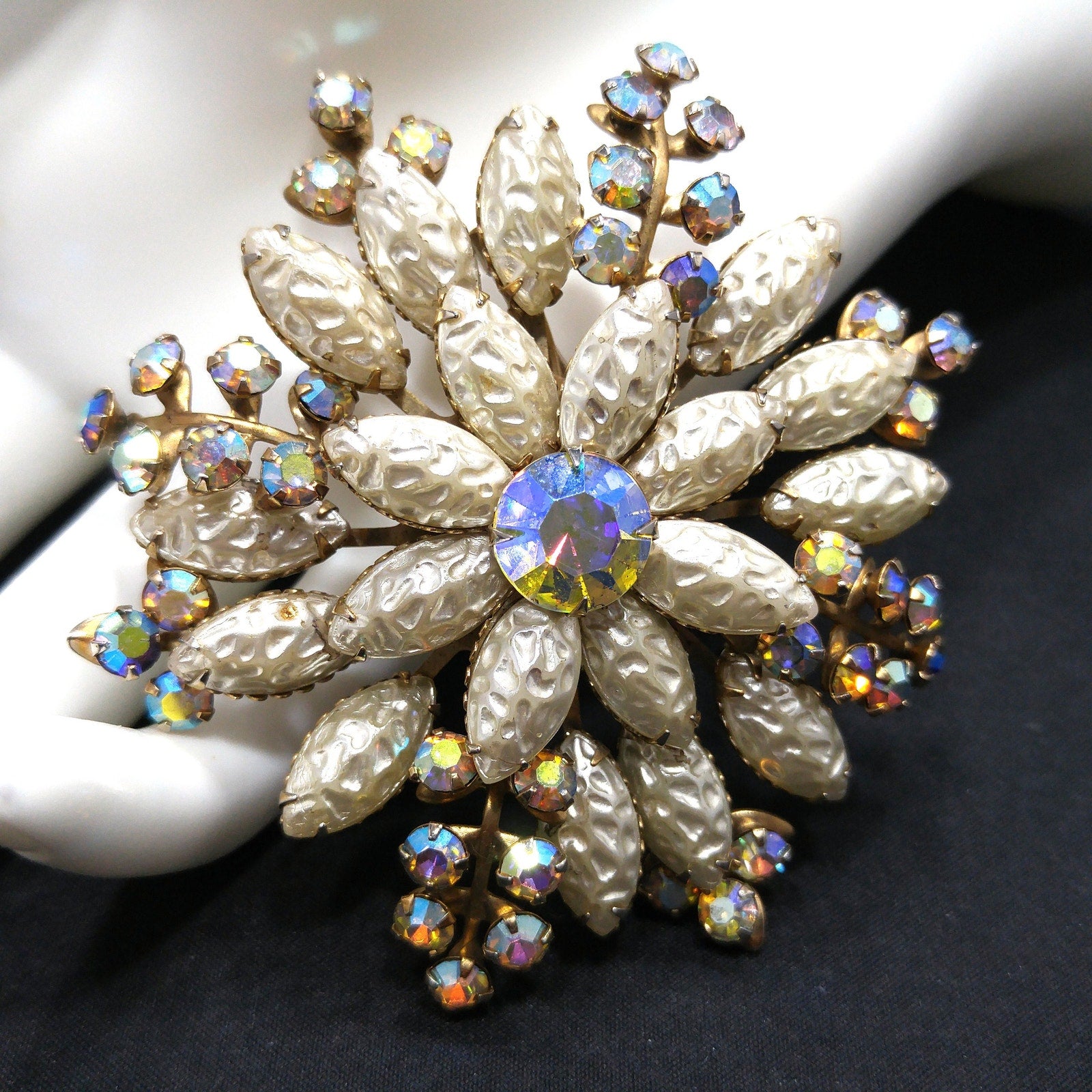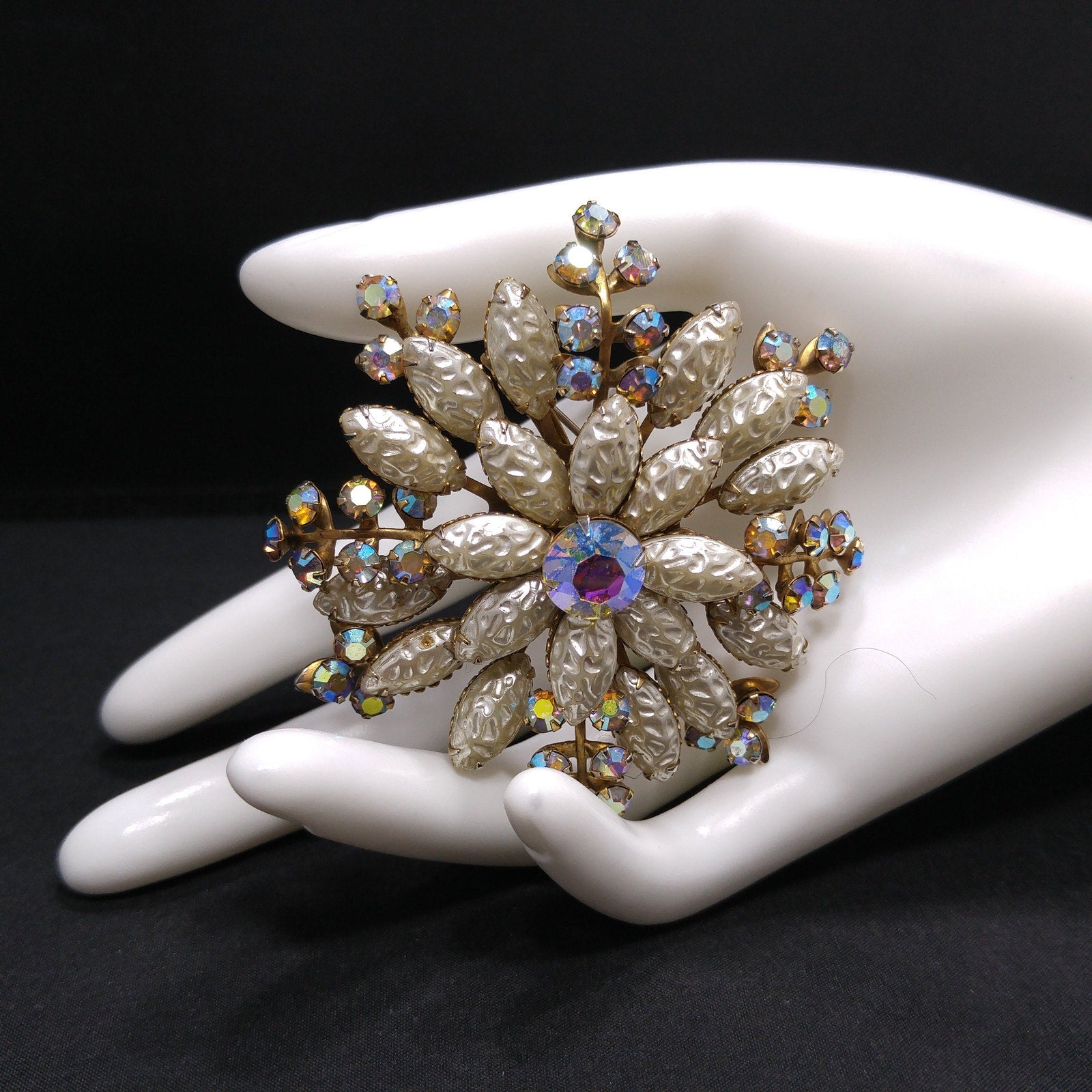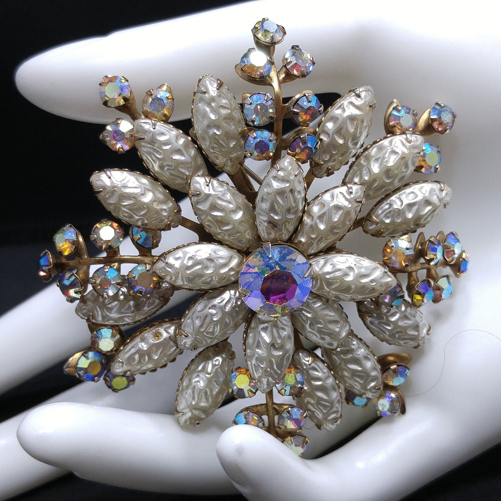 *Description: This beautiful vintage brooch is made with white molded pearled glass, sometimes referred to as lava glass. In addition to the lava glass petals, there are aurora borealis rhinestone leaves mixed throughout. In the center is a beautiful aurora borealis large rhinestone chaton, which has a strong pink glow. This brooch is large at 3 inches across in width and length. This would be a great addition to your vintage jewelry collection or make a great vintage gift!