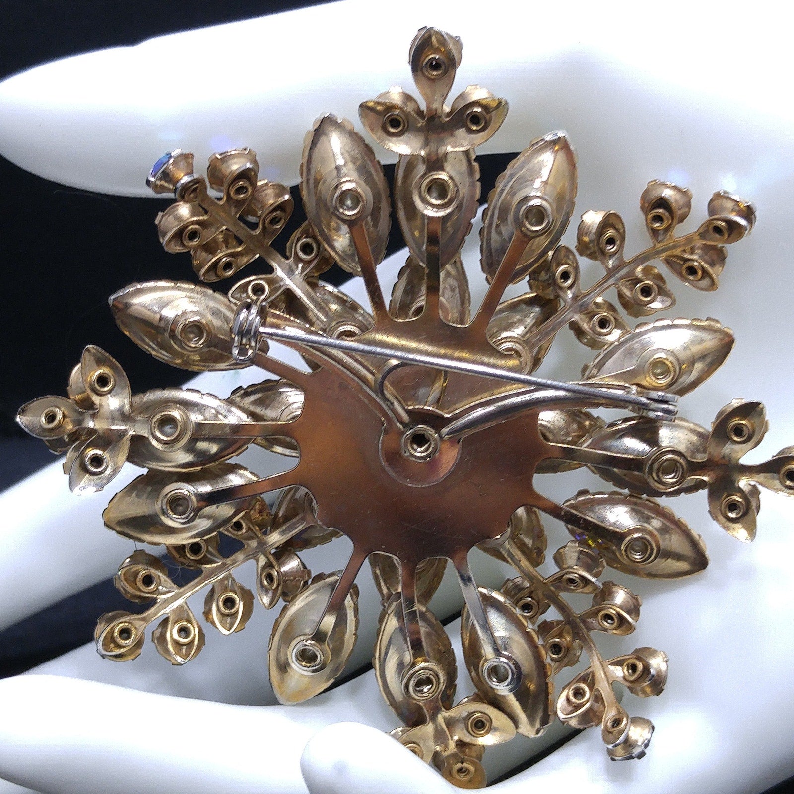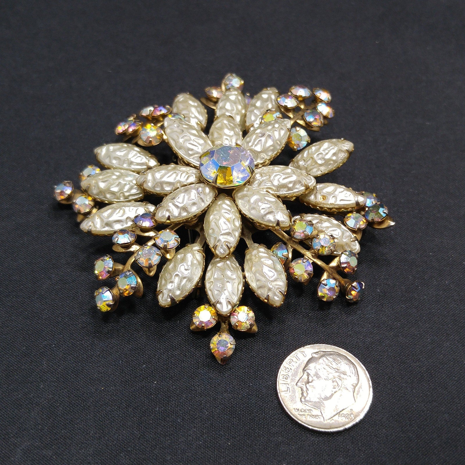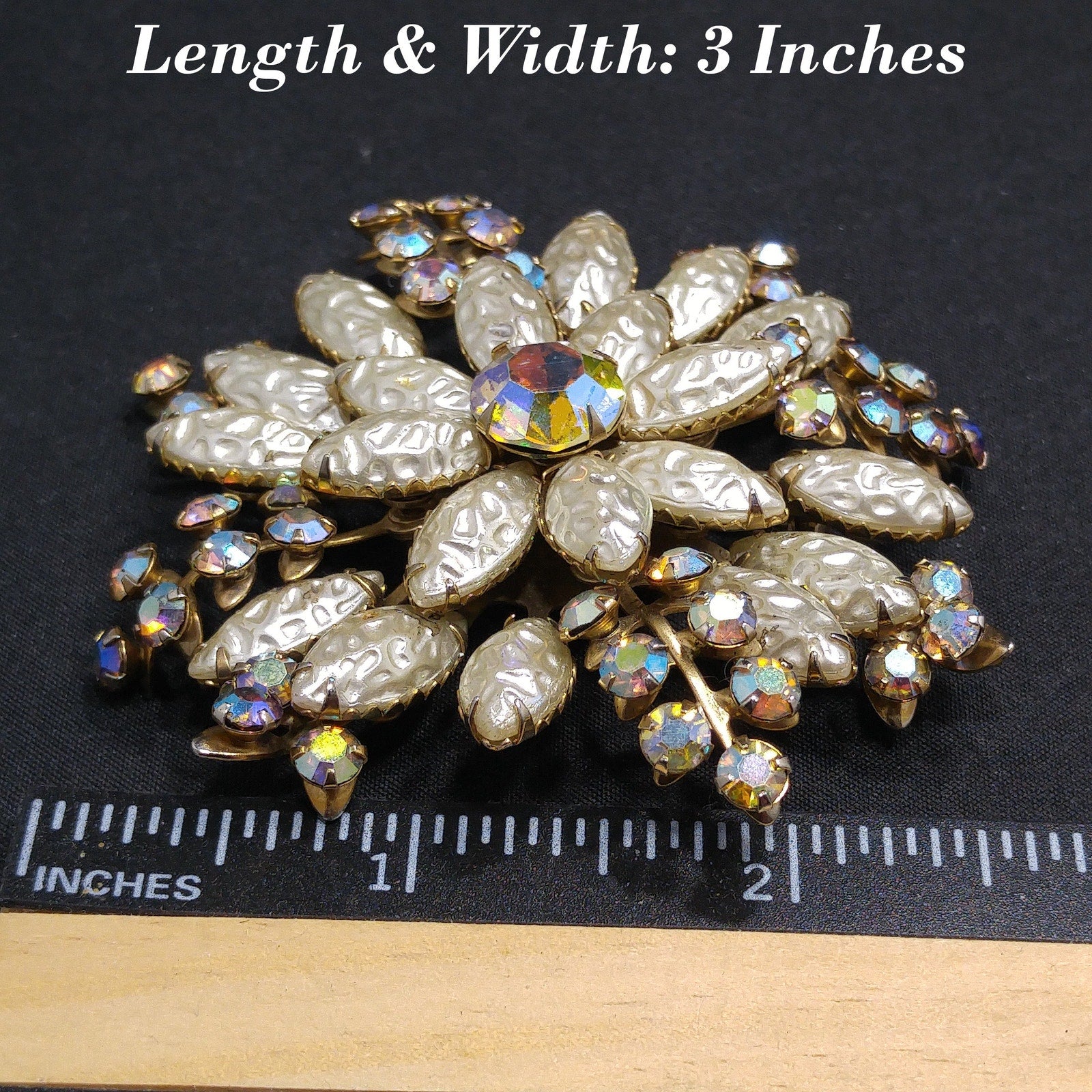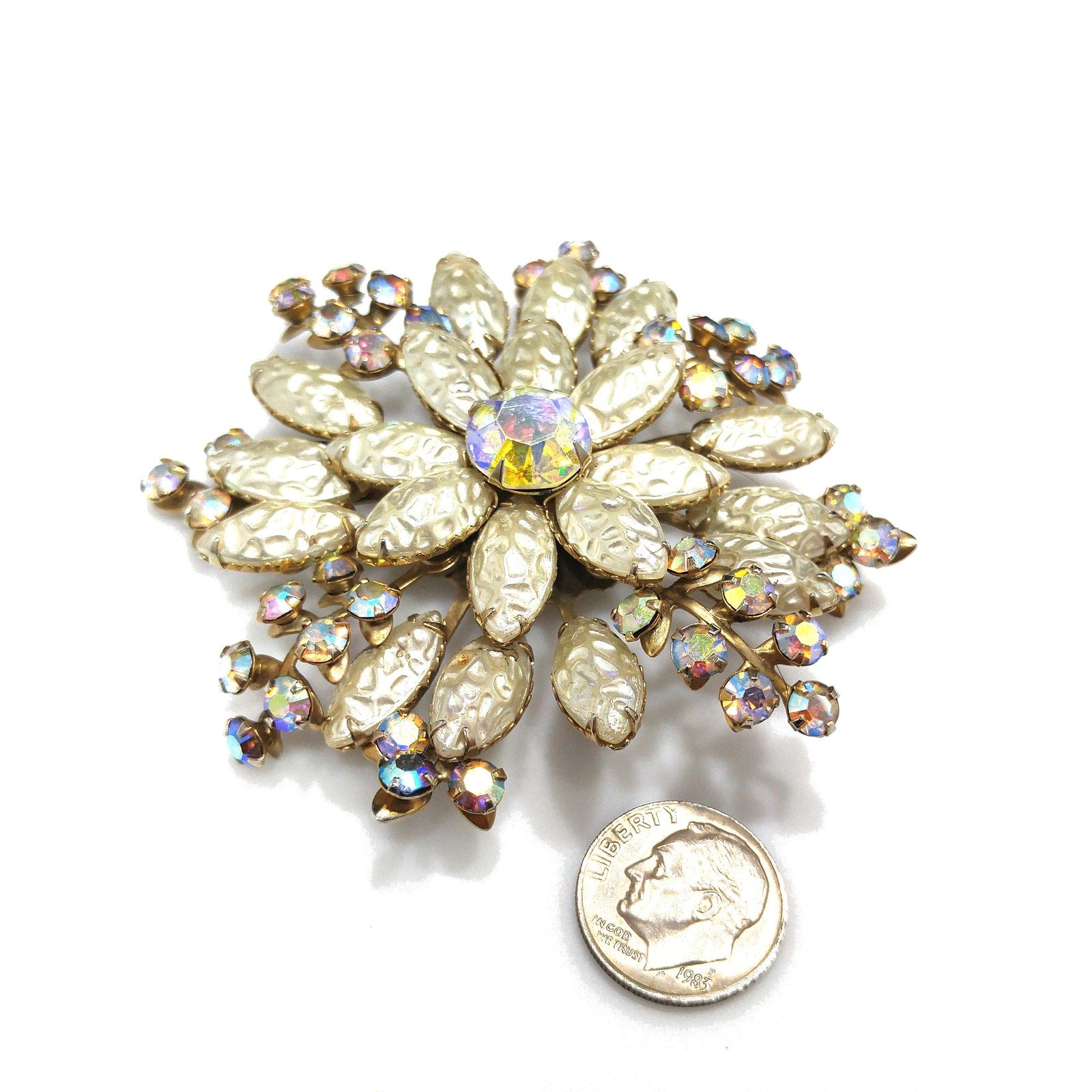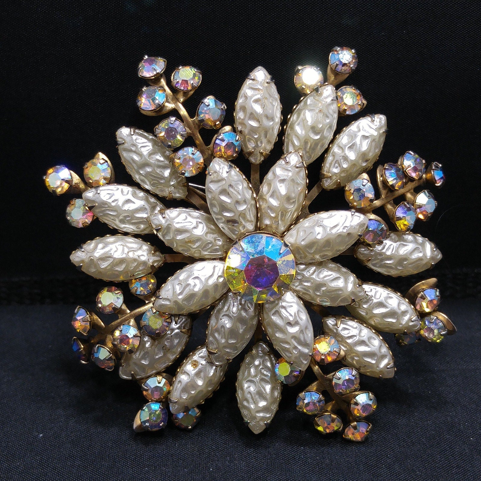 *Description: This beautiful vintage brooch is made with white molded pearled glass, sometimes referred to as lava glass. In addition to the lava glass petals, there are aurora borealis rhinestone leaves mixed throughout. In the center is a beautiful aurora borealis large rhinestone chaton, which has a strong pink glow. This brooch is large at 3 inches across in width and length. This would be a great addition to your vintage jewelry collection or make a great vintage gift!