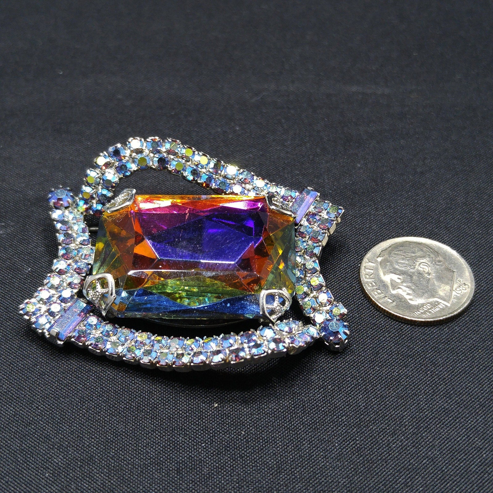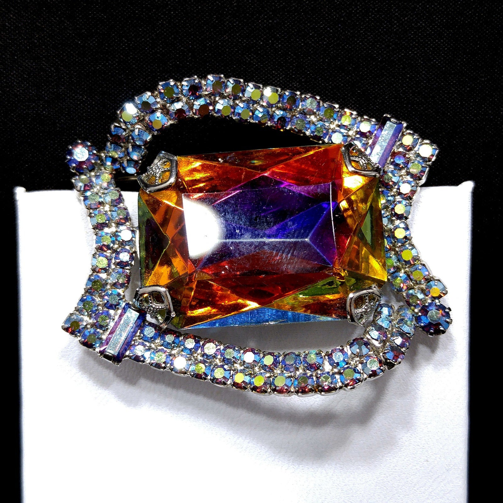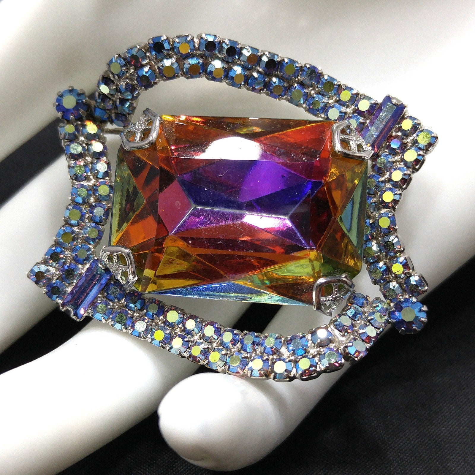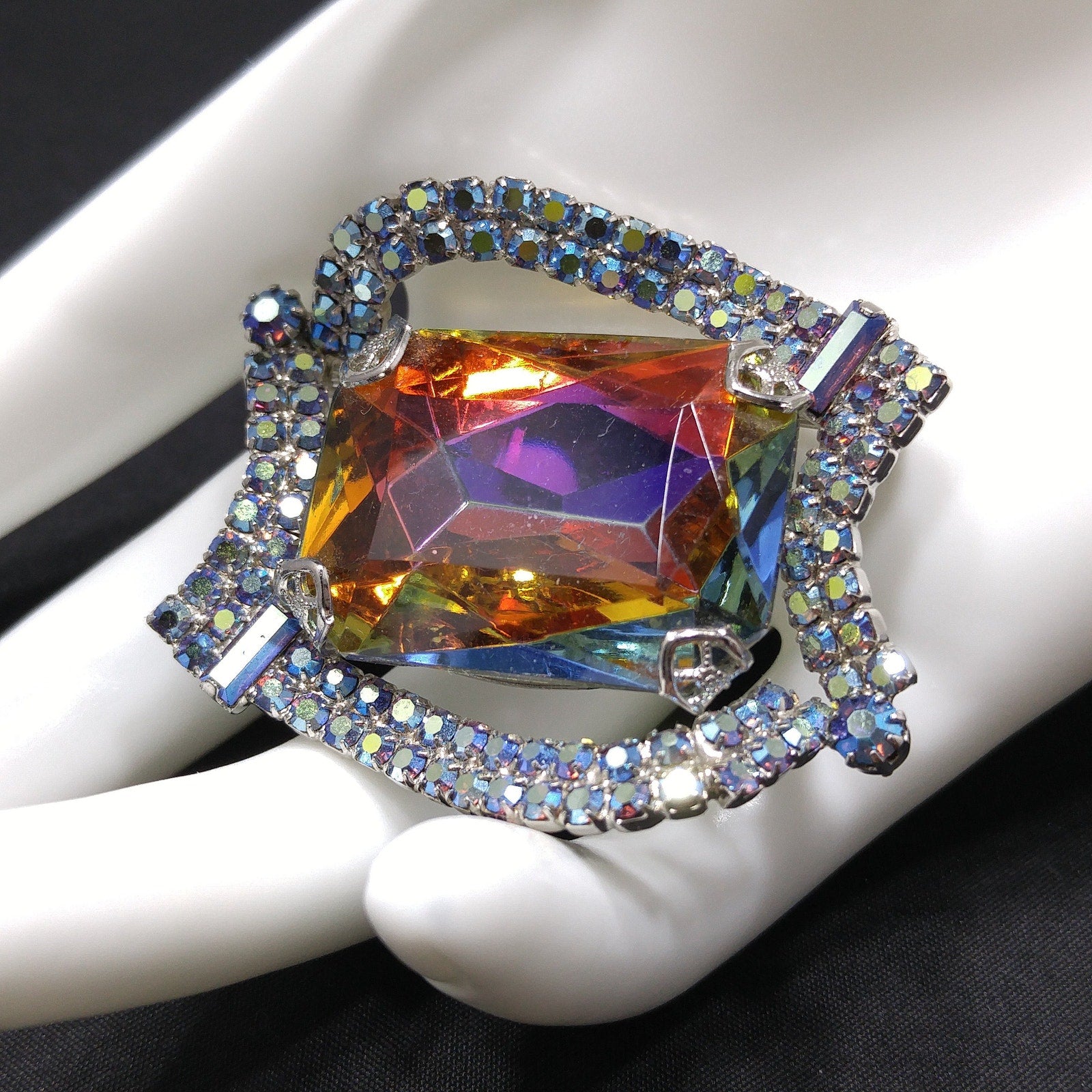 *Description: This is a gorgeous mid-century modern rhinestone brooch from the 1960s. The center stone is watermelon with a silver foil backing. The four sides filled with two rows of aurora borealis blue rhinestones are uneven sides and include an AB blue chaton on two corners and AB blue baguettes in the other two corners. The center glass stone reflects purple, yellow, blue, and green as you move it in the light. All of the beautiful rhinestones are set within a rhodium plated backing. This would be a great addition to your vintage jewelry collection or make a great vintage gift!