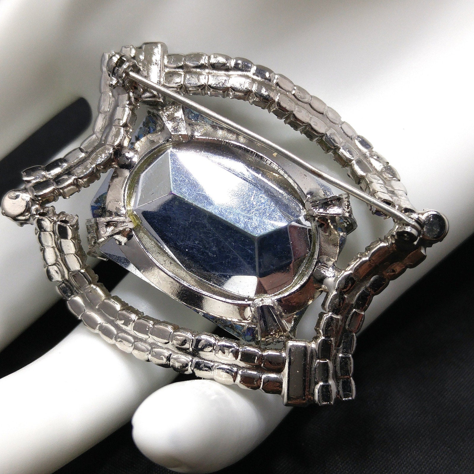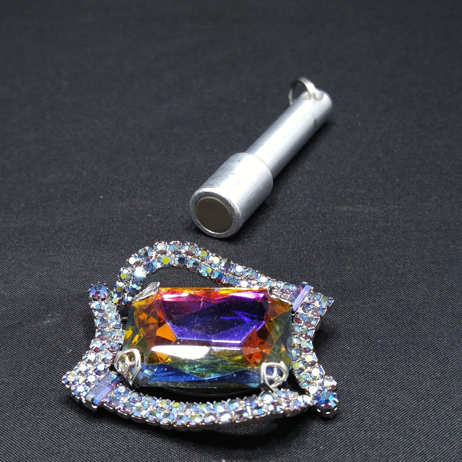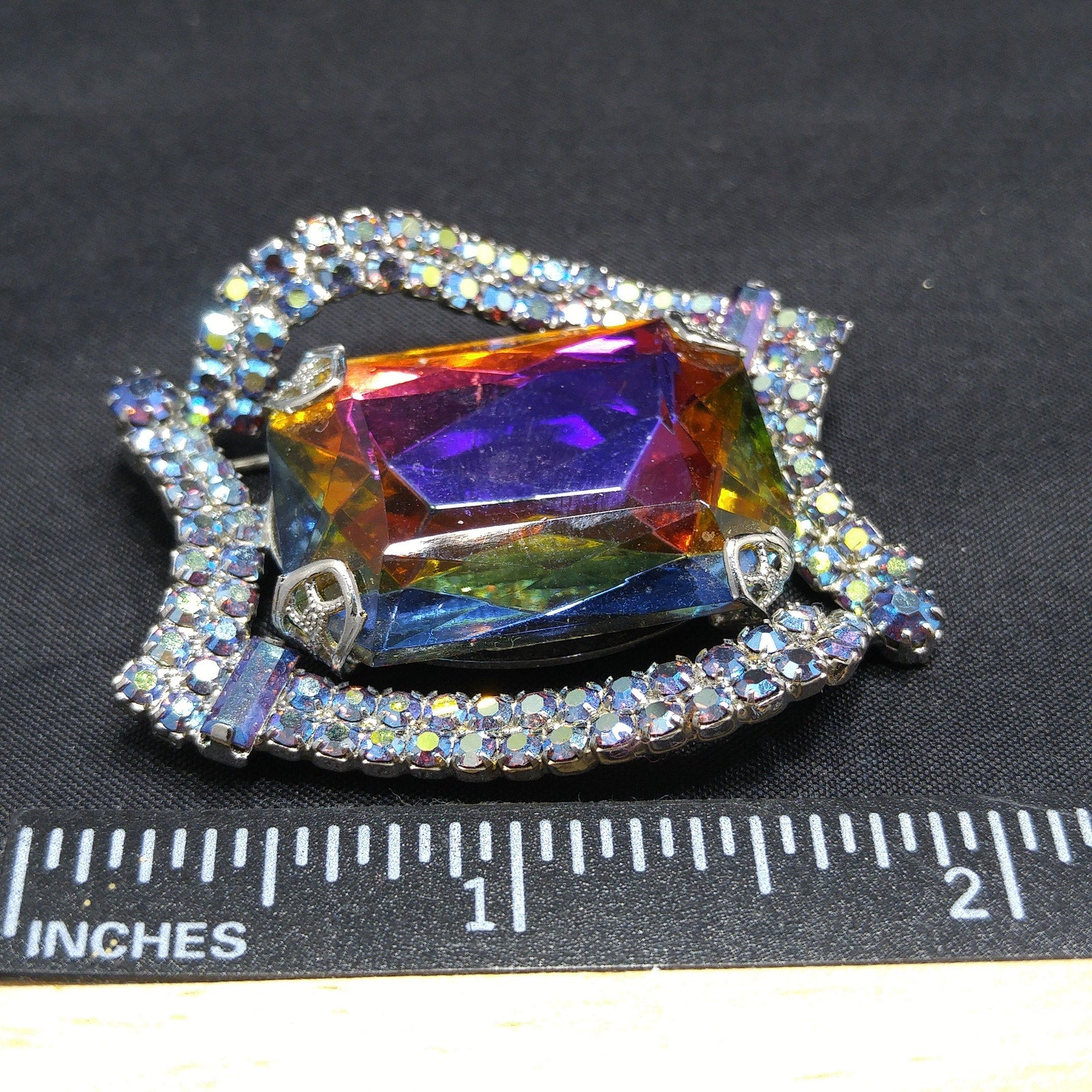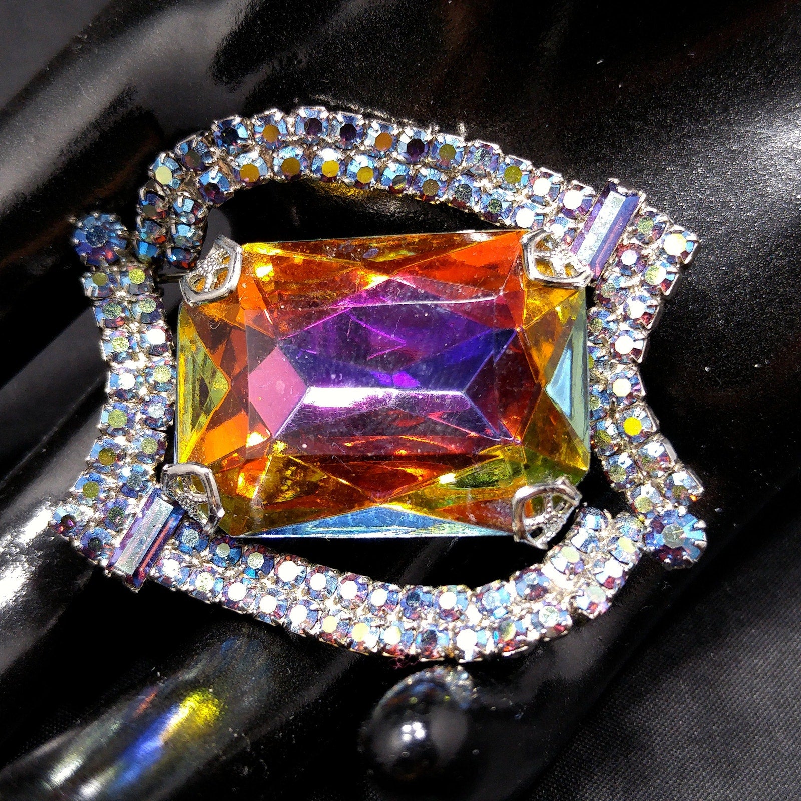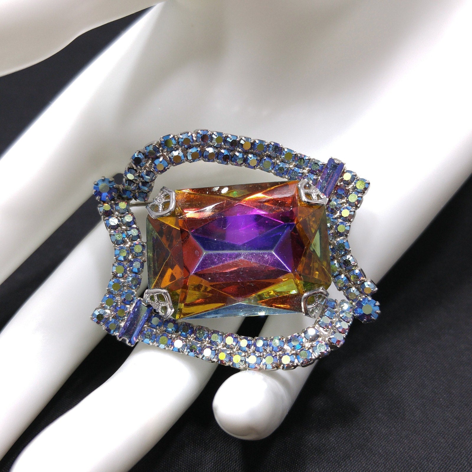 *Description: This is a gorgeous mid-century modern rhinestone brooch from the 1960s. The center stone is watermelon with a silver foil backing. The four sides filled with two rows of aurora borealis blue rhinestones are uneven sides and include an AB blue chaton on two corners and AB blue baguettes in the other two corners. The center glass stone reflects purple, yellow, blue, and green as you move it in the light. All of the beautiful rhinestones are set within a rhodium plated backing. This would be a great addition to your vintage jewelry collection or make a great vintage gift!