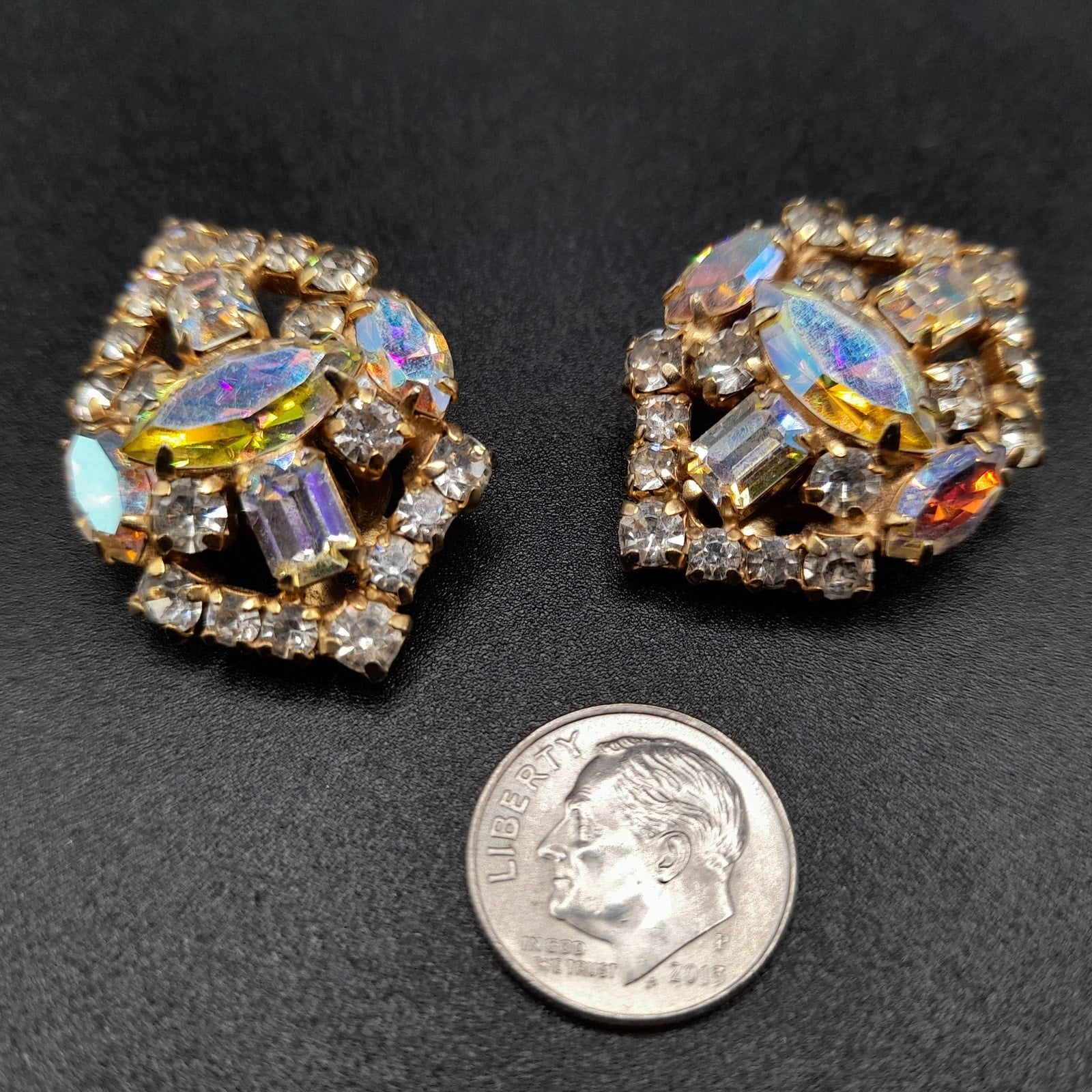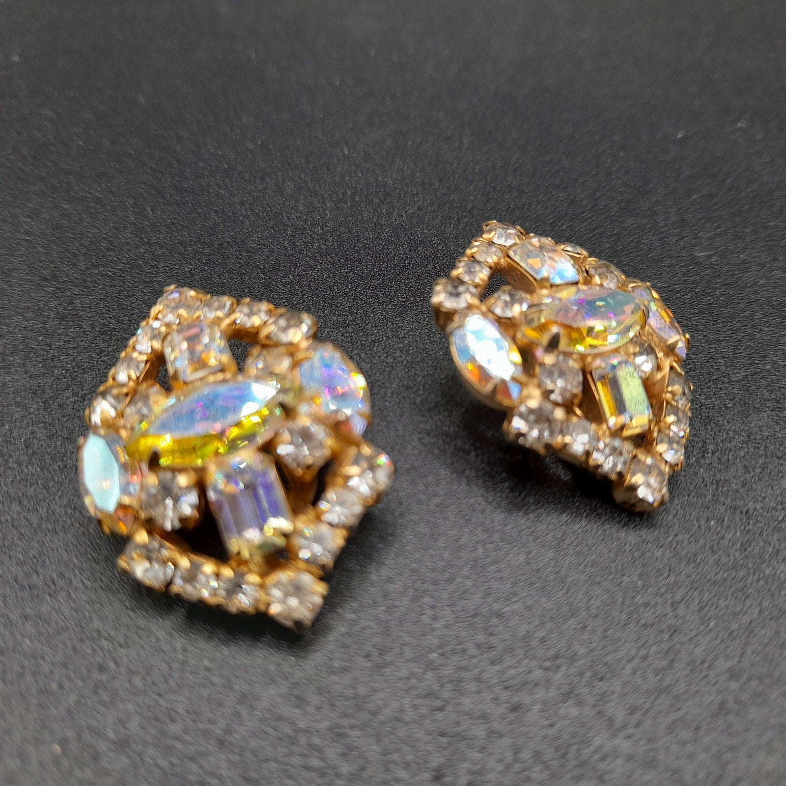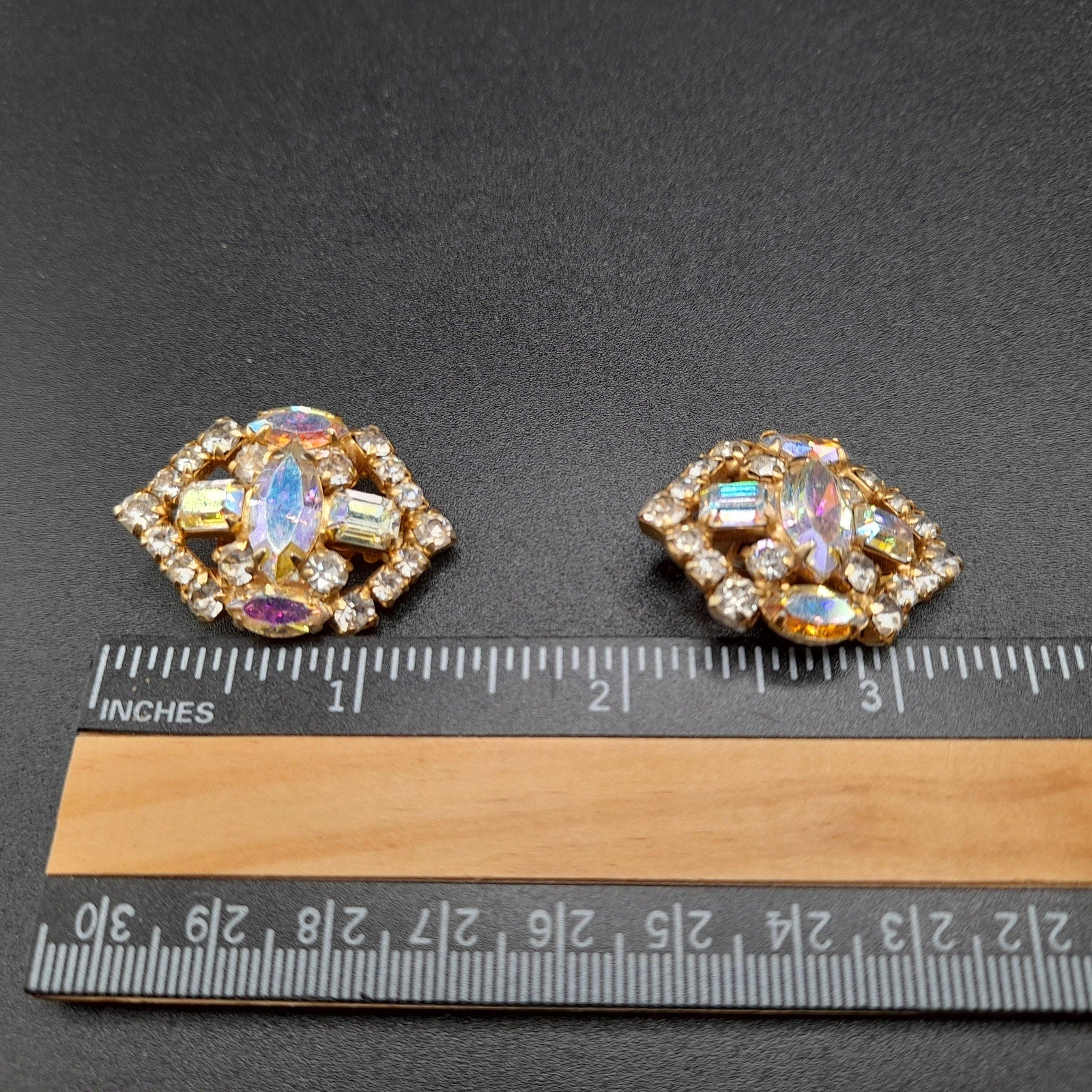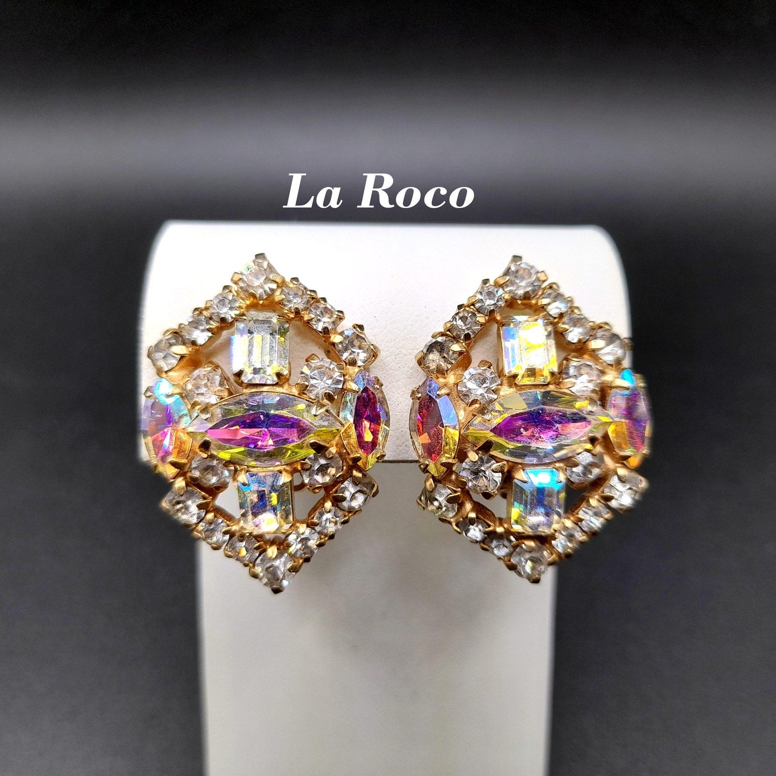 *Description: This is a beautiful designer LaRoco clip on earrings in aurora borealis clear rhinestones cut in a variety of sizes from the late 1950s to 1960s. The earrings are set in gold plated and each rhinestone is prong set in a near diamond shape. You can see they are designer quality with the beautiful crystal rhinestones and unique cuts. This would be a great addition to your vintage jewelry collection or make a great vintage gift!