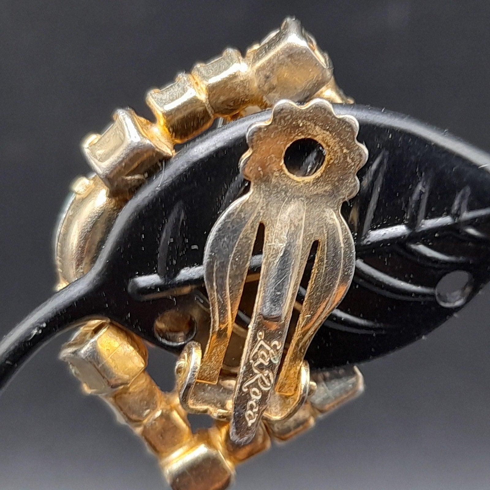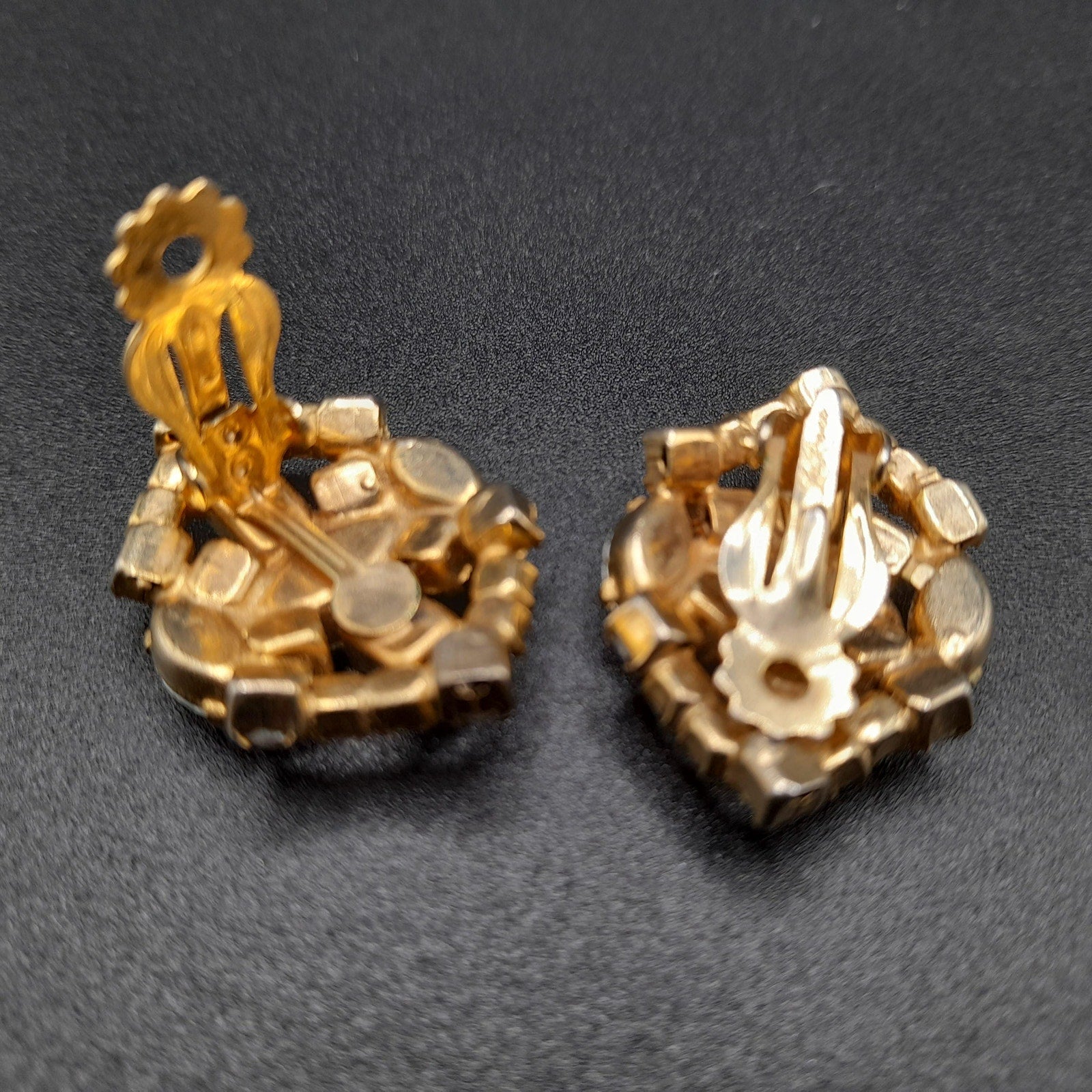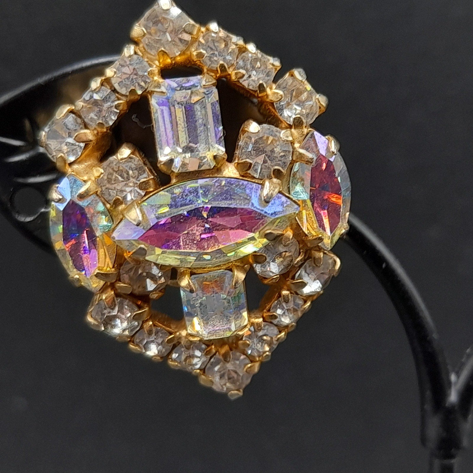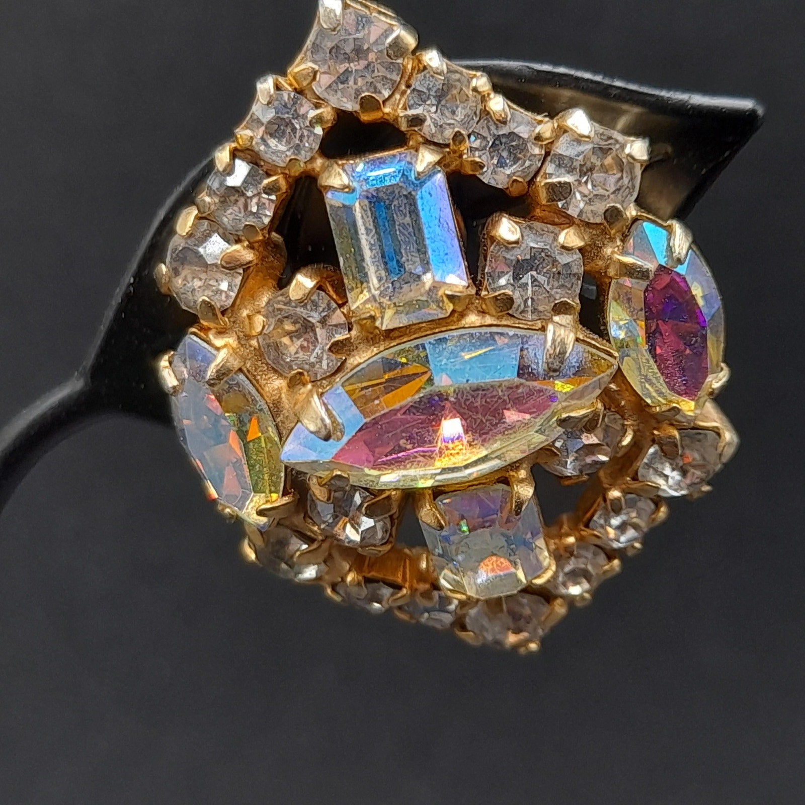 *Description: This is a beautiful designer LaRoco clip on earrings in aurora borealis clear rhinestones cut in a variety of sizes from the late 1950s to 1960s. The earrings are set in gold plated and each rhinestone is prong set in a near diamond shape. You can see they are designer quality with the beautiful crystal rhinestones and unique cuts. This would be a great addition to your vintage jewelry collection or make a great vintage gift!