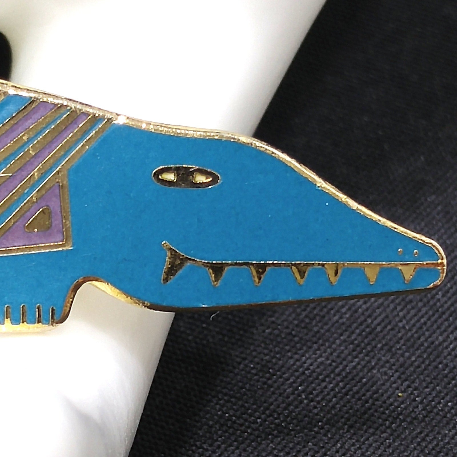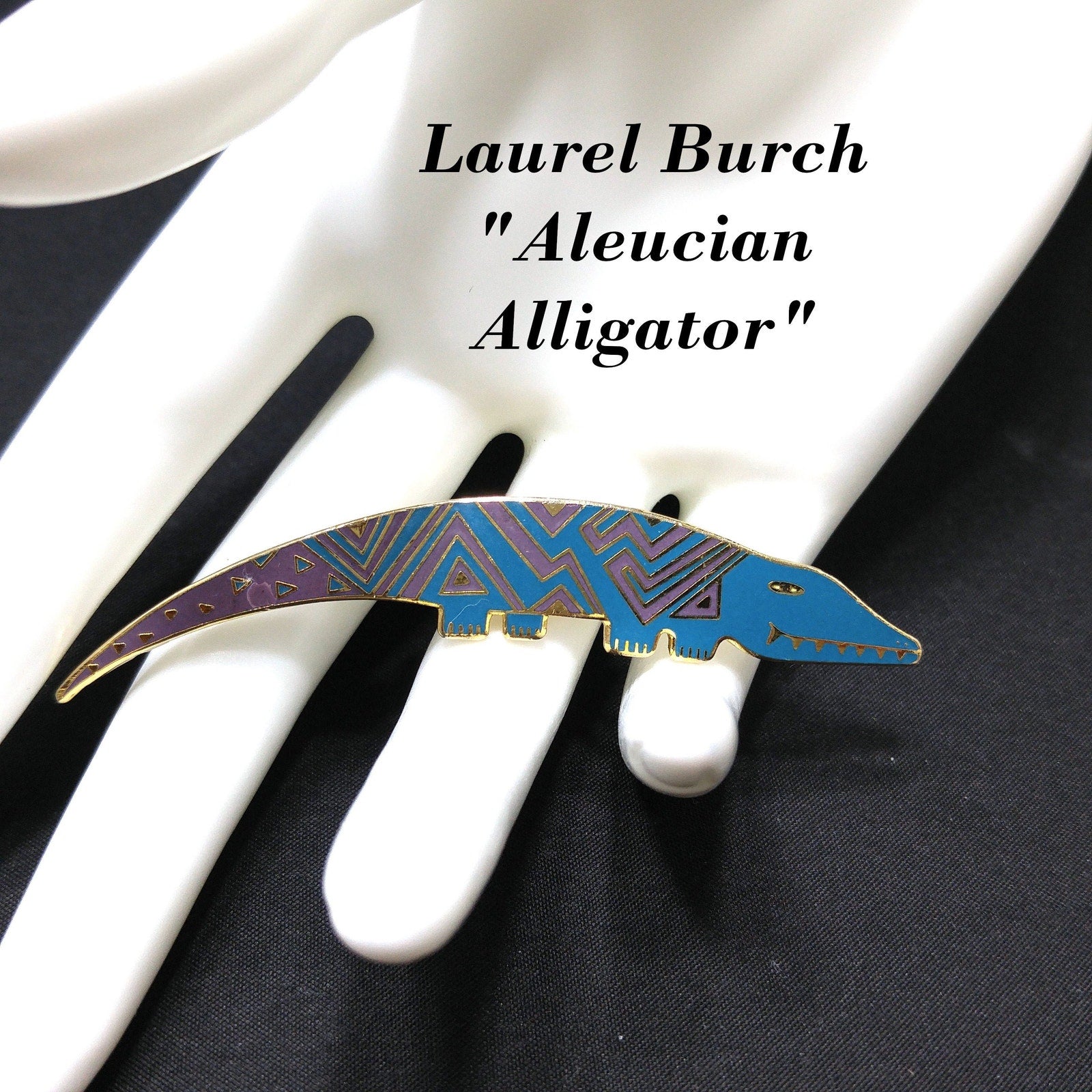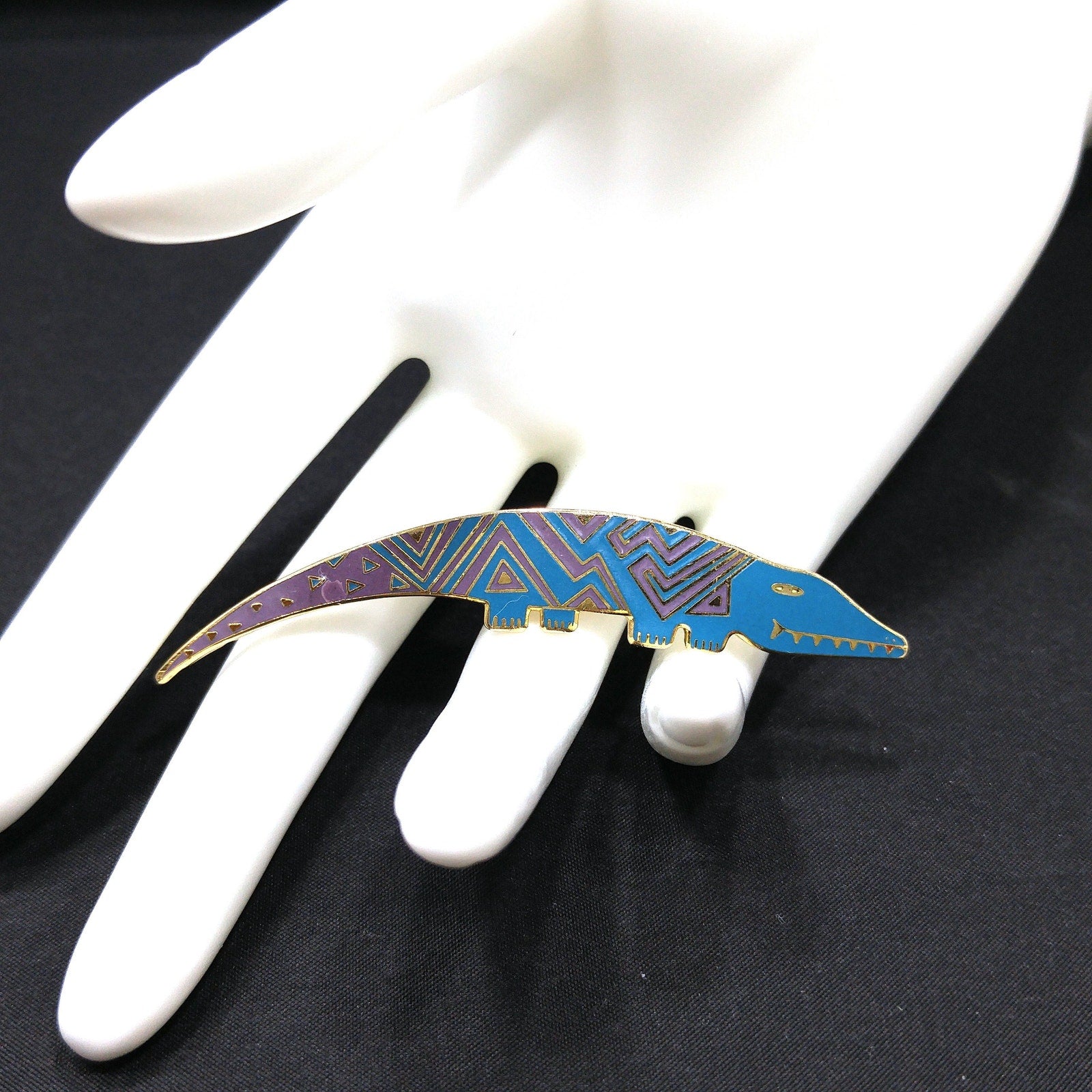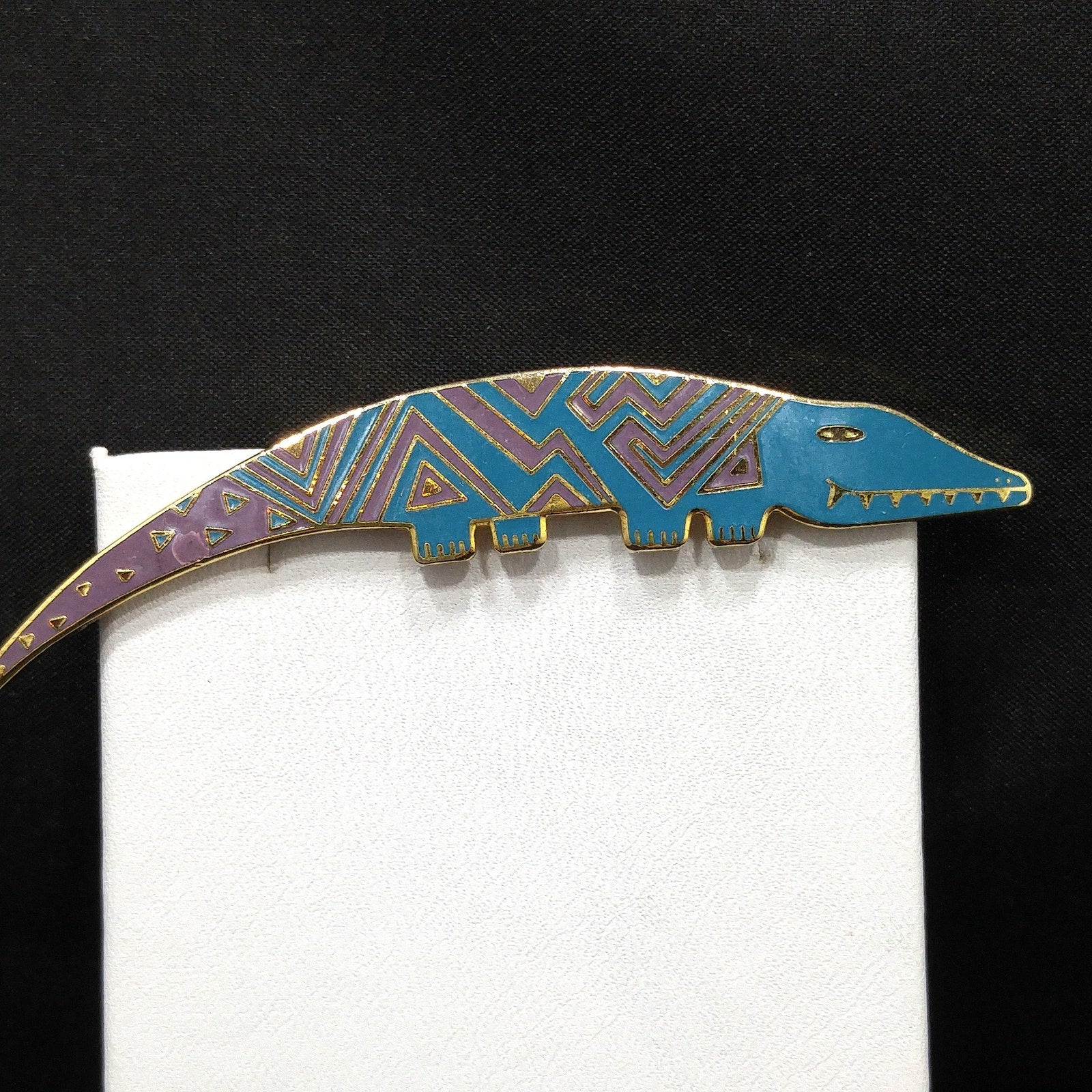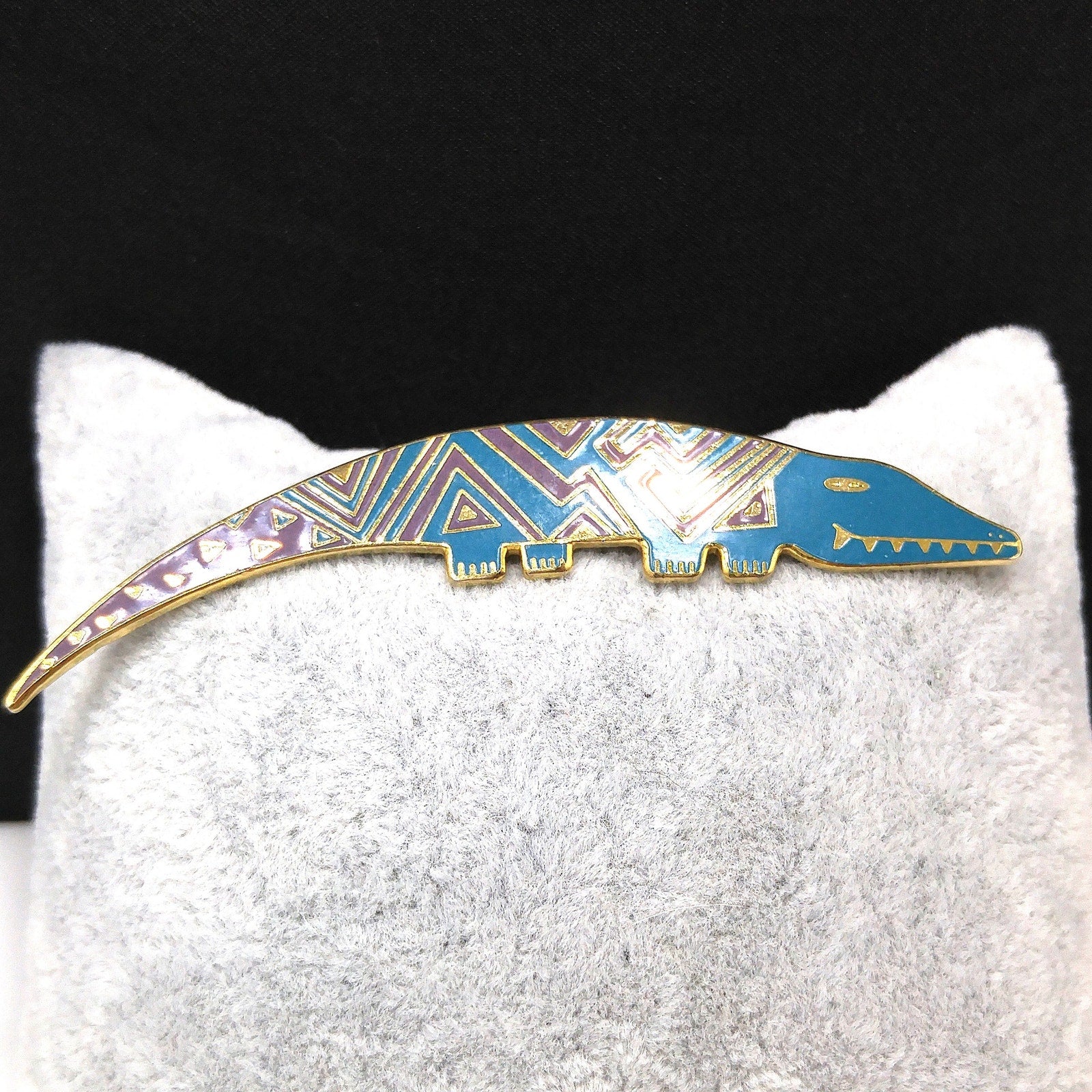*Description: This is a great Laurel Burch "Aleucian Alligator" brooch in blue and purple enamel with gold plated cloisonné outlines and backing from the 1980s. The alligator has a toothy grin and would be great for any jacket, top, hat, or bag. This would be a great addition to your vintage jewelry collection or make a great vintage gift!
