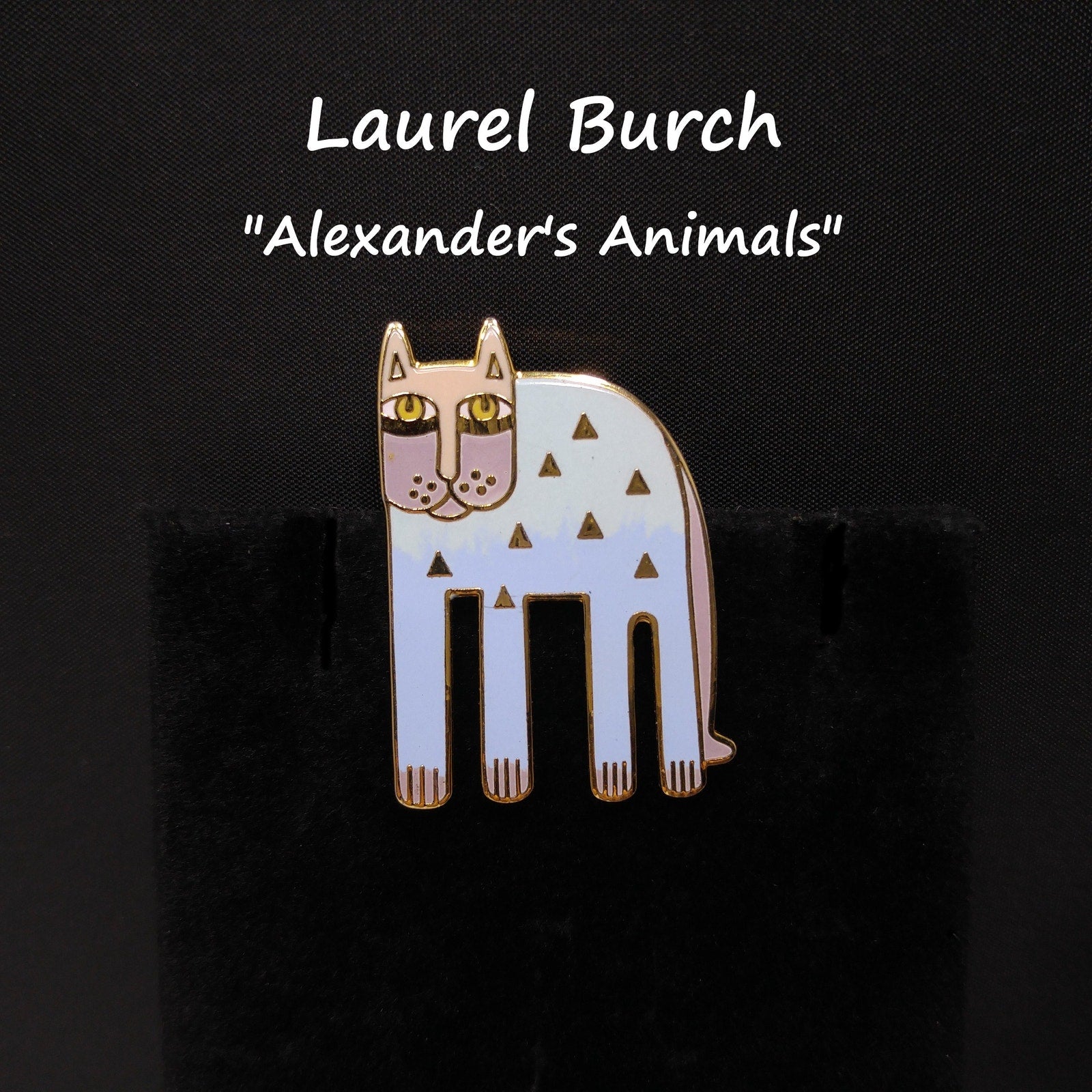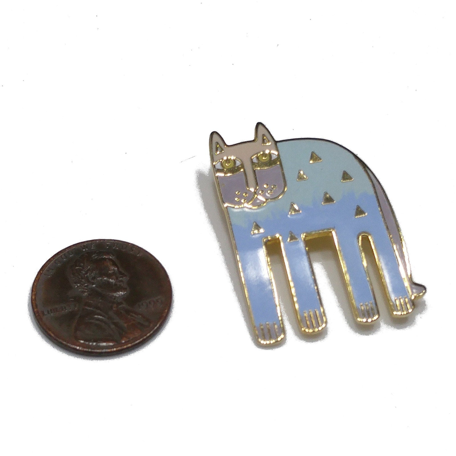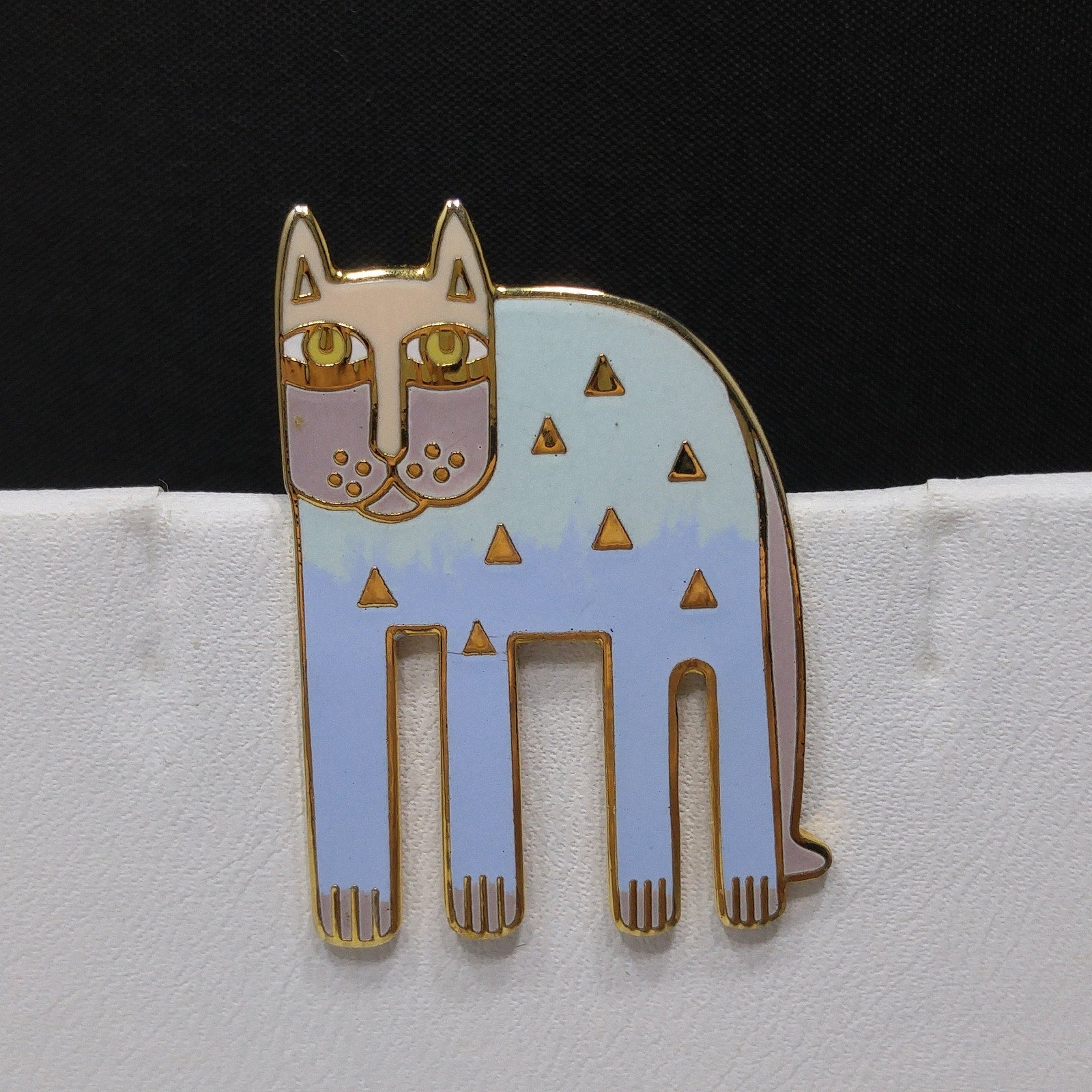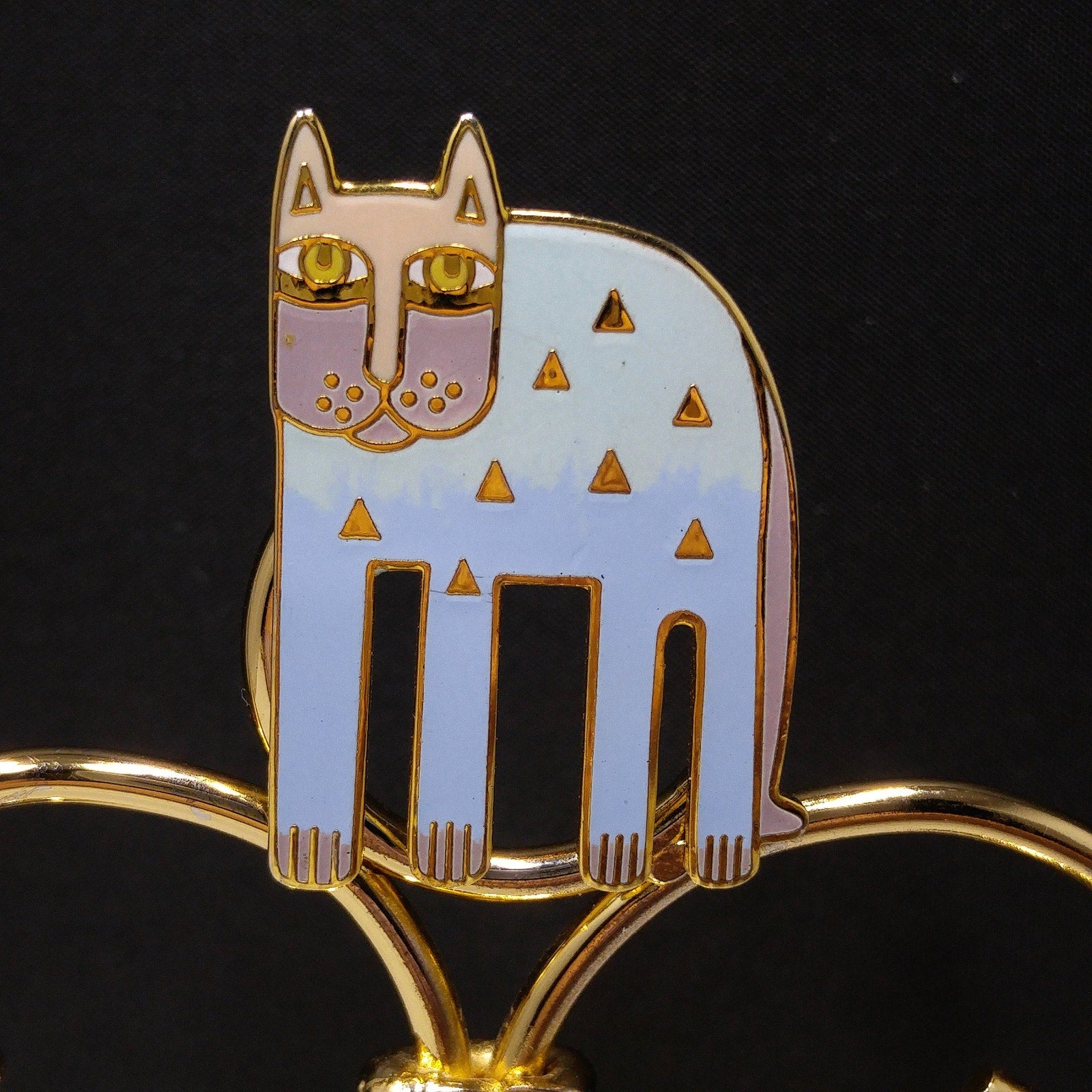 *Description: This is a beautiful cat brooch by Laurel Burch entitled "Alexander's Animal" with pastel enamel colors and gold plating from the 1980s. The cat is a soft blue on top of its back which fades into a lavender-blue with tiny gold triangles scattered on its back. Its face has a soft pink around the ears and a light purple around its mouth. The cloisonné is in gold plating and outlines all of the enamel areas. This particular color combination is gorgeous together. This would be a great addition to your vintage jewelry collection or make a great vintage gift!
