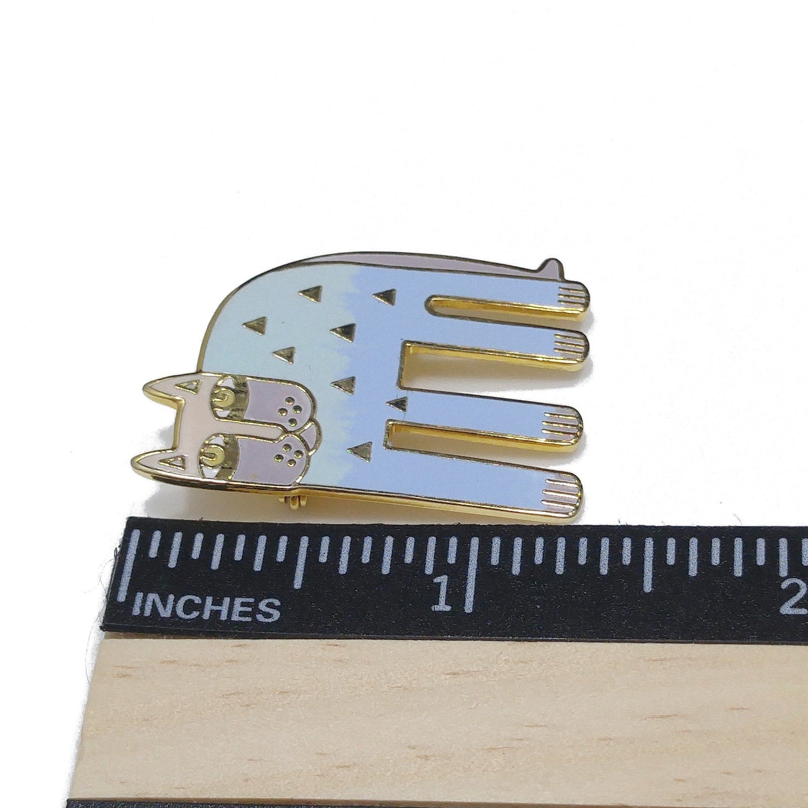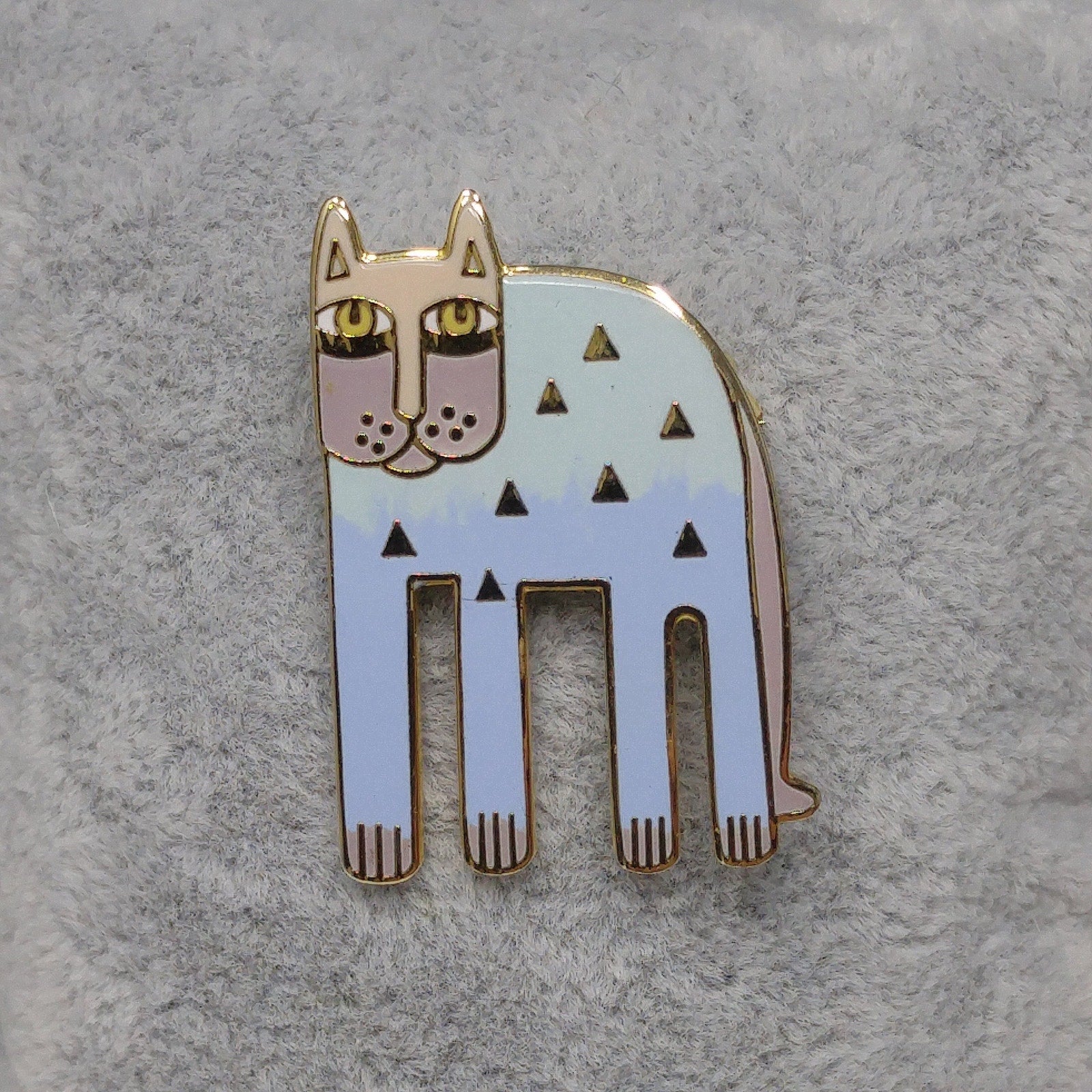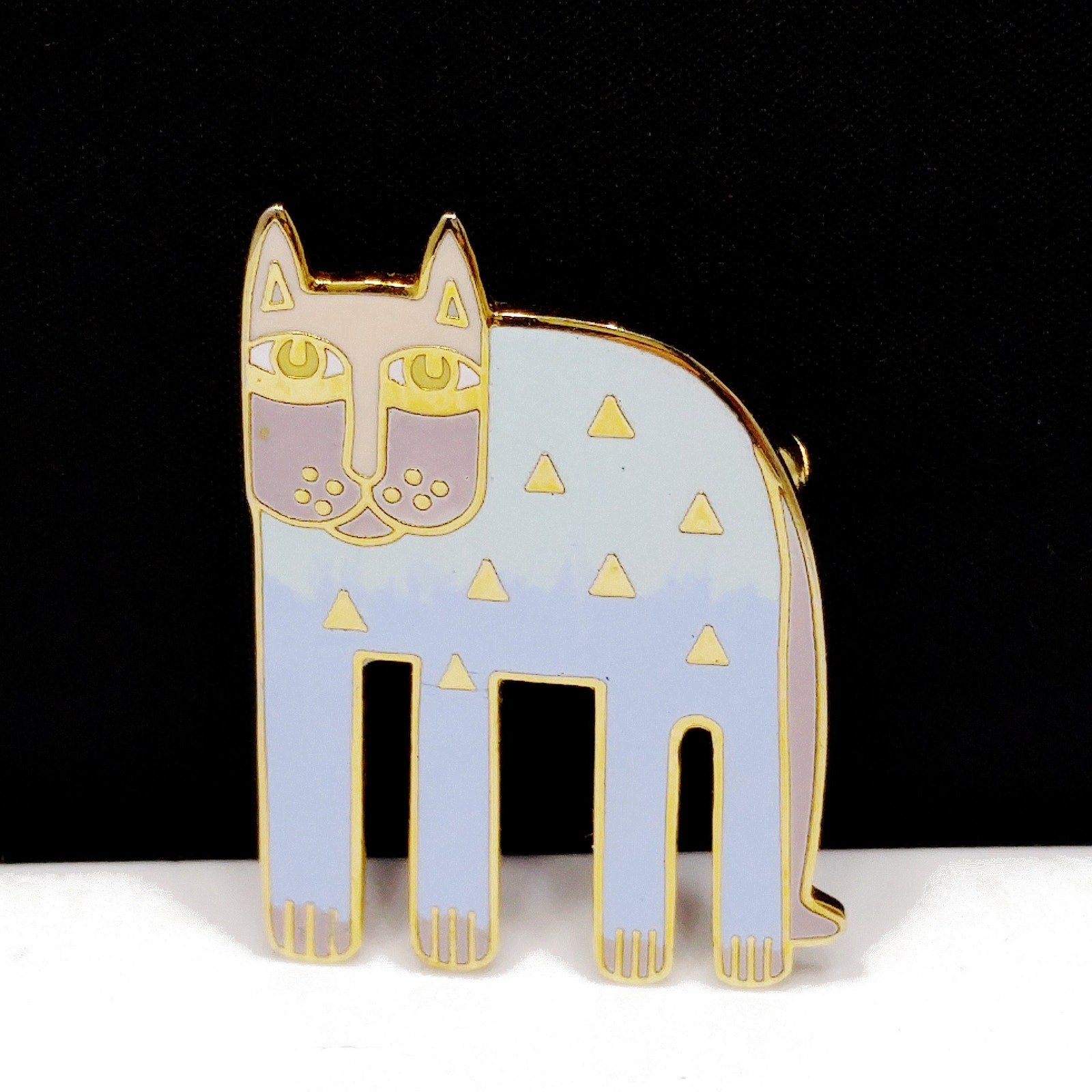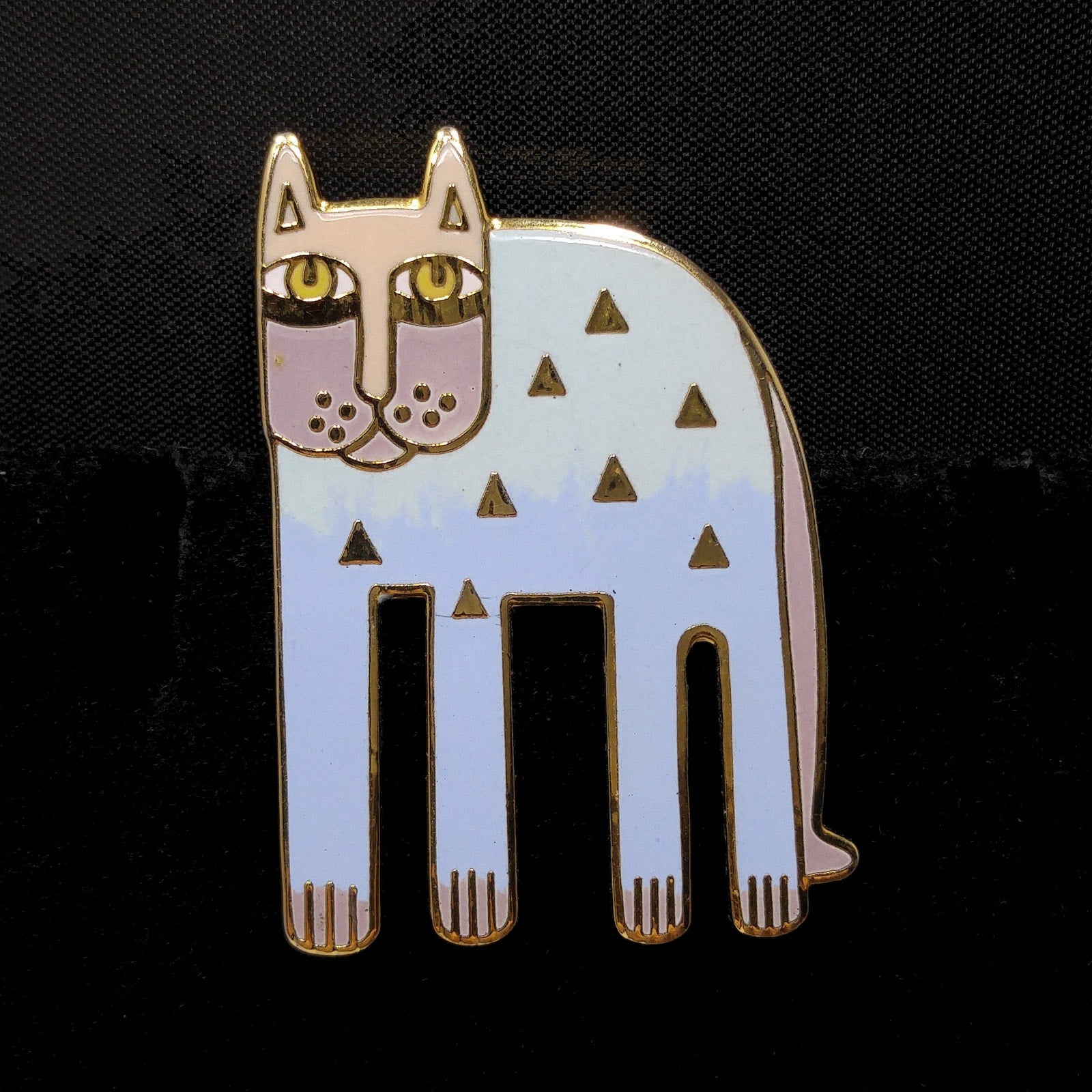 *Description: This is a beautiful cat brooch by Laurel Burch entitled "Alexander's Animal" with pastel enamel colors and gold plating from the 1980s. The cat is a soft blue on top of its back which fades into a lavender-blue with tiny gold triangles scattered on its back. Its face has a soft pink around the ears and a light purple around its mouth. The cloisonné is in gold plating and outlines all of the enamel areas. This particular color combination is gorgeous together. This would be a great addition to your vintage jewelry collection or make a great vintage gift!