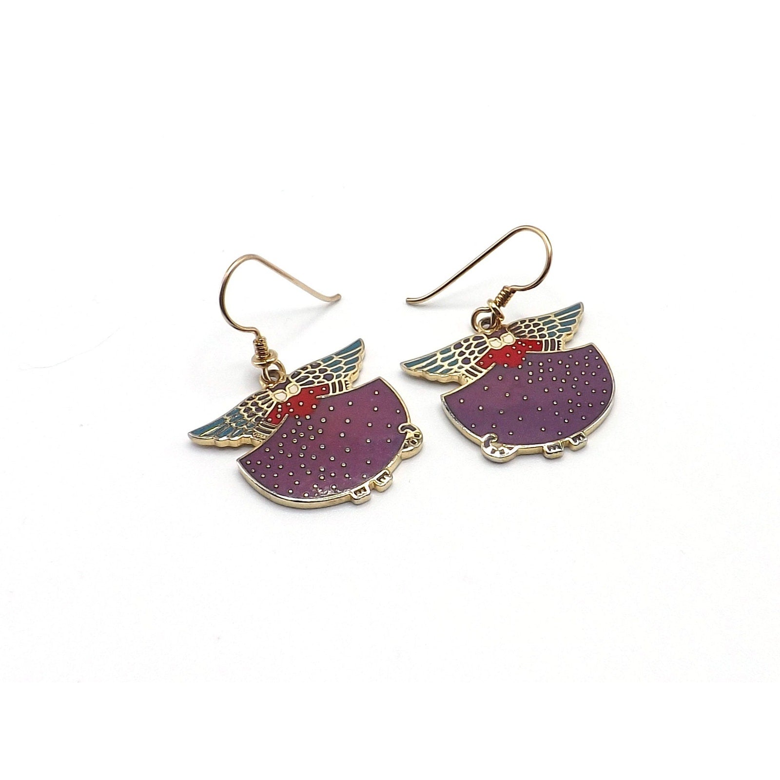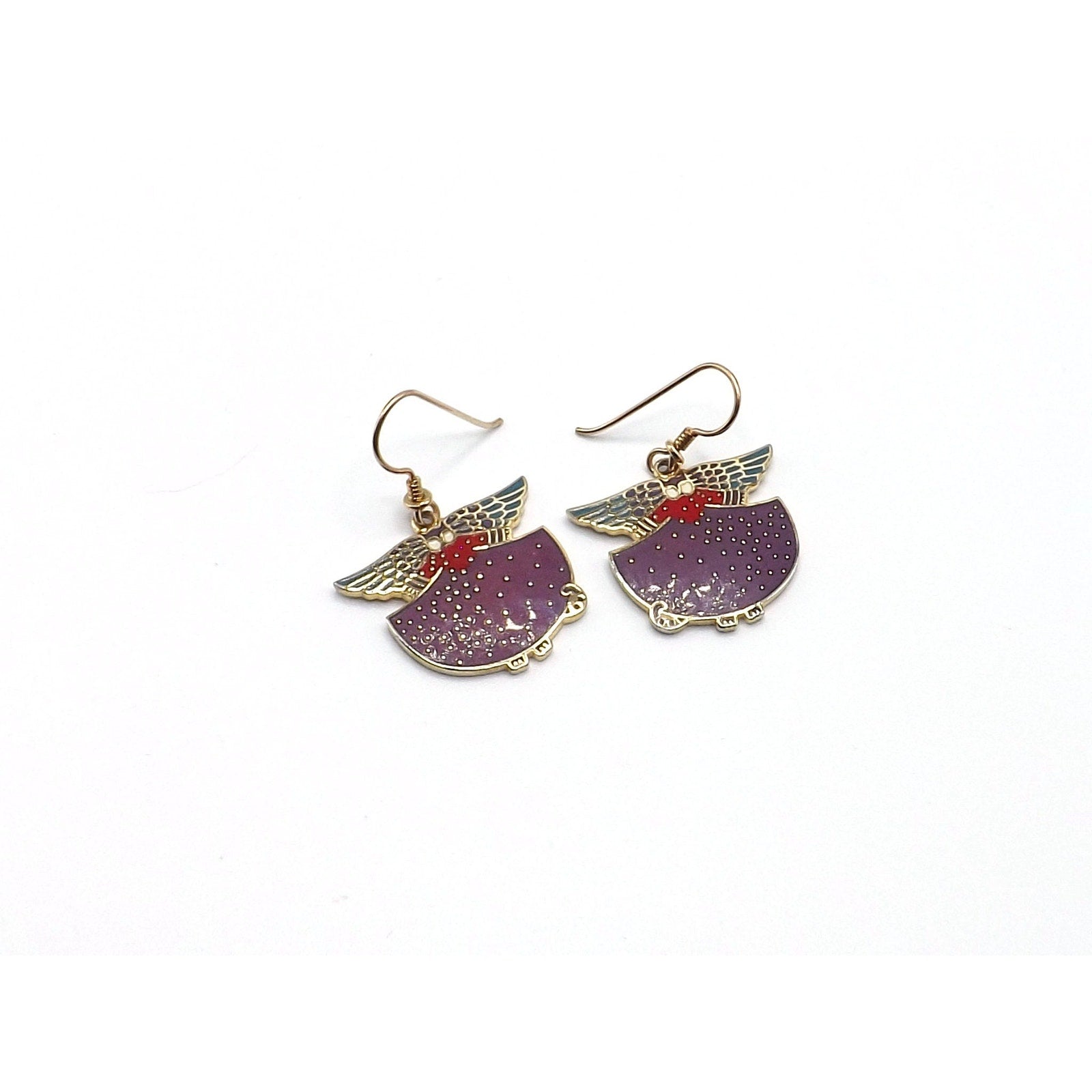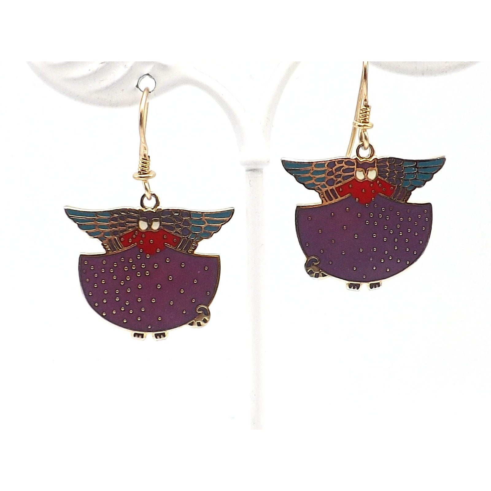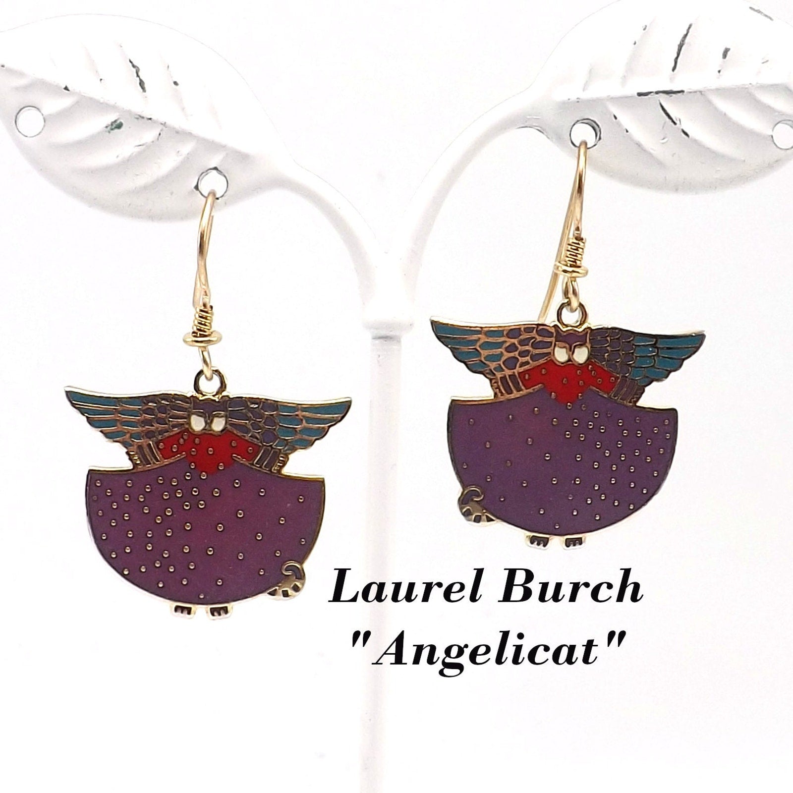 *Description: This is a beautiful pair of Laurel Burch "Angelicat" cat earrings from the 1980s. The earrings are cats with angel wings in purple, teal, red, and white enamel with a gold plated cloisonne outline and backing. The ear wires are gold filled. Both the designer and design name is signed on the back of each earring. They would be a great pair of earring for a cat or animal lover.