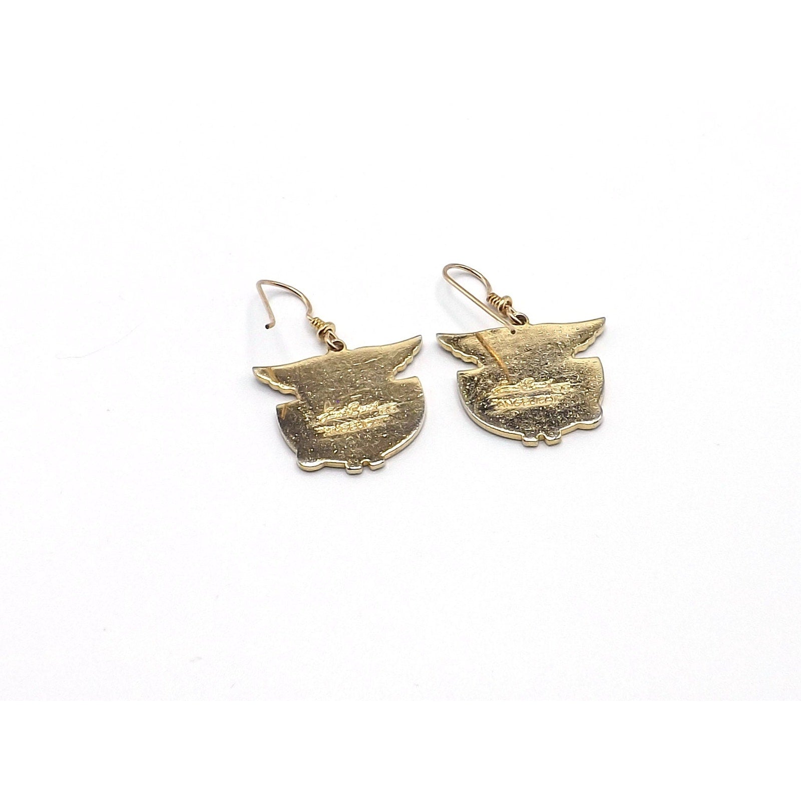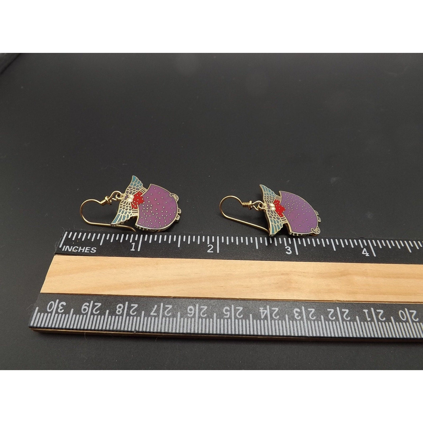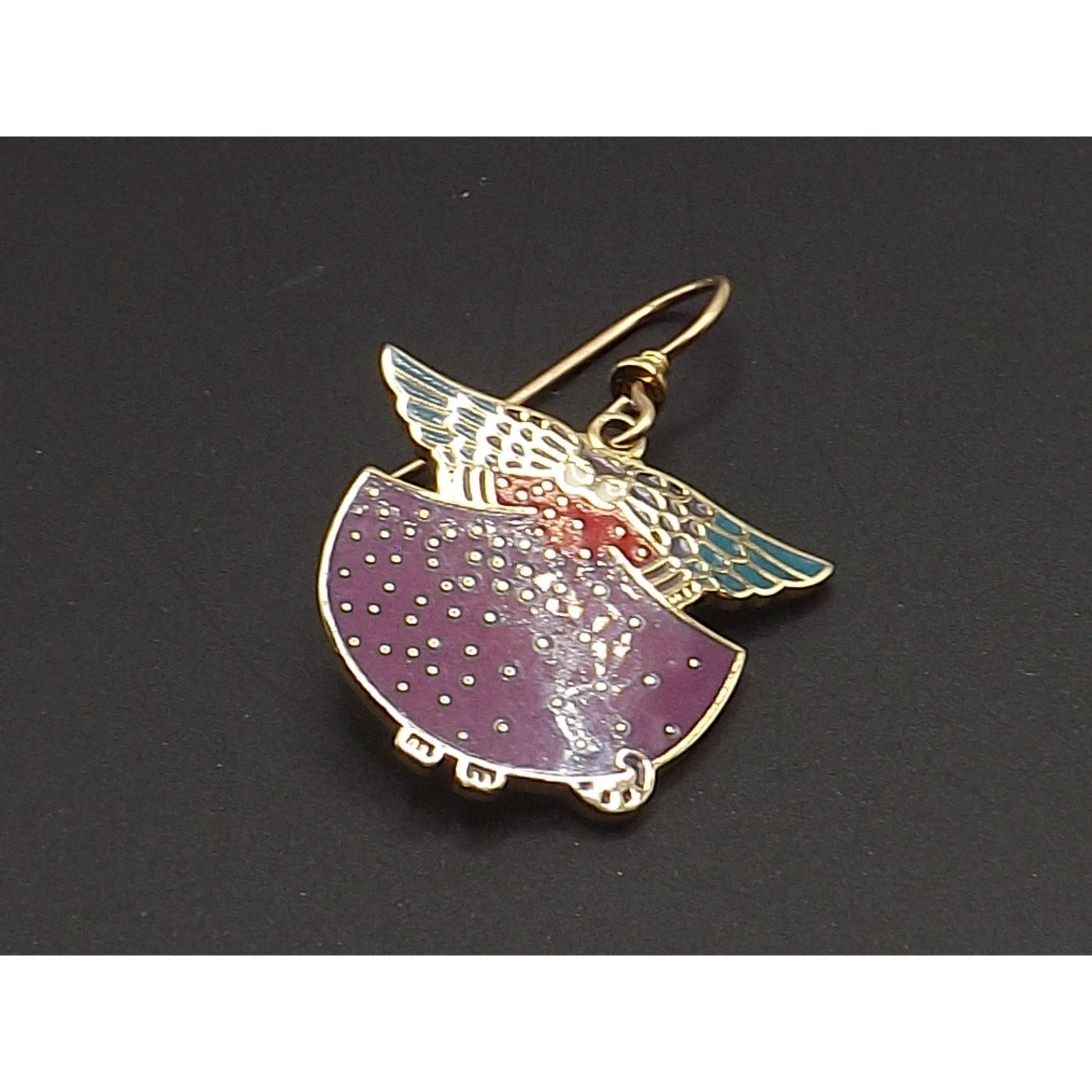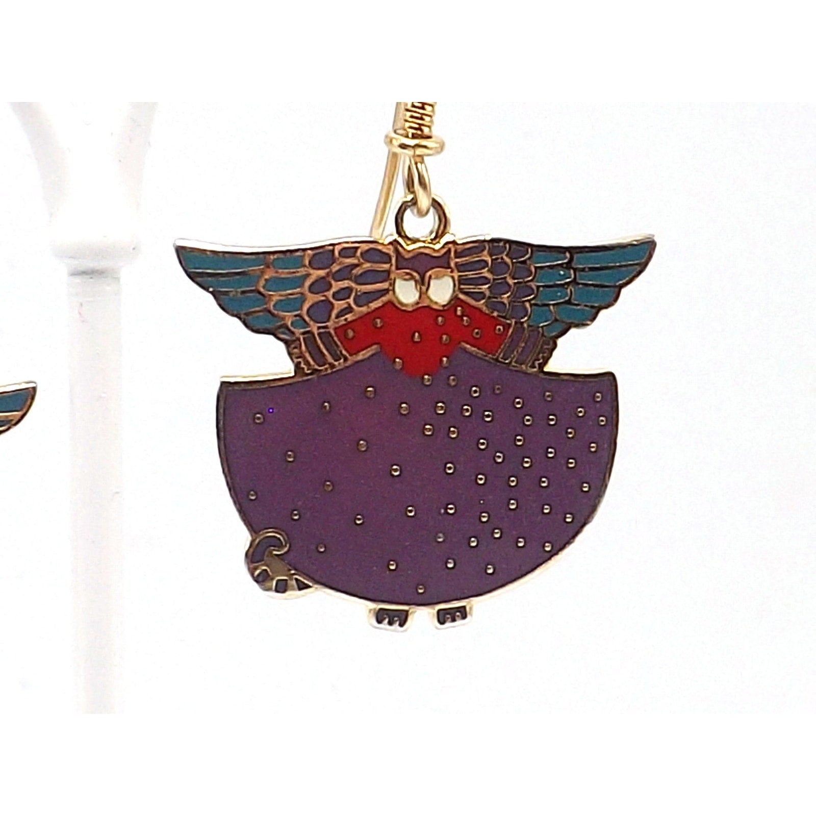 *Description: This is a beautiful pair of Laurel Burch "Angelicat" cat earrings from the 1980s. The earrings are cats with angel wings in purple, teal, red, and white enamel with a gold plated cloisonne outline and backing. The ear wires are gold filled. Both the designer and design name is signed on the back of each earring. They would be a great pair of earring for a cat or animal lover.