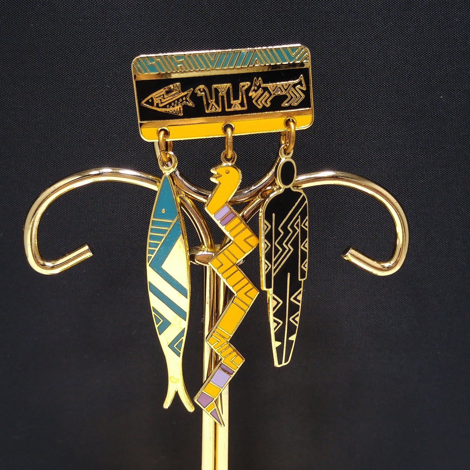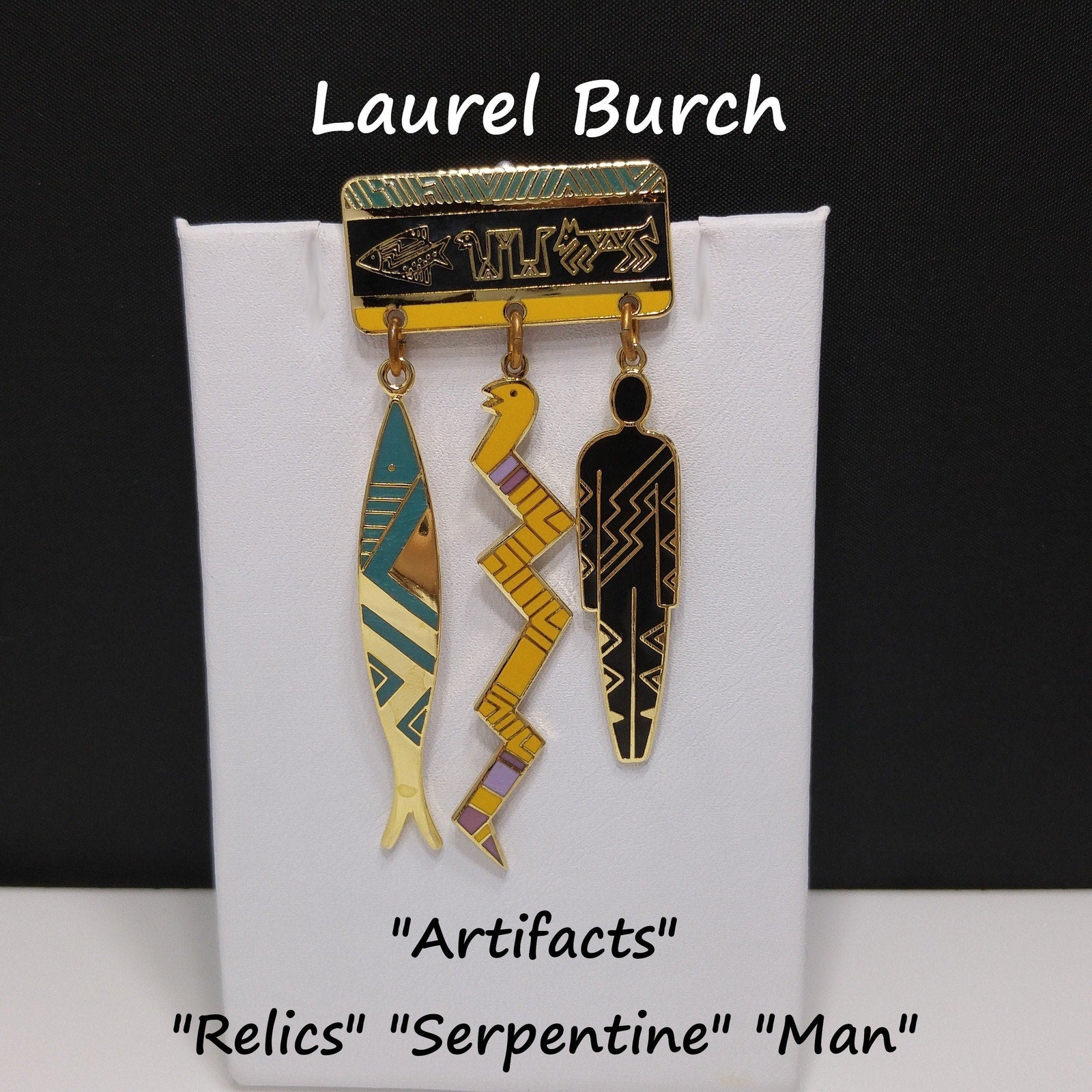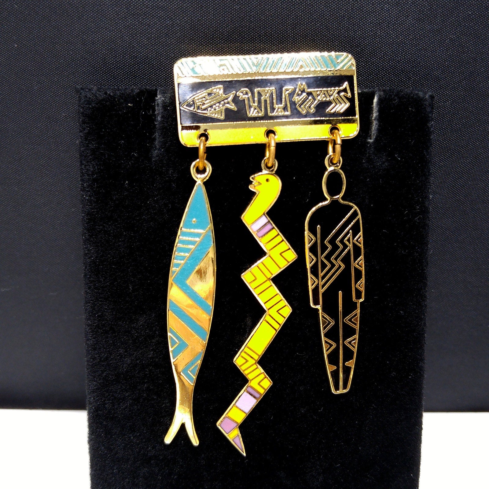 *Description: This is a great vintage brooch by Laurel Burch entitled "Artifacts" from the 1980s. The rectangular cloisonné and enamel brooch has three dangling items: a fish, a snake, and a man. The fish is signed "Relics", the snake is signed "Serpentine" and the man is signed "Man". Each individual dangle is beautifully designed with colorful enamel; all different and unique. On the rectangular top portion, there are hieroglyphics of a fish, snake and dog or wolf. The brooch looks beautiful and would be a great addition to your vintage jewelry collection or make a great vintage gift!