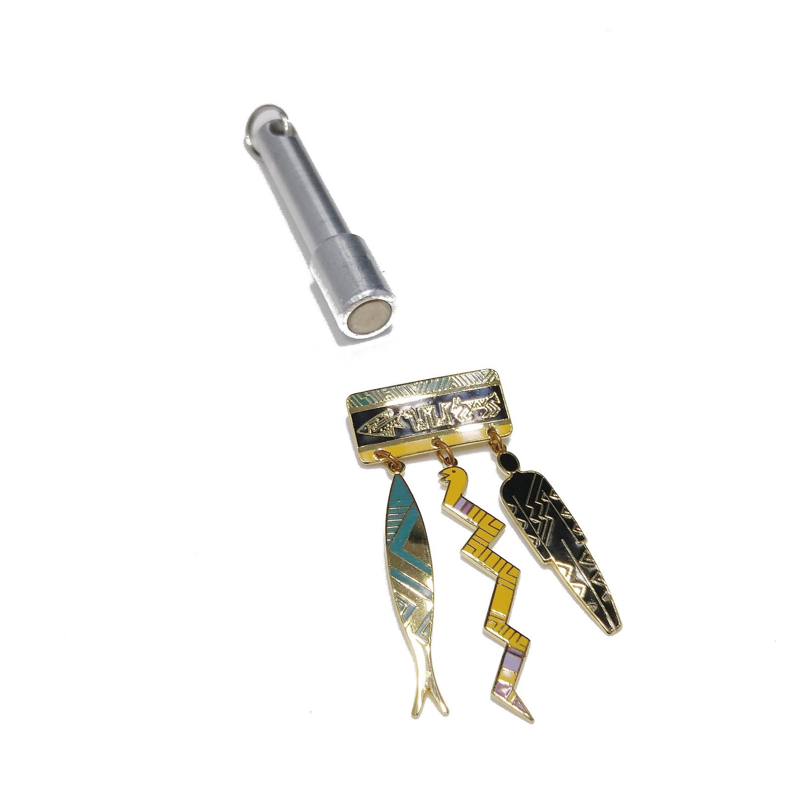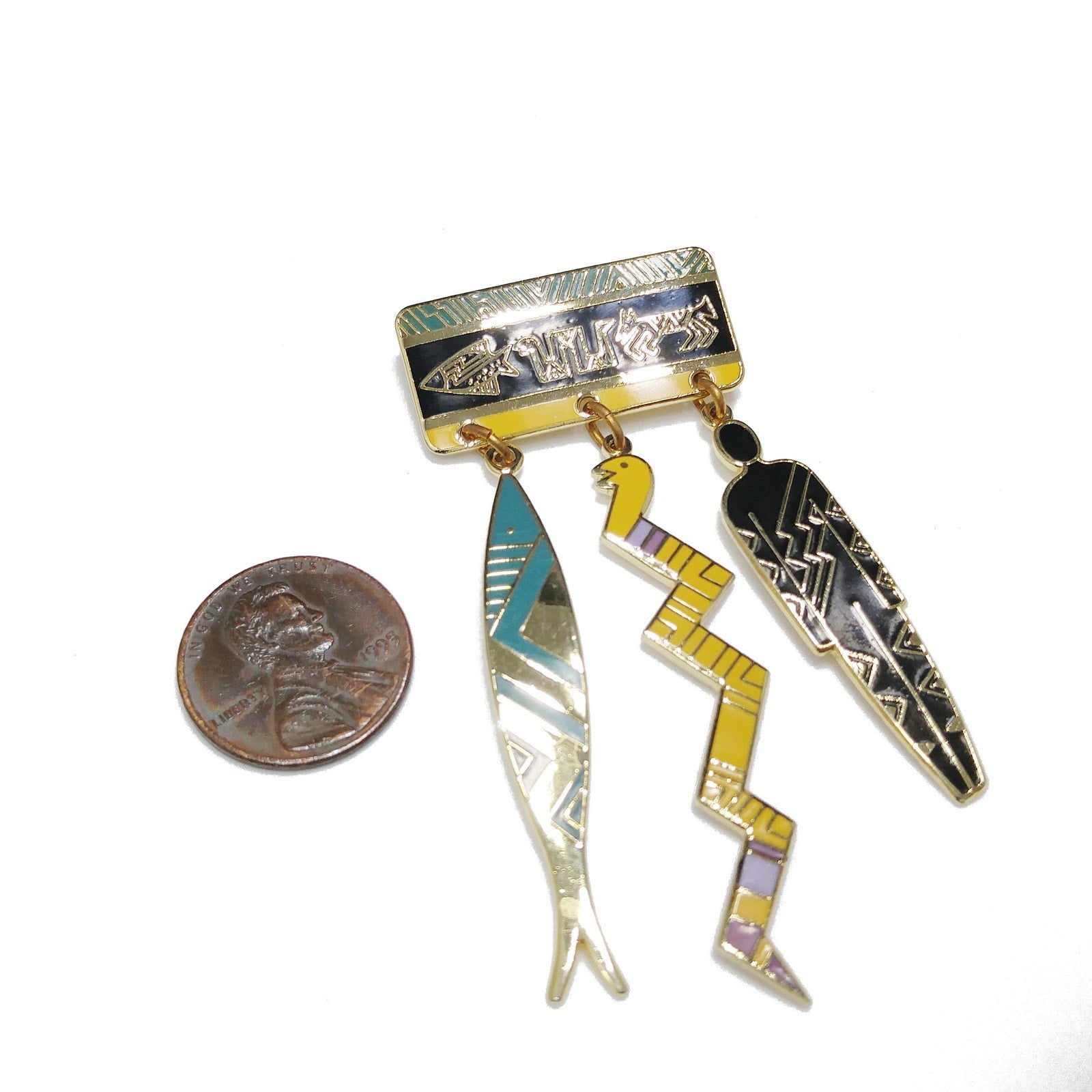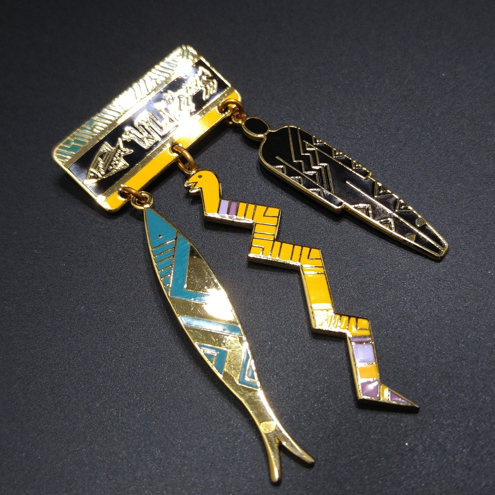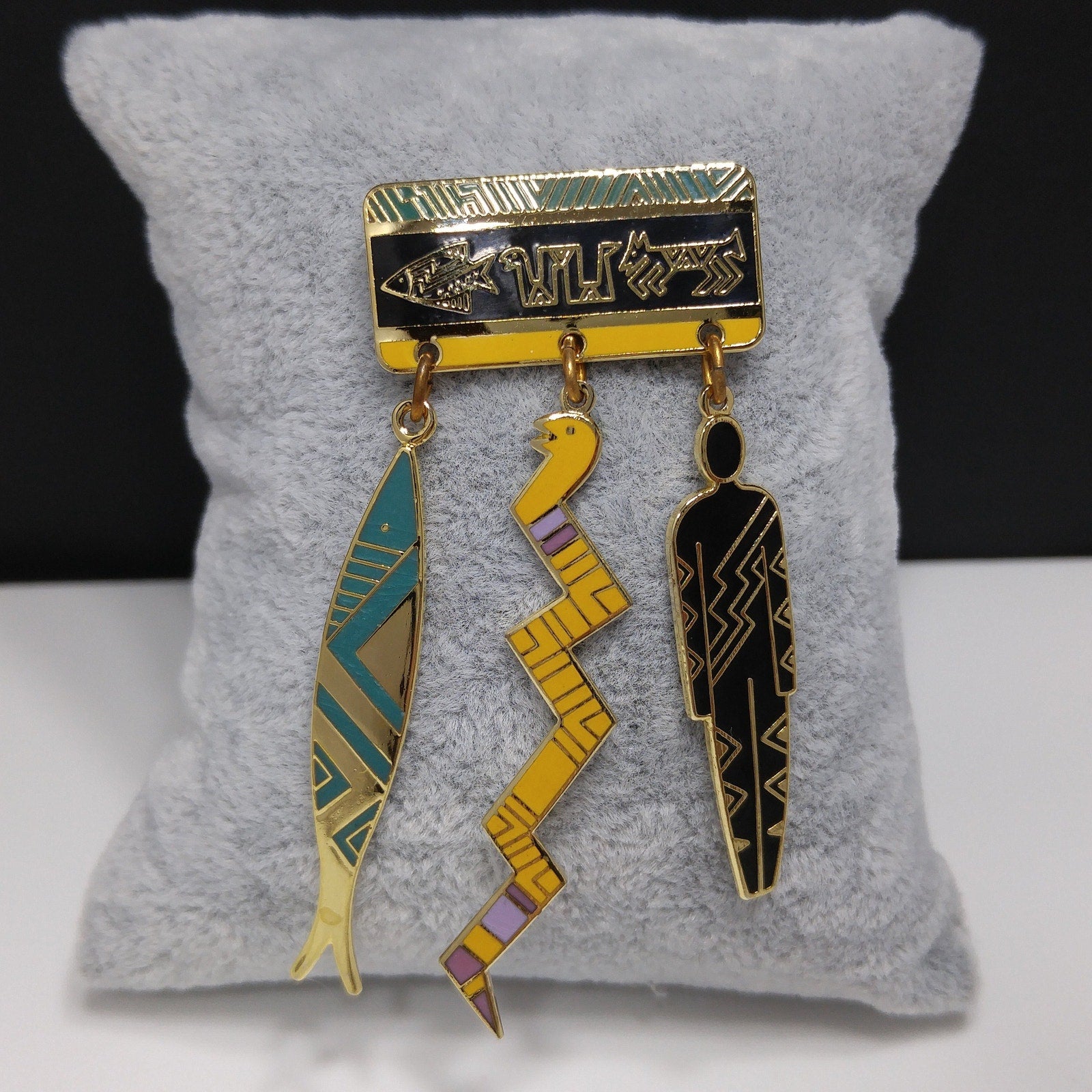 *Description: This is a great vintage brooch by Laurel Burch entitled "Artifacts" from the 1980s. The rectangular cloisonné and enamel brooch has three dangling items: a fish, a snake, and a man. The fish is signed "Relics", the snake is signed "Serpentine" and the man is signed "Man". Each individual dangle is beautifully designed with colorful enamel; all different and unique. On the rectangular top portion, there are hieroglyphics of a fish, snake and dog or wolf. The brooch looks beautiful and would be a great addition to your vintage jewelry collection or make a great vintage gift!