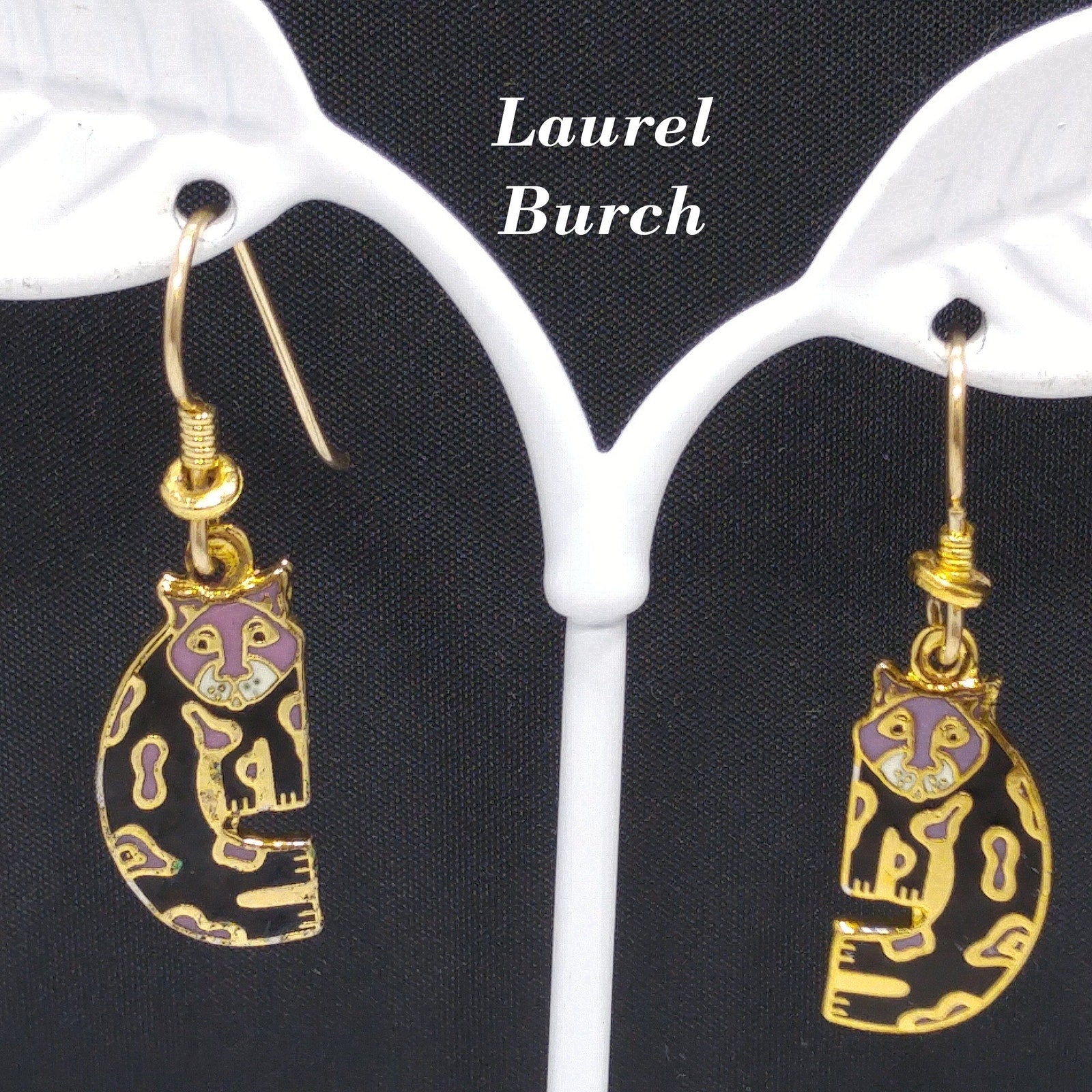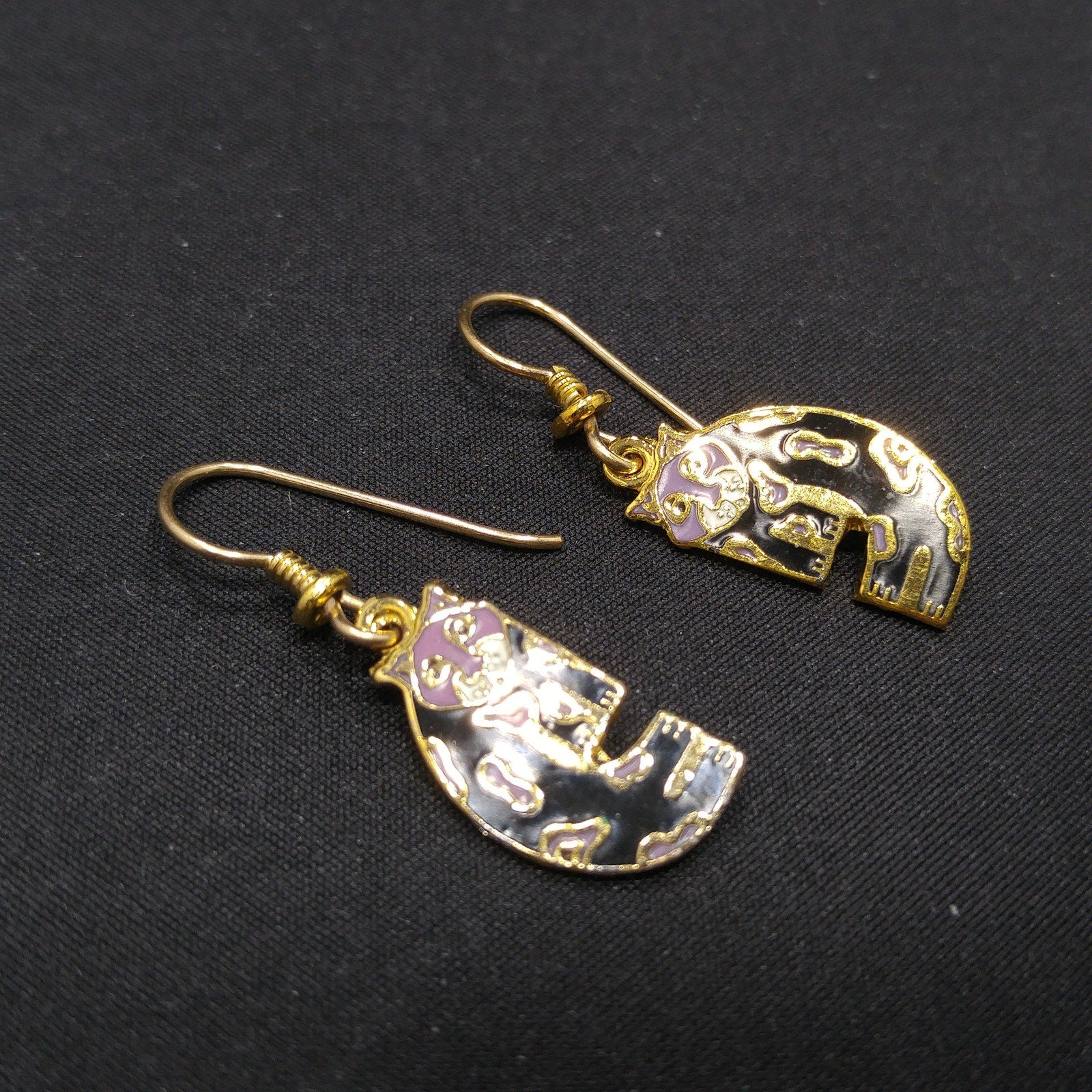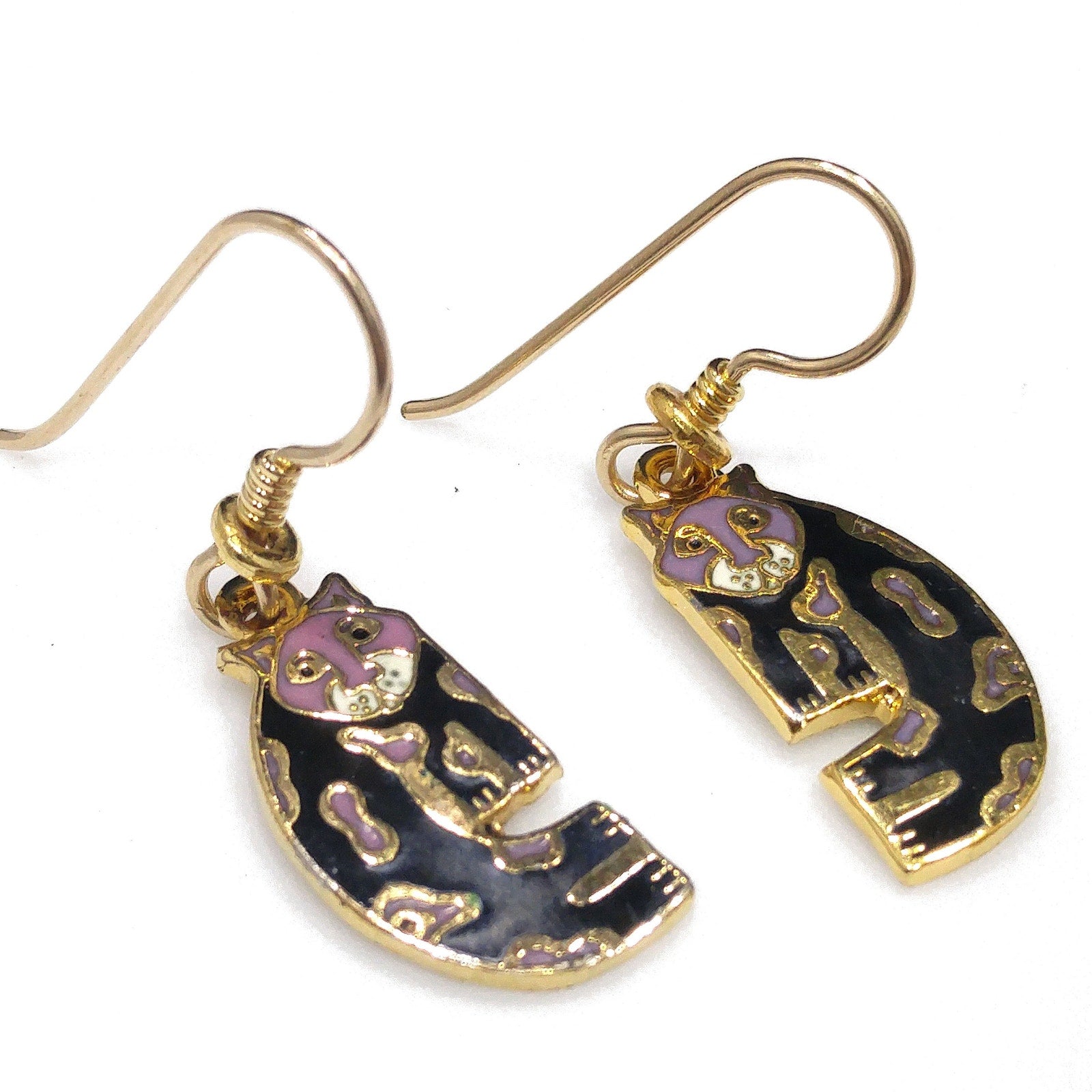 *Description: This is a unique pair of Laurel Burch baby snow leopard earrings in black enamel with purple spots and outlines in gold plate cloisonne technique finish from the 1980s. The earrings are an earlier pair and only signed LB. The later earrings have her full name and BABY SNOW LEOPARD. There is also white enamel on the baby snow leopard's face. The gold filled ear wires are in excellent condition and look like new. This design is rare and very cute!