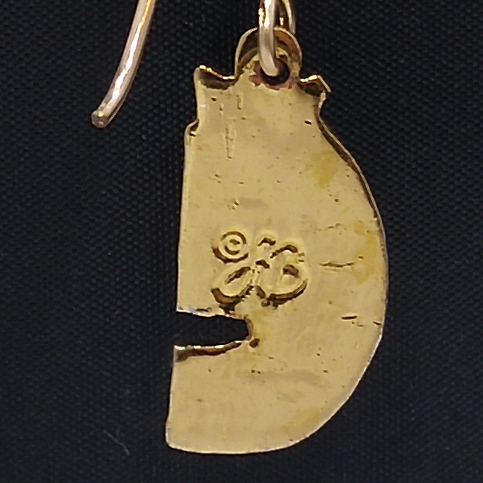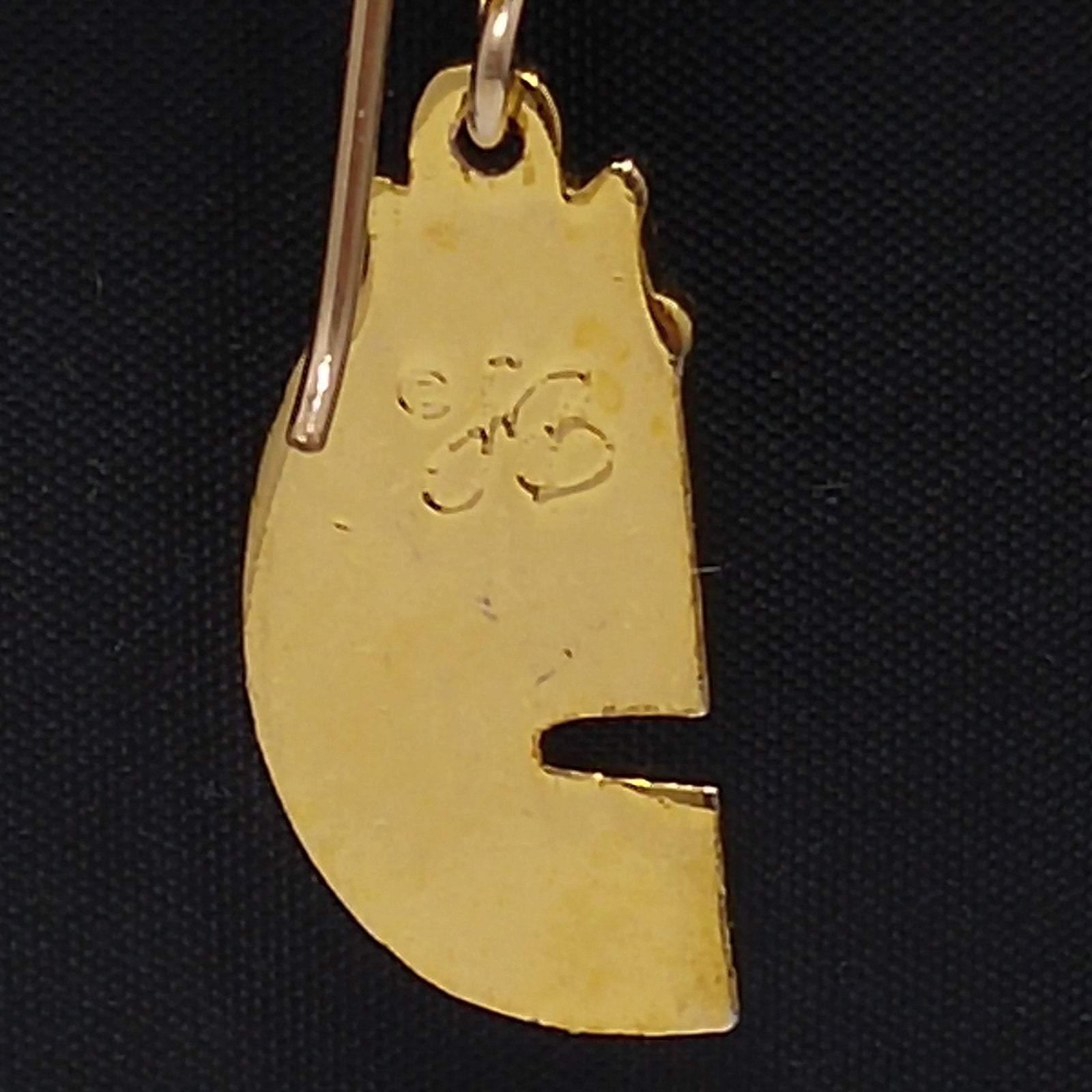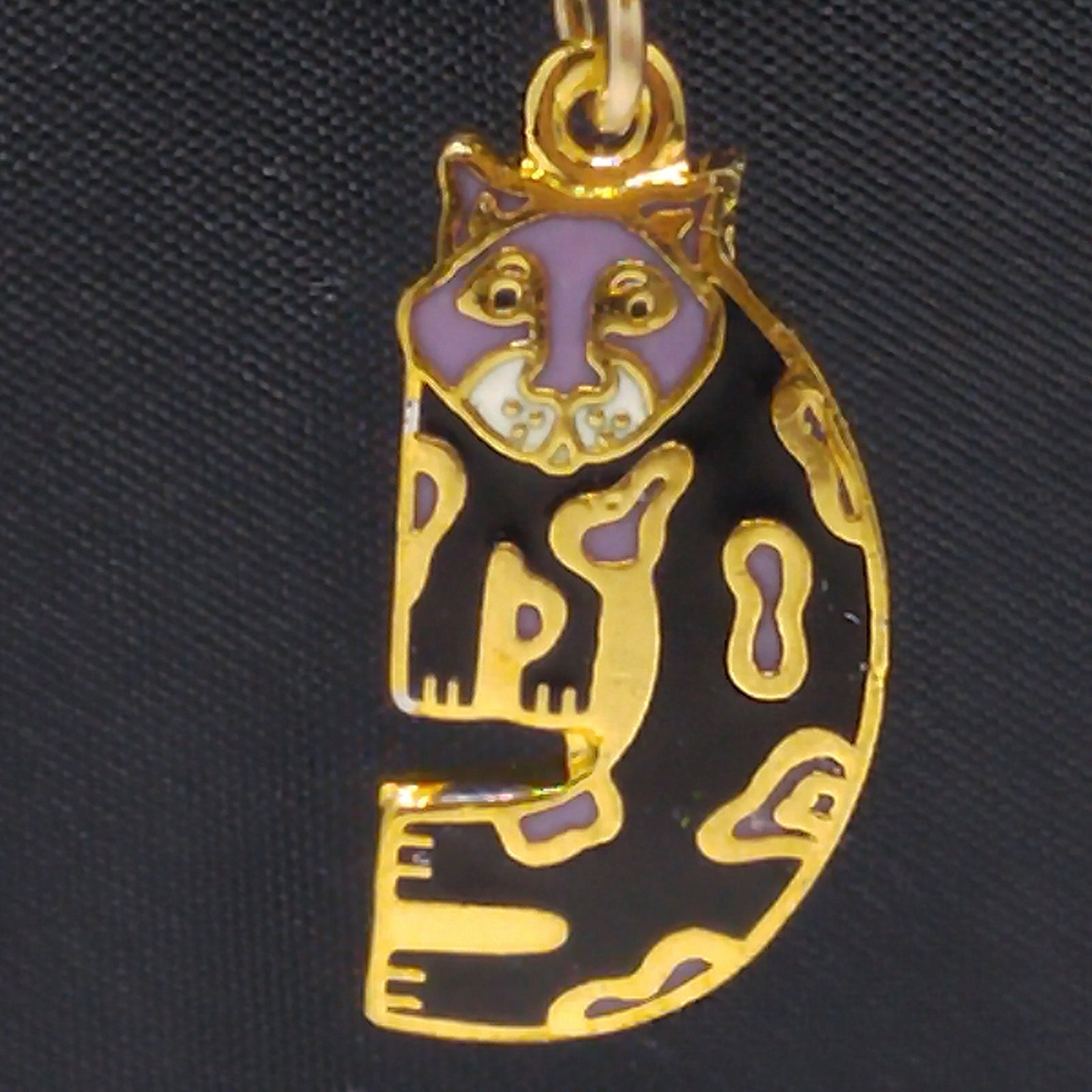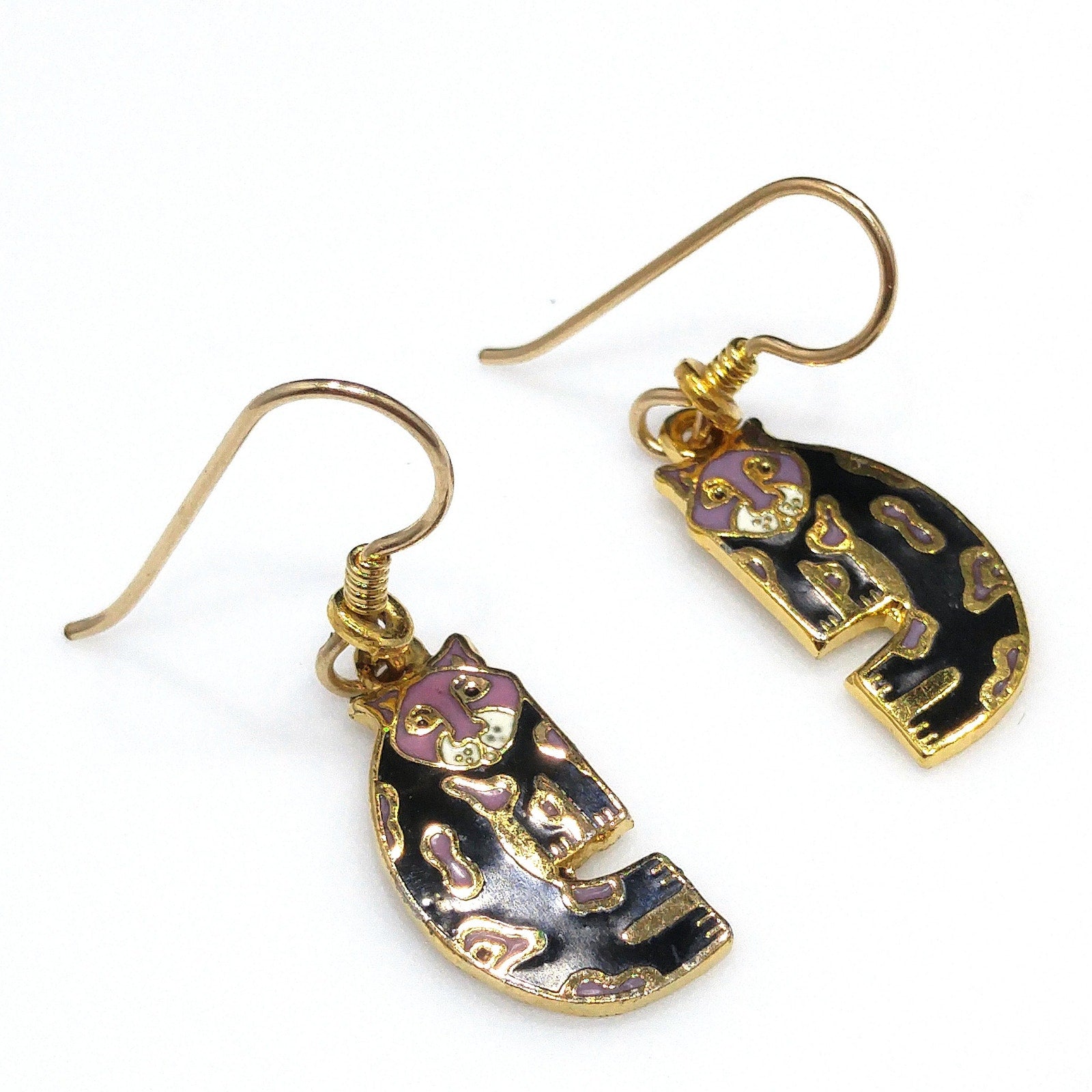 *Description: This is a unique pair of Laurel Burch baby snow leopard earrings in black enamel with purple spots and outlines in gold plate cloisonne technique finish from the 1980s. The earrings are an earlier pair and only signed LB. The later earrings have her full name and BABY SNOW LEOPARD. There is also white enamel on the baby snow leopard's face. The gold filled ear wires are in excellent condition and look like new. This design is rare and very cute!