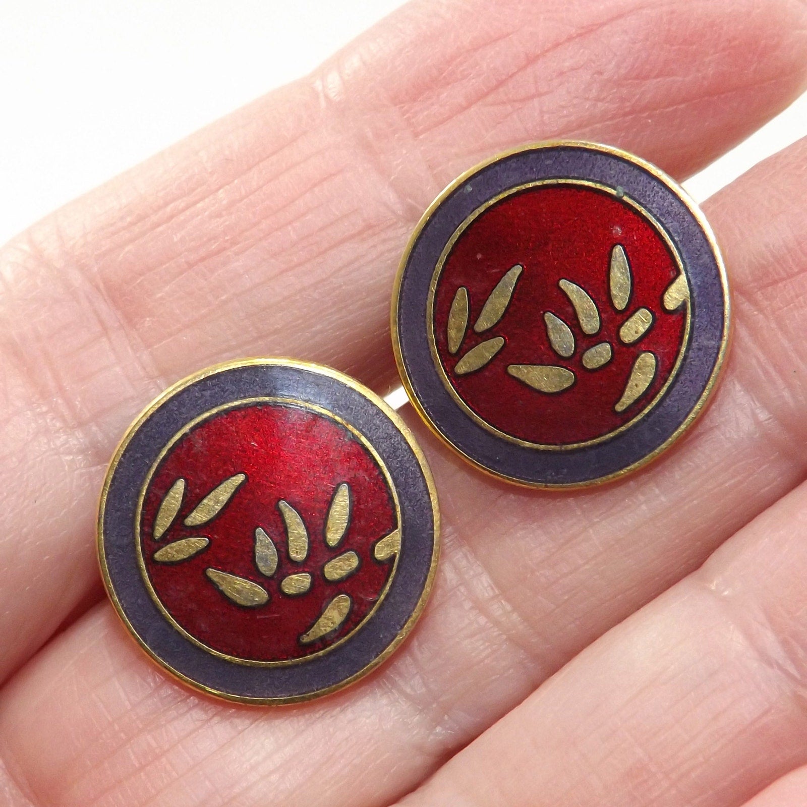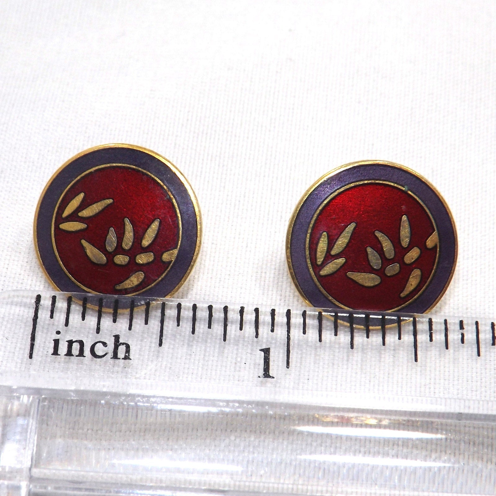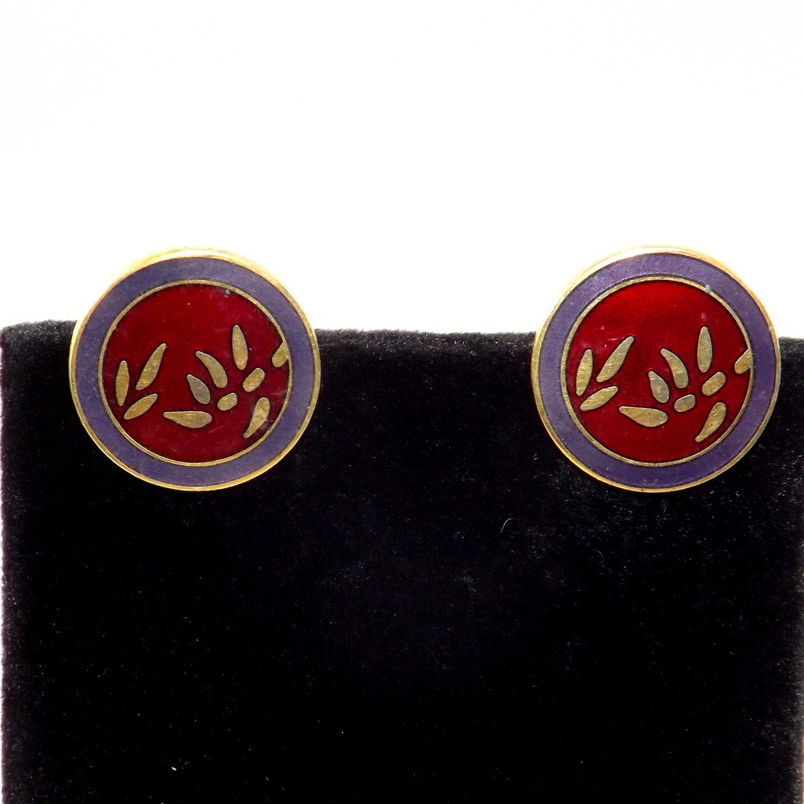 *Description: This is a great pair of Laurel Burch earrings using her bamboo design on a pair of post earrings. The cloisonné technique is used with gold plating and filled in with enamel in red and purple. The bamboo is also in gold. Laurel Burch always used gold filled posts and ear wires. This pair has been a very loved pair and the backs show signs of wear however the front looks to be in great vintage condition. They are a great pair of Laurel Burch post earrings.