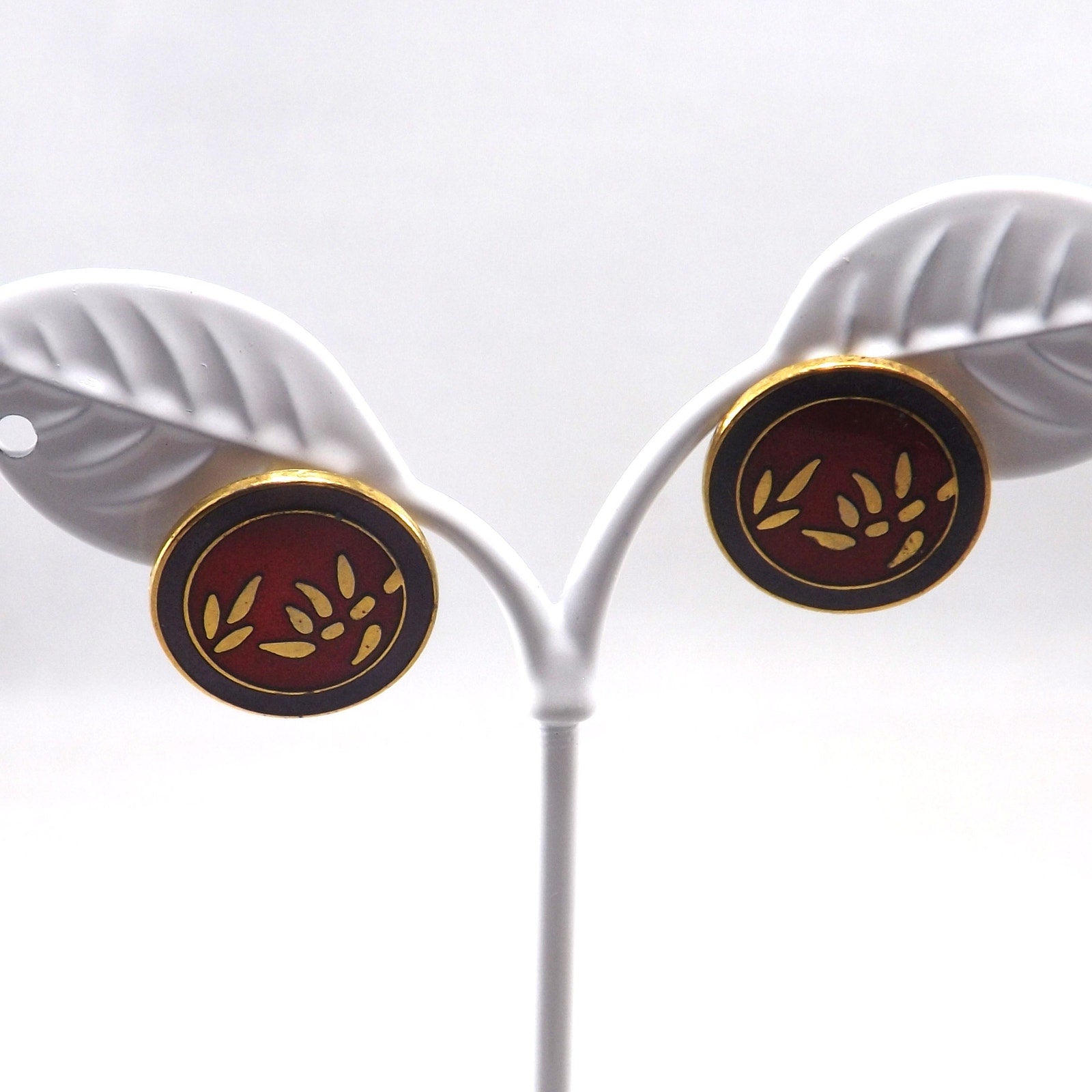 Laurel Burch Bamboo Red Post Earrings, Cloisonné Gold Plated, 1980s Vintage