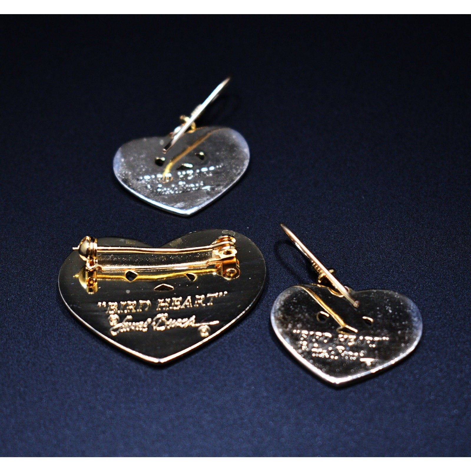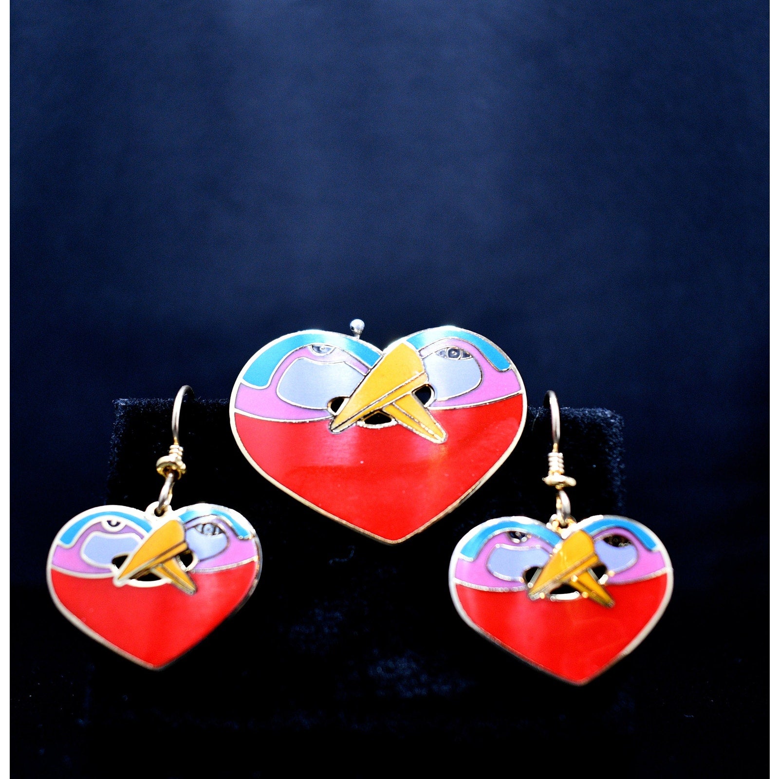 Laurel Burch "Bird Heart" Red Brooch & Earrings, Gold Plated Cloisonne Enamel, 1980s Vintage Jewelry
