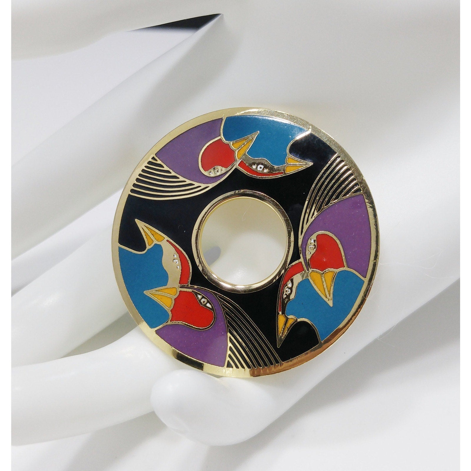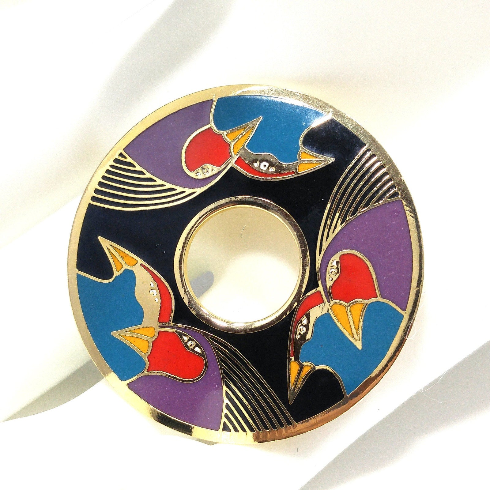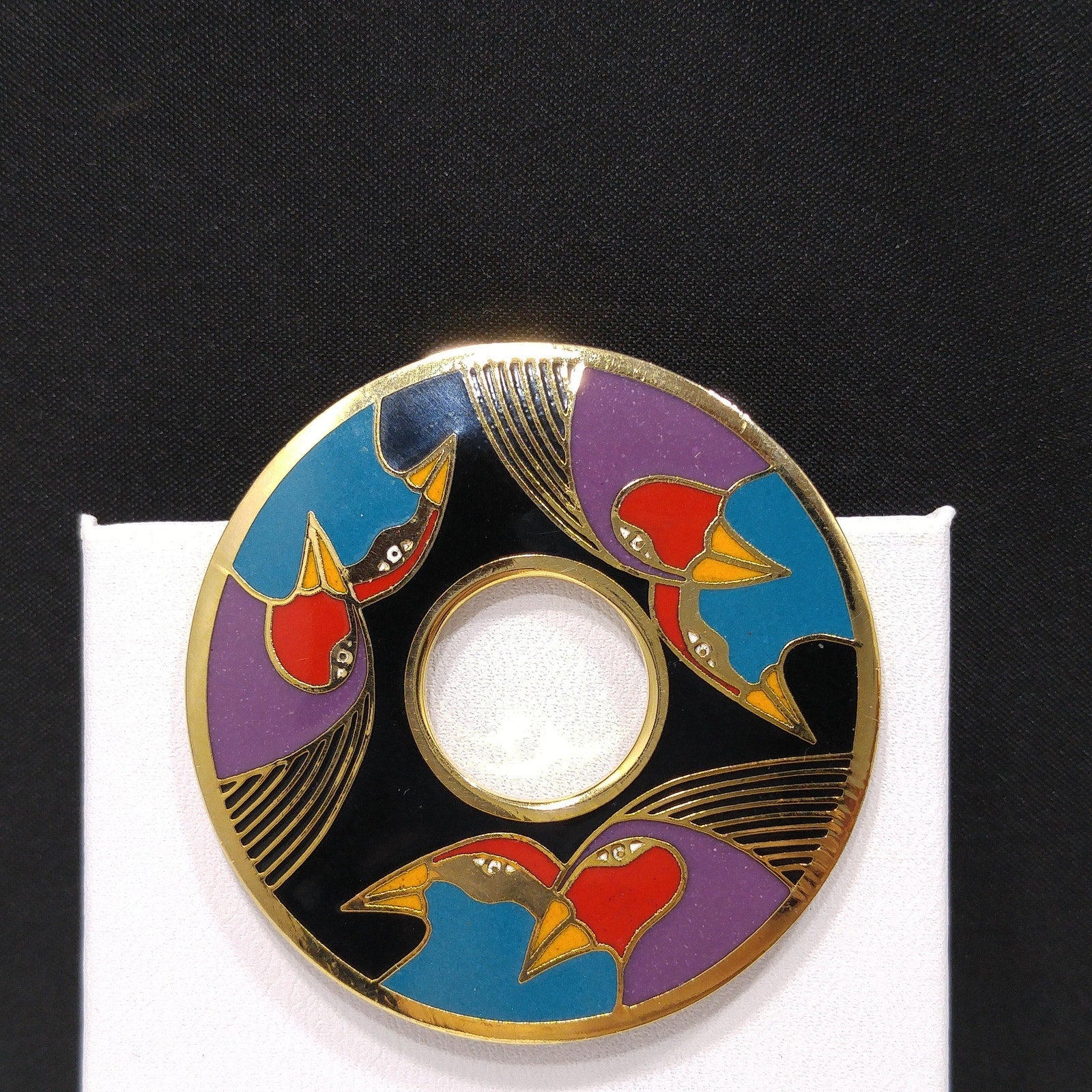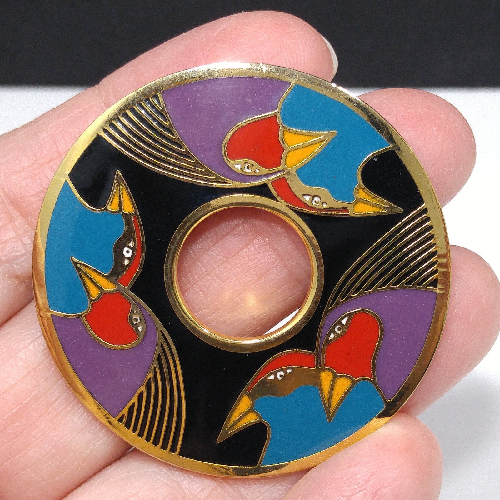 *Description: This is a great Laurel Burch "Birds of Santorini" circular brooch with a cloisonne gold plated design of six birds in bright enamel colors of teal blue, purple, red, and orange, on a black enamel background from the 1980s. The doughnut shaped design is stamped Laurel Burch and Birds of Santorini on the back with a rolling C clasp. This would be a great addition to your vintage jewelry collection or make a great vintage gift!