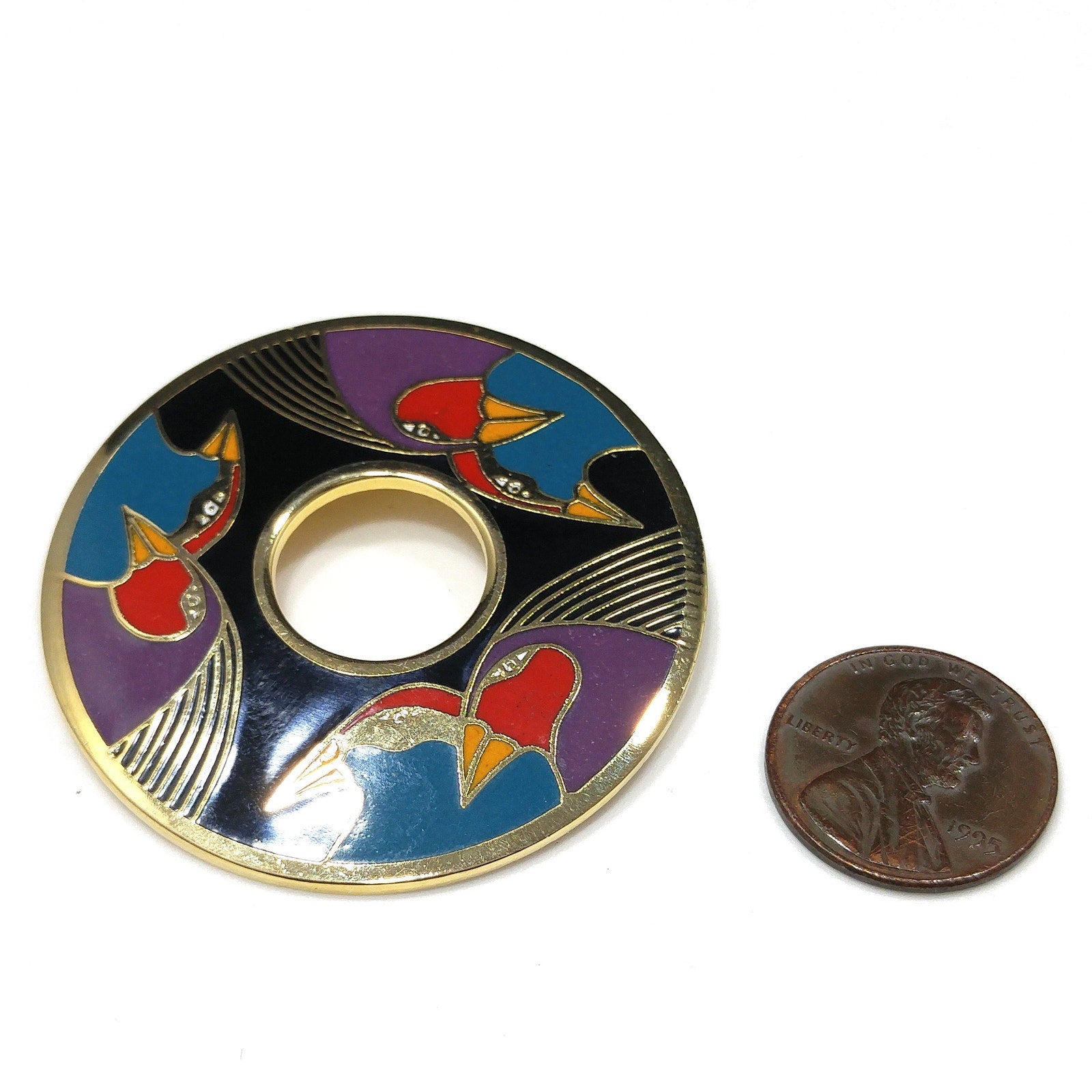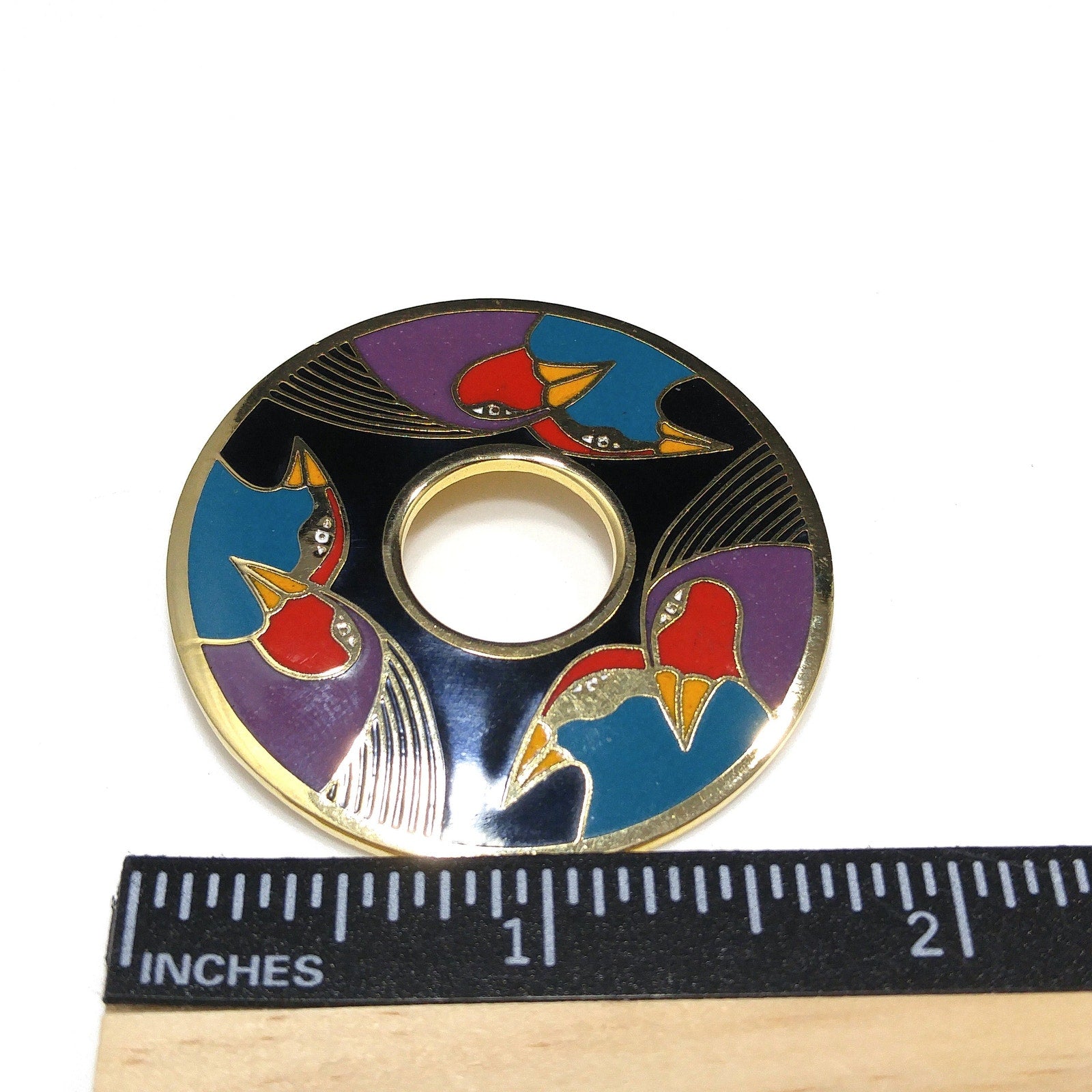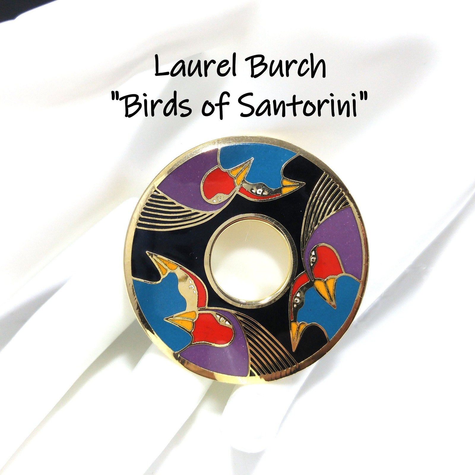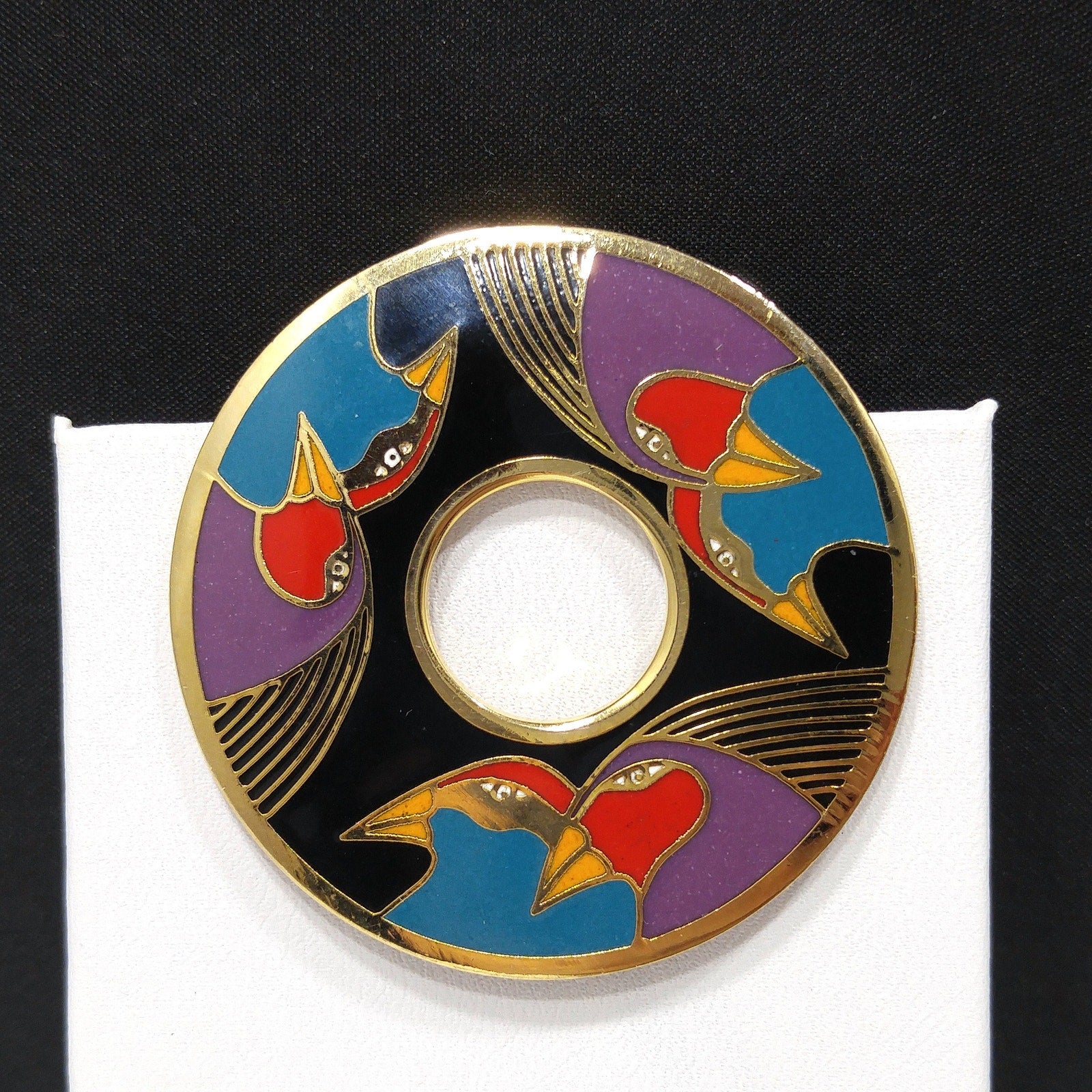 *Description: This is a great Laurel Burch "Birds of Santorini" circular brooch with a cloisonne gold plated design of six birds in bright enamel colors of teal blue, purple, red, and orange, on a black enamel background from the 1980s. The doughnut shaped design is stamped Laurel Burch and Birds of Santorini on the back with a rolling C clasp. This would be a great addition to your vintage jewelry collection or make a great vintage gift!
