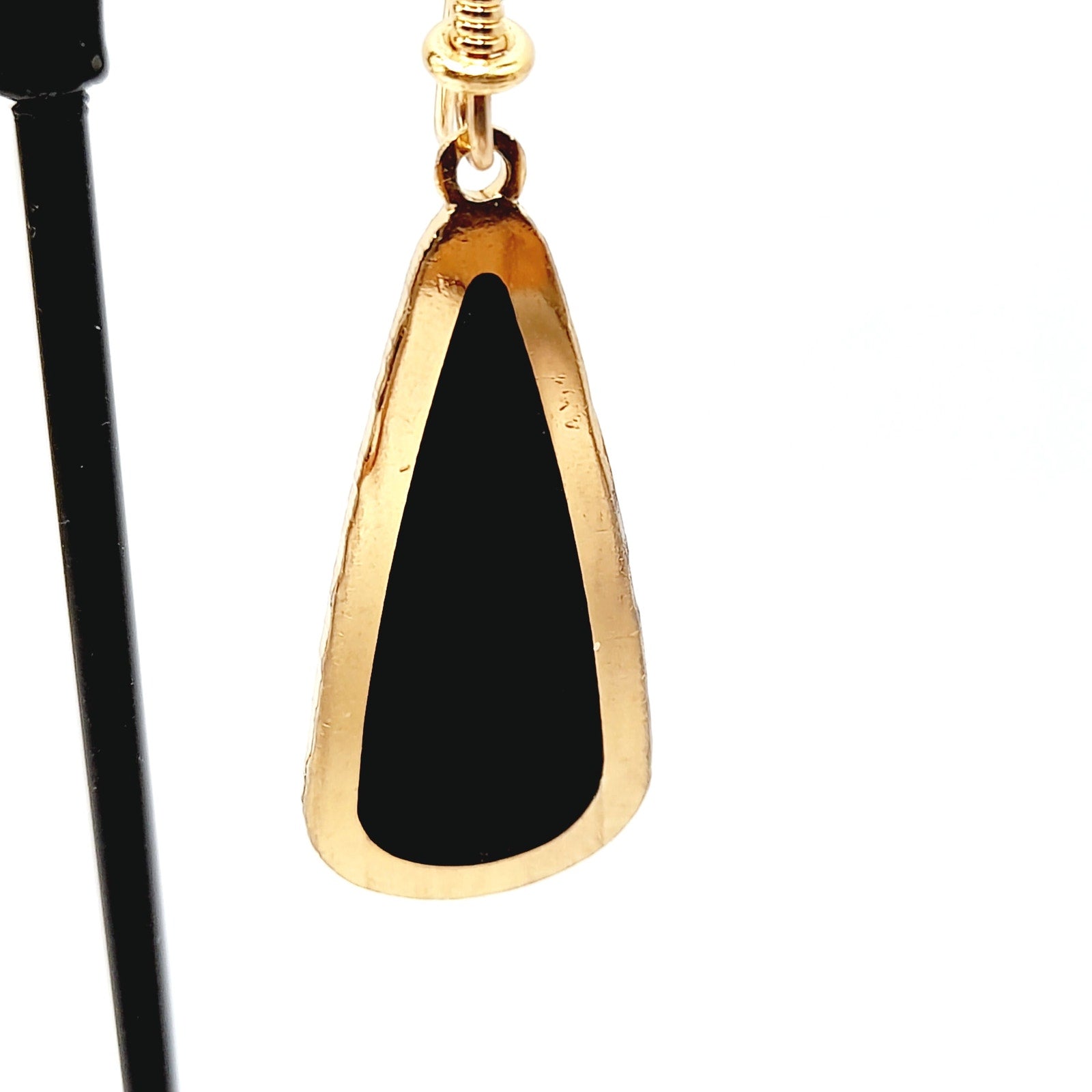 Elegant and timeless, these vintage Laurel Burch drop earrings feature a sleek black enamel inlay framed by rich gold plating. Designed with Laurel Burch’s signature bold simplicity, these earrings add a touch of modernist artistry to any outfit.