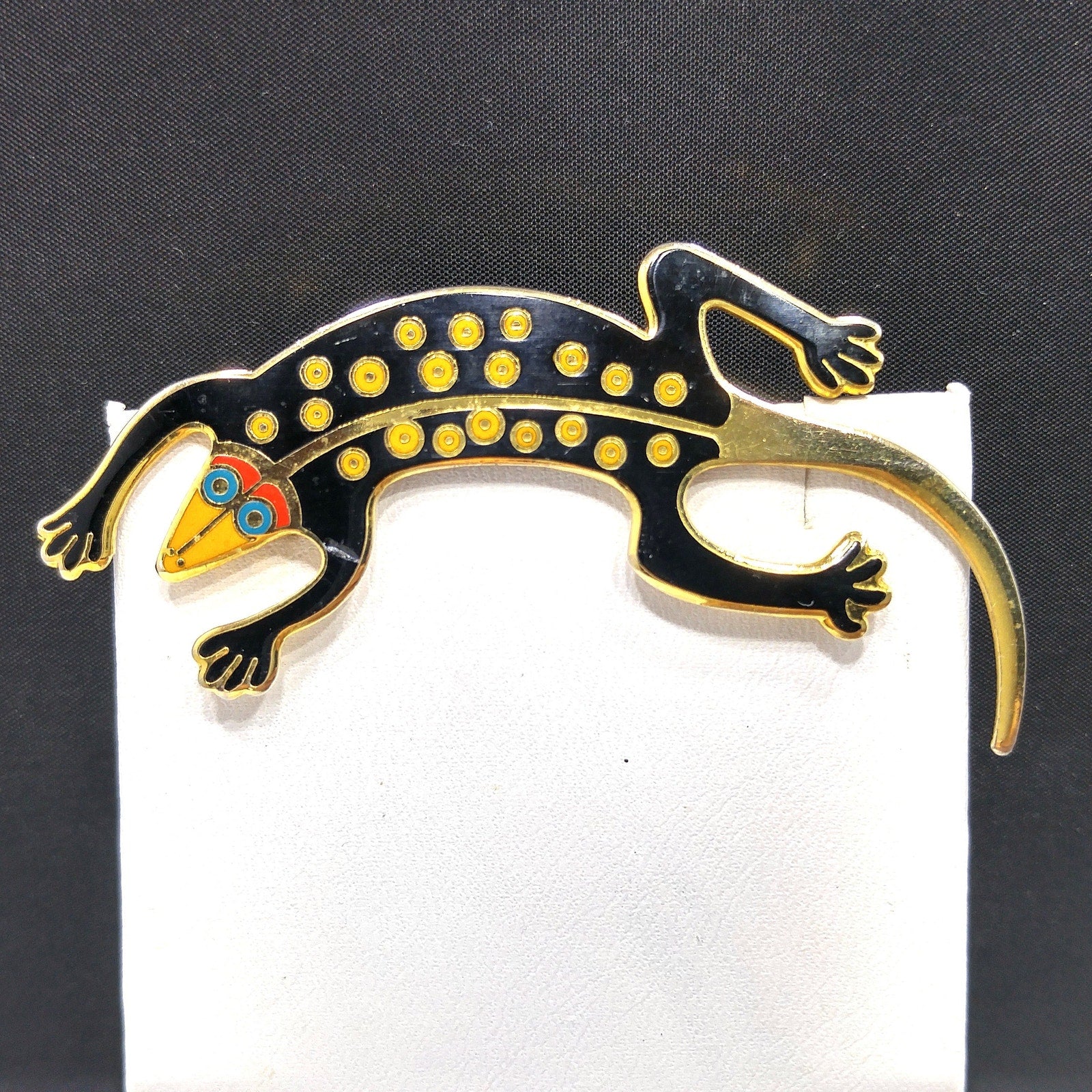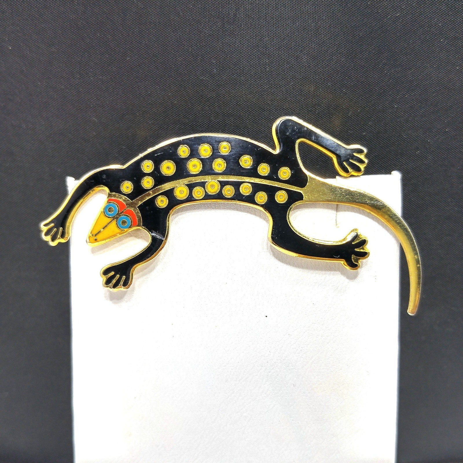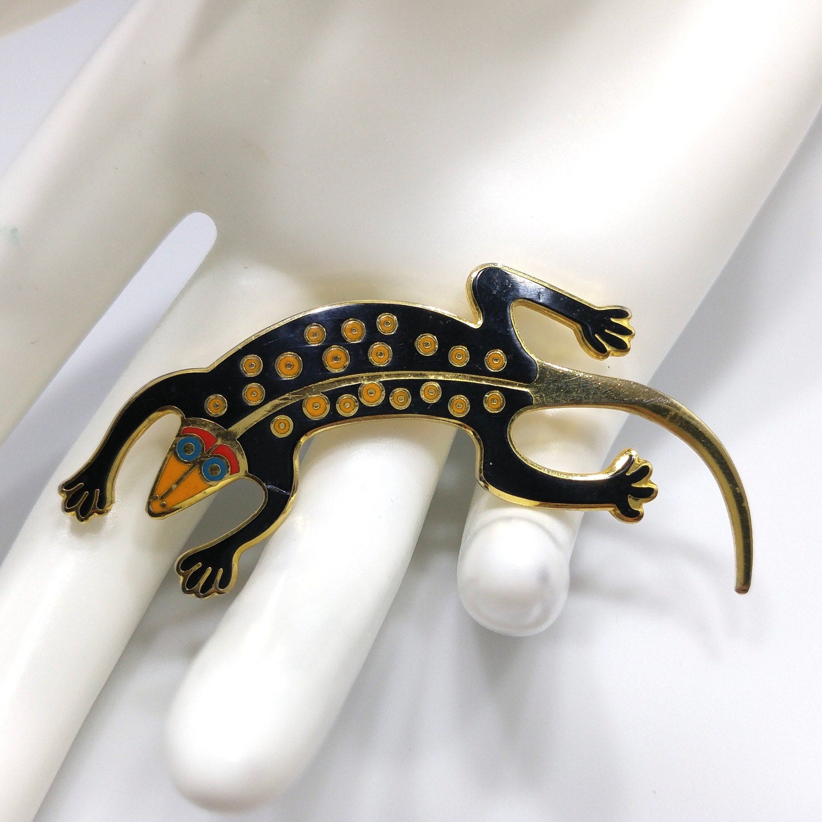 Laurel Burch Black "Lizard" Brooch, Gold Plated Cloisonne, 1980s Vintage Jewelry