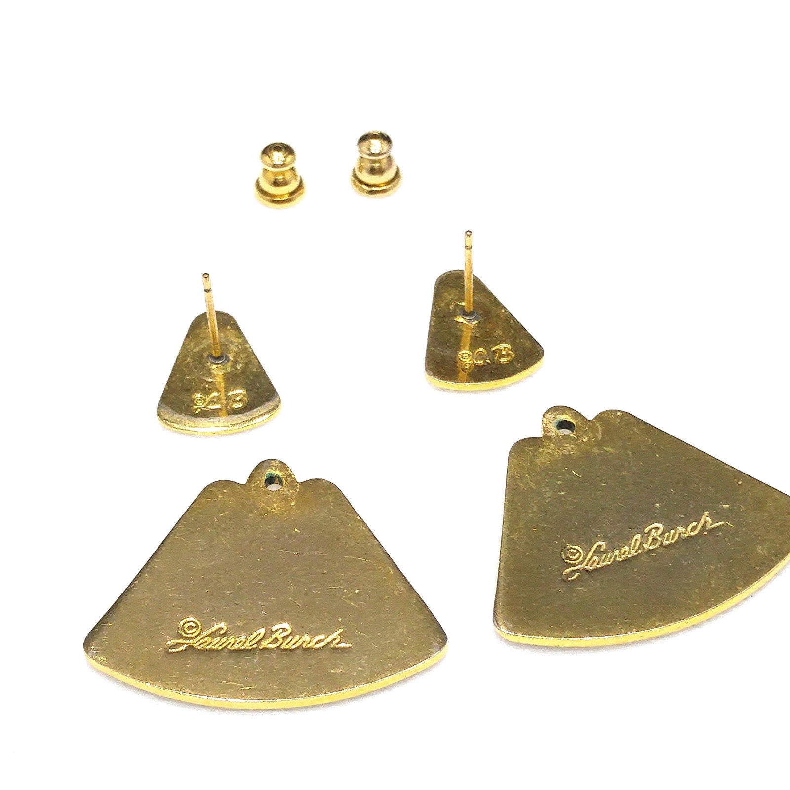 *Description: This is a really unique pair of Laurel Burch earrings which I call duel purpose or 2 in 1, because you have two completely different looks depending on if you wear the hanging portion of the earring or just the simple post portion. These earrings are cloisonne gold plate with two colors of enamel. The hanging portion of the design is separate and can be removed; allowing you to wear the black and gold post alone. So when you have this set of earrings, you actually have two different looks in one. The dangling portion of the earrings are stamped Laurel Burch and the top post section is stamped LB. The posts are gold filled, making these very comfortable to wear. This would be a great addition to your vintage jewelry collection or make a great vintage gift!