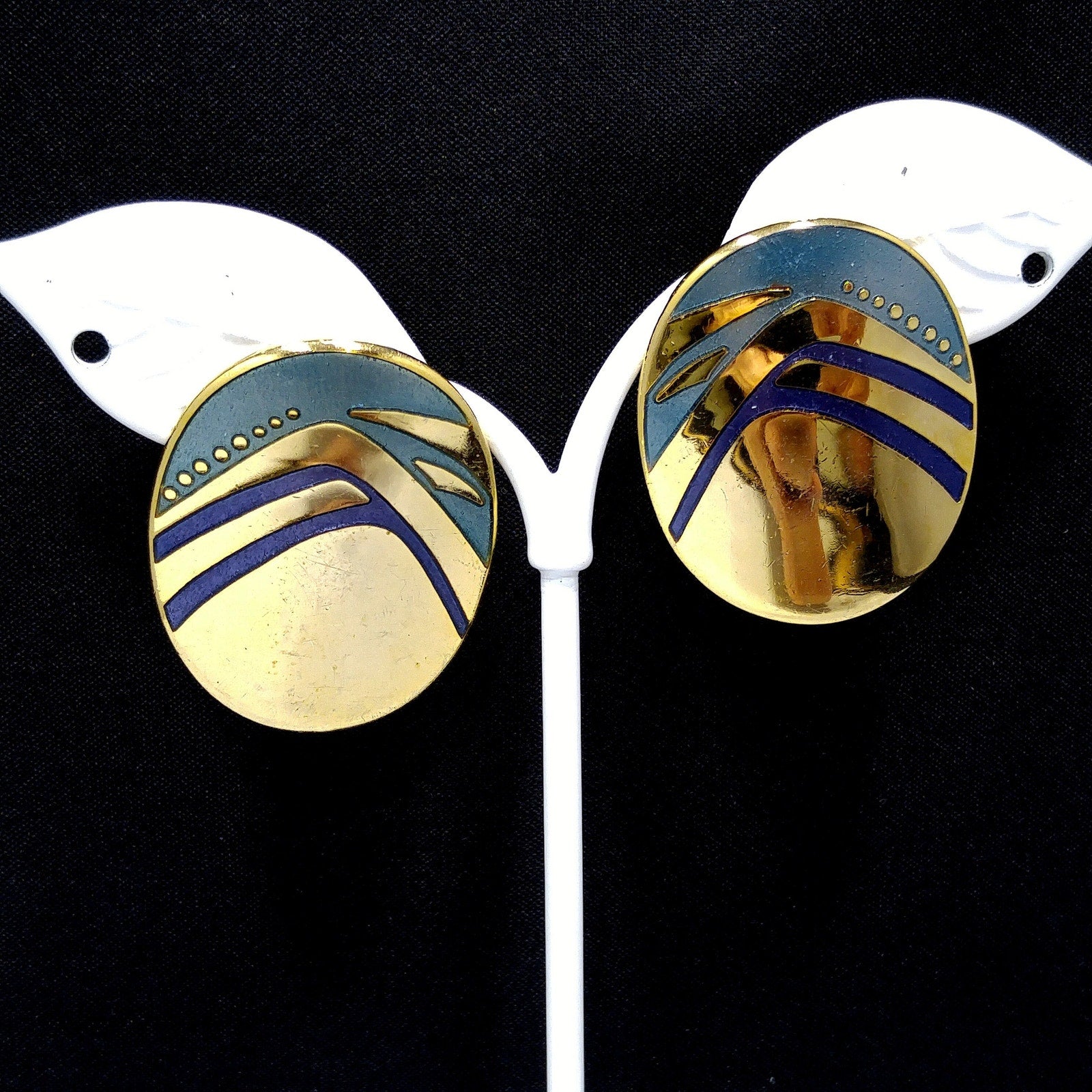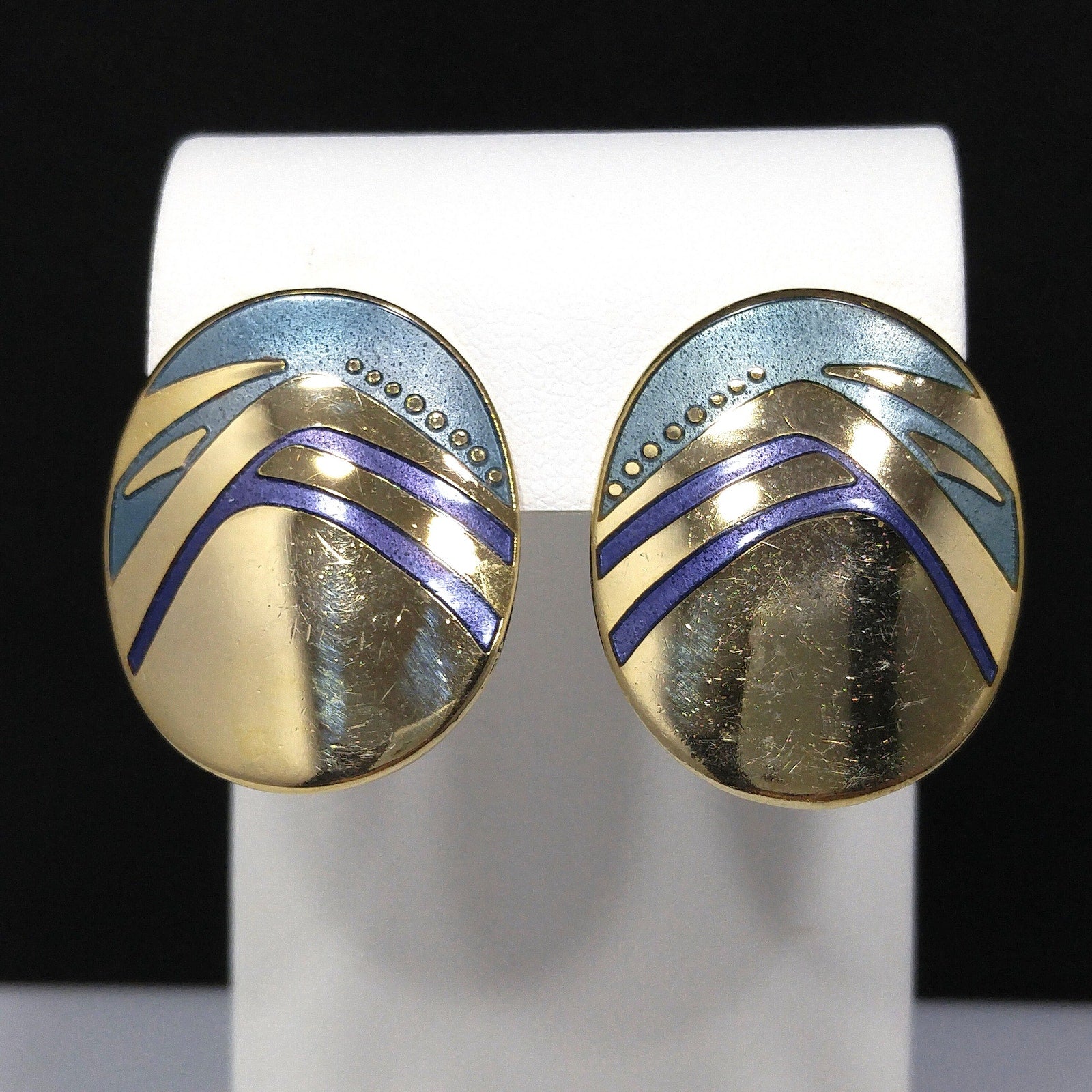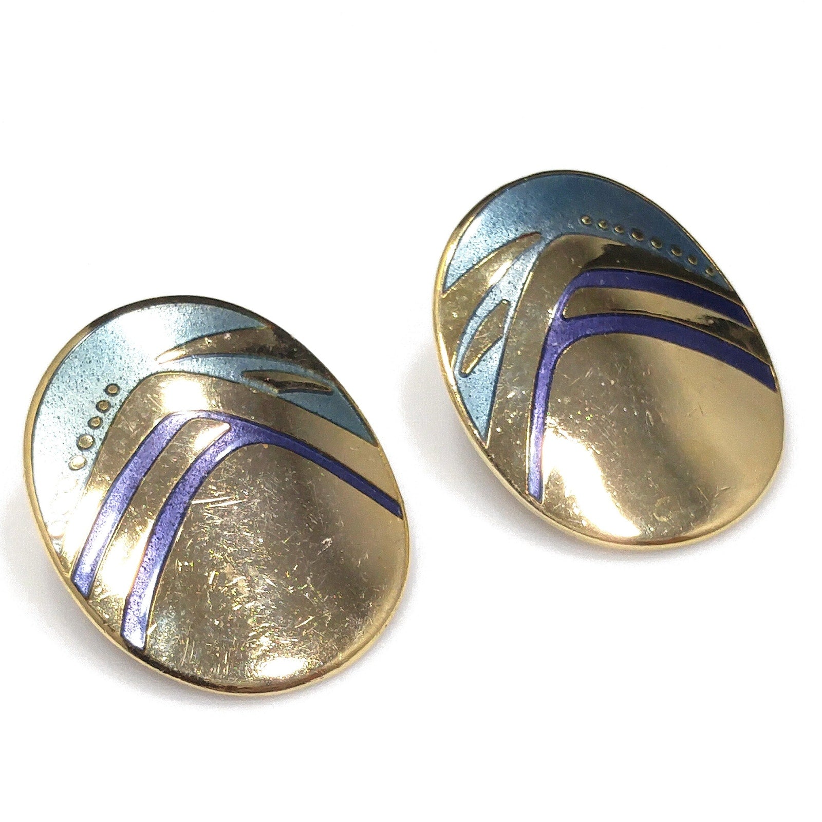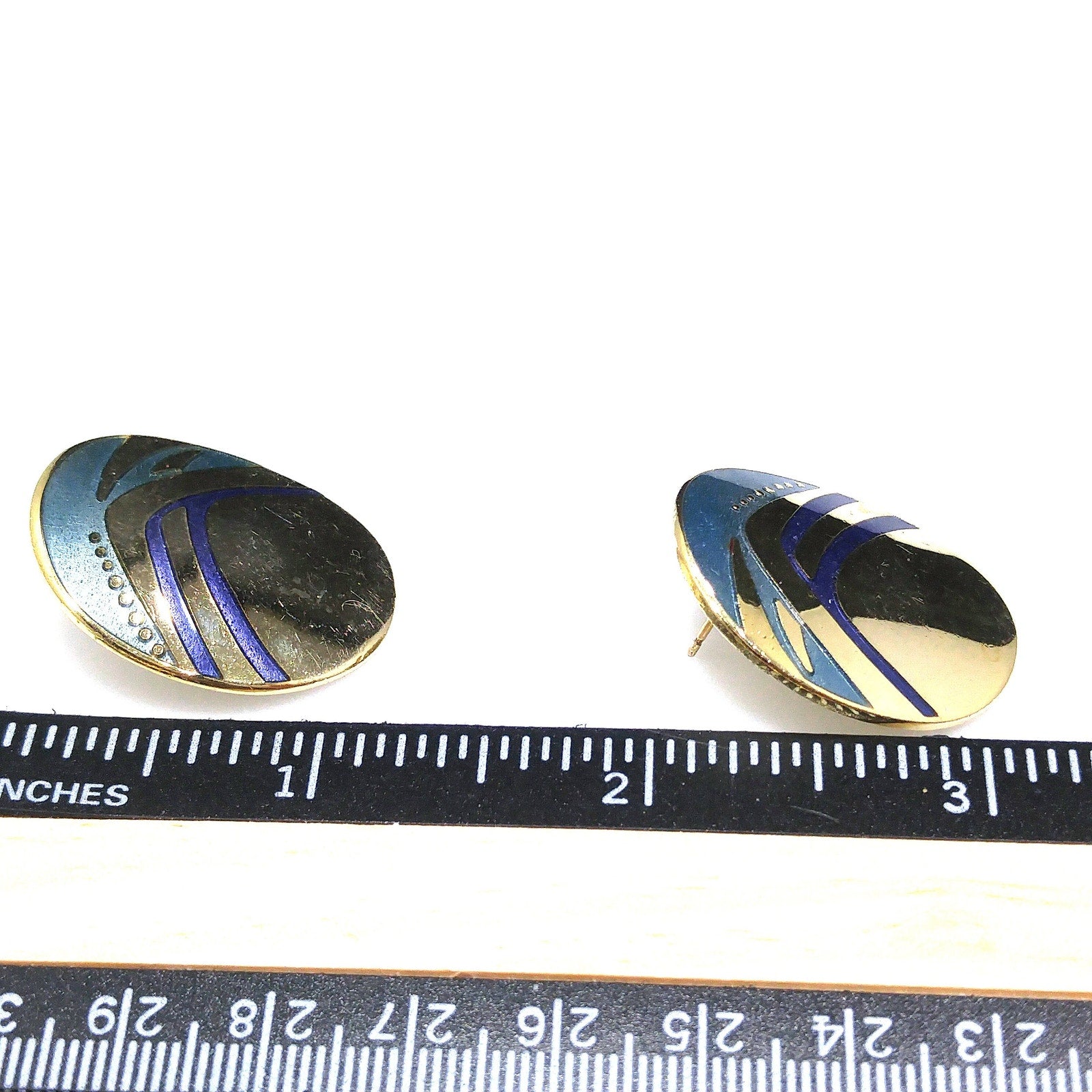 Laurel Burch Blue Metallic Oval Post Earrings, Gold Plated, 1980s Vintage