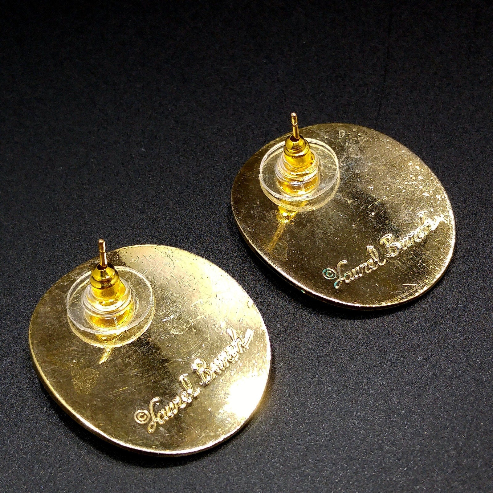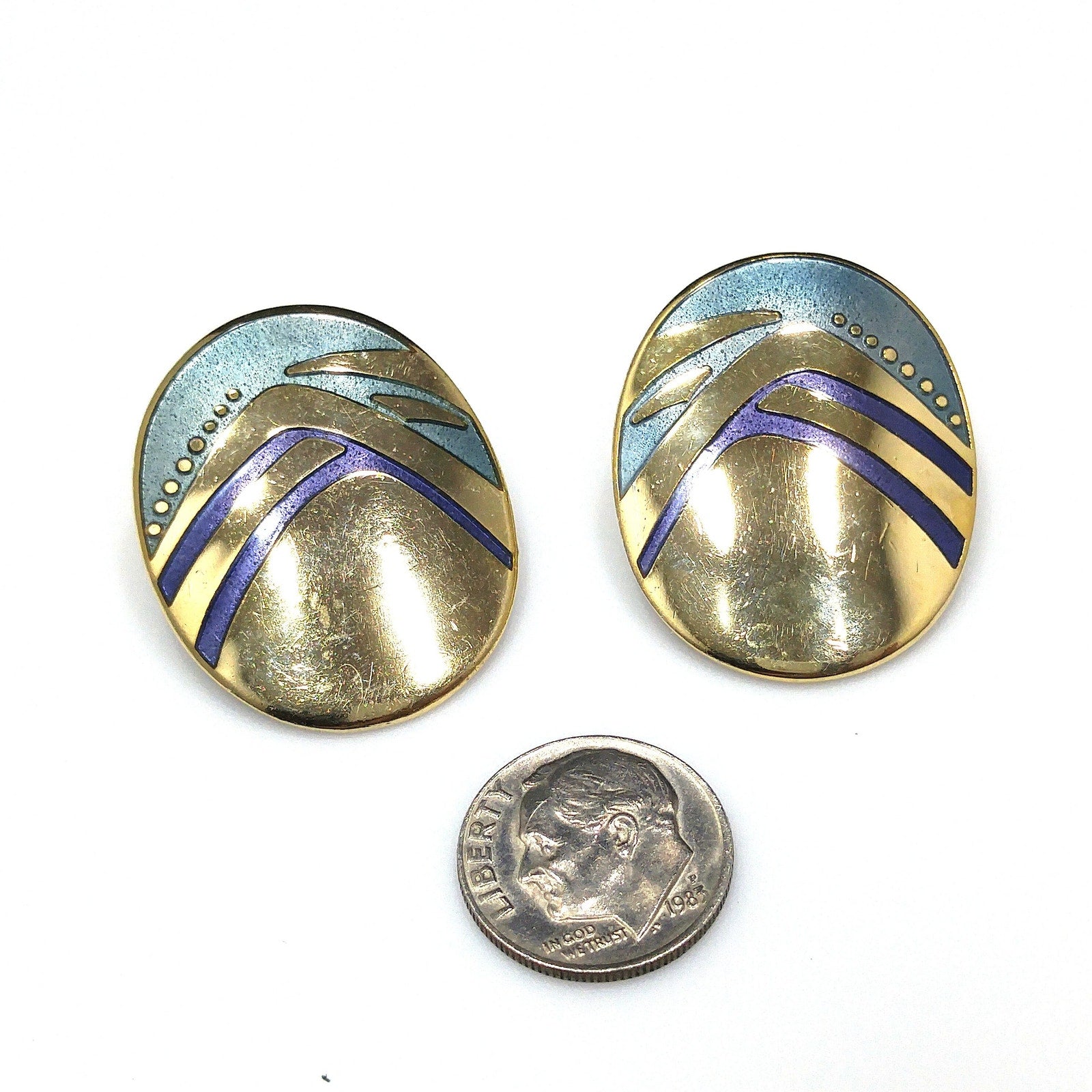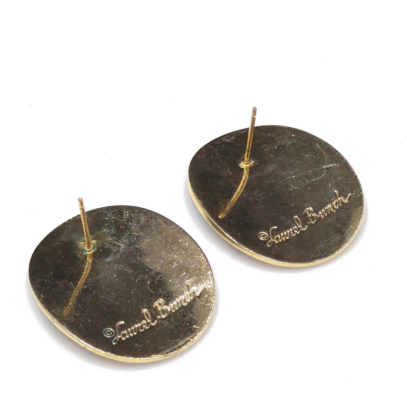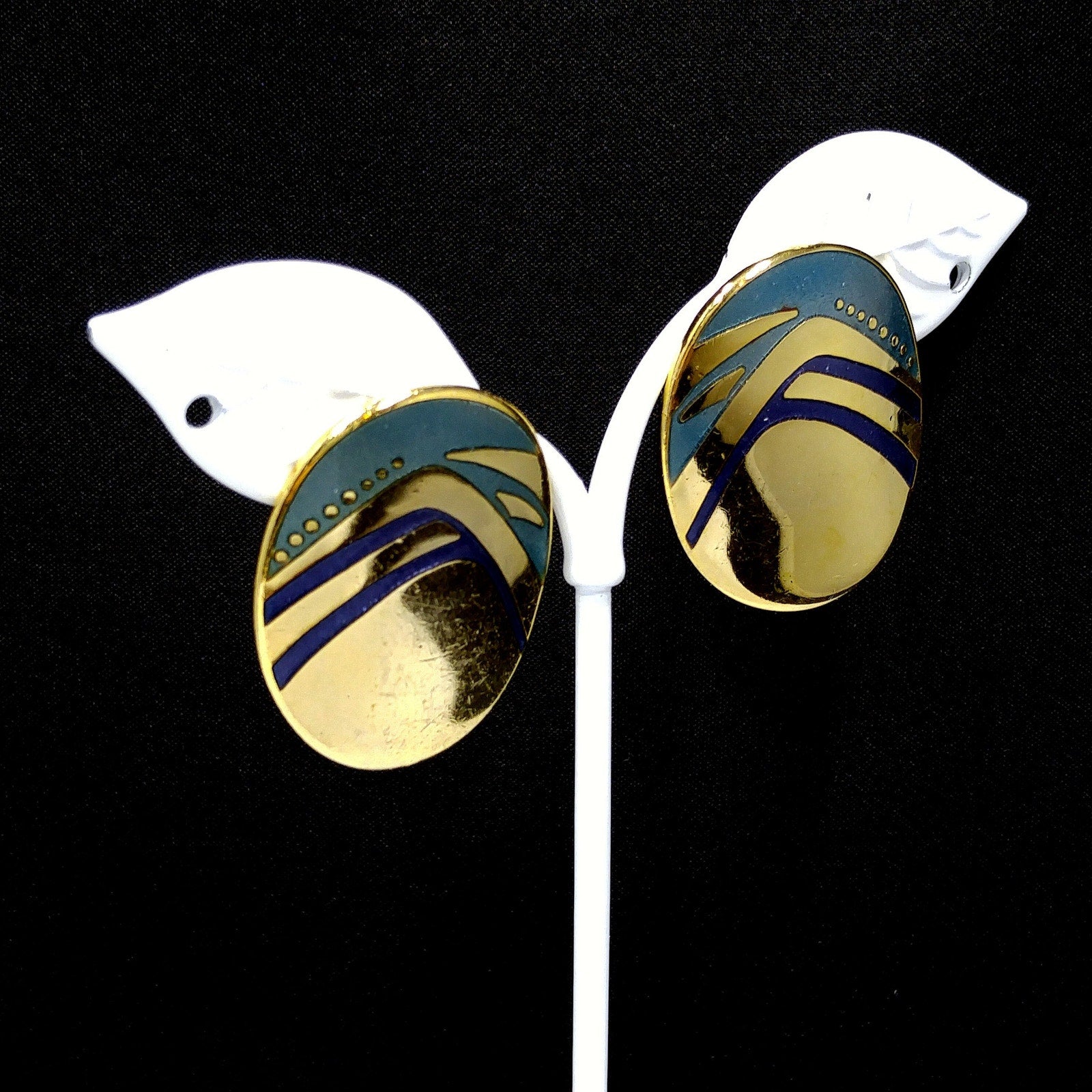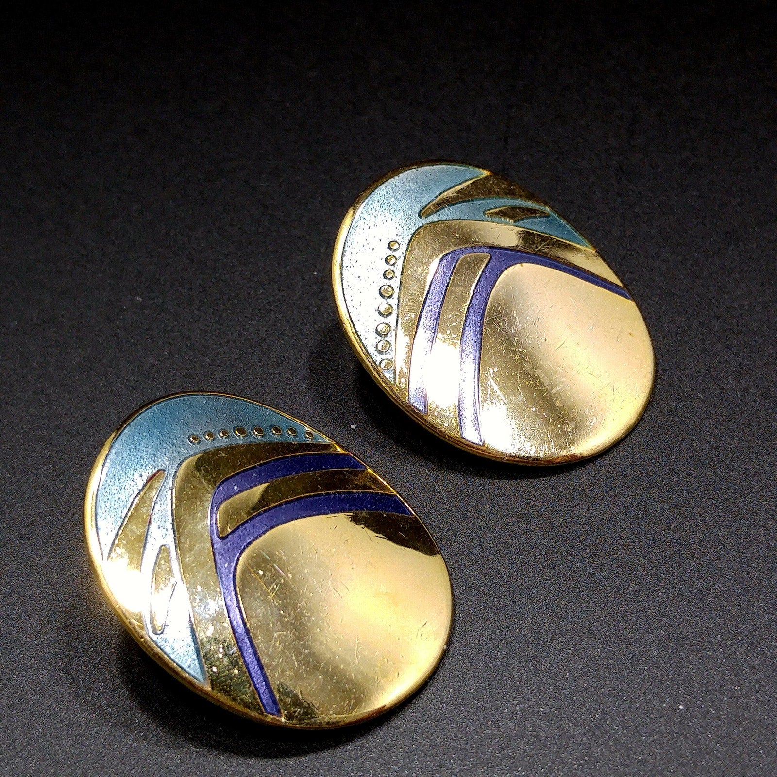 Laurel Burch Blue Metallic Oval Post Earrings, Gold Plated, 1980s Vintage