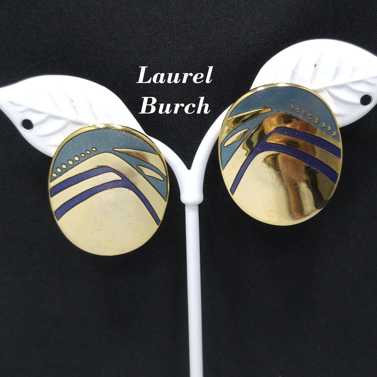 *Description: This is a beautiful pair of Laurel Burch metallic blue enamel and very reflective gold plate large post earrings from the 1980s. These earrings are slightly curved toward your face and have a gold plated surface on most of the earring. Then there are two shades of metallic blue enamel using the cloisonné technique near the top of each earring. Each earring is stamped on the back with the designer's name, Laurel Burch. This would be a great addition to your vintage jewelry collection or make a great vintage gift!