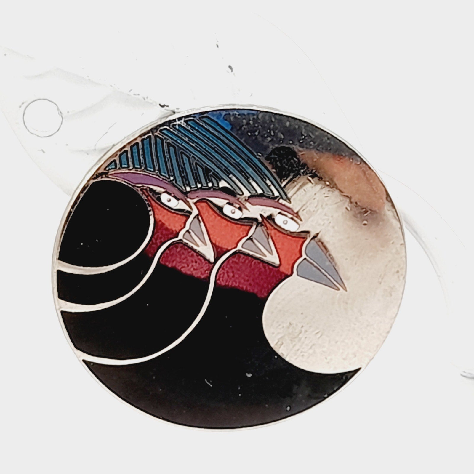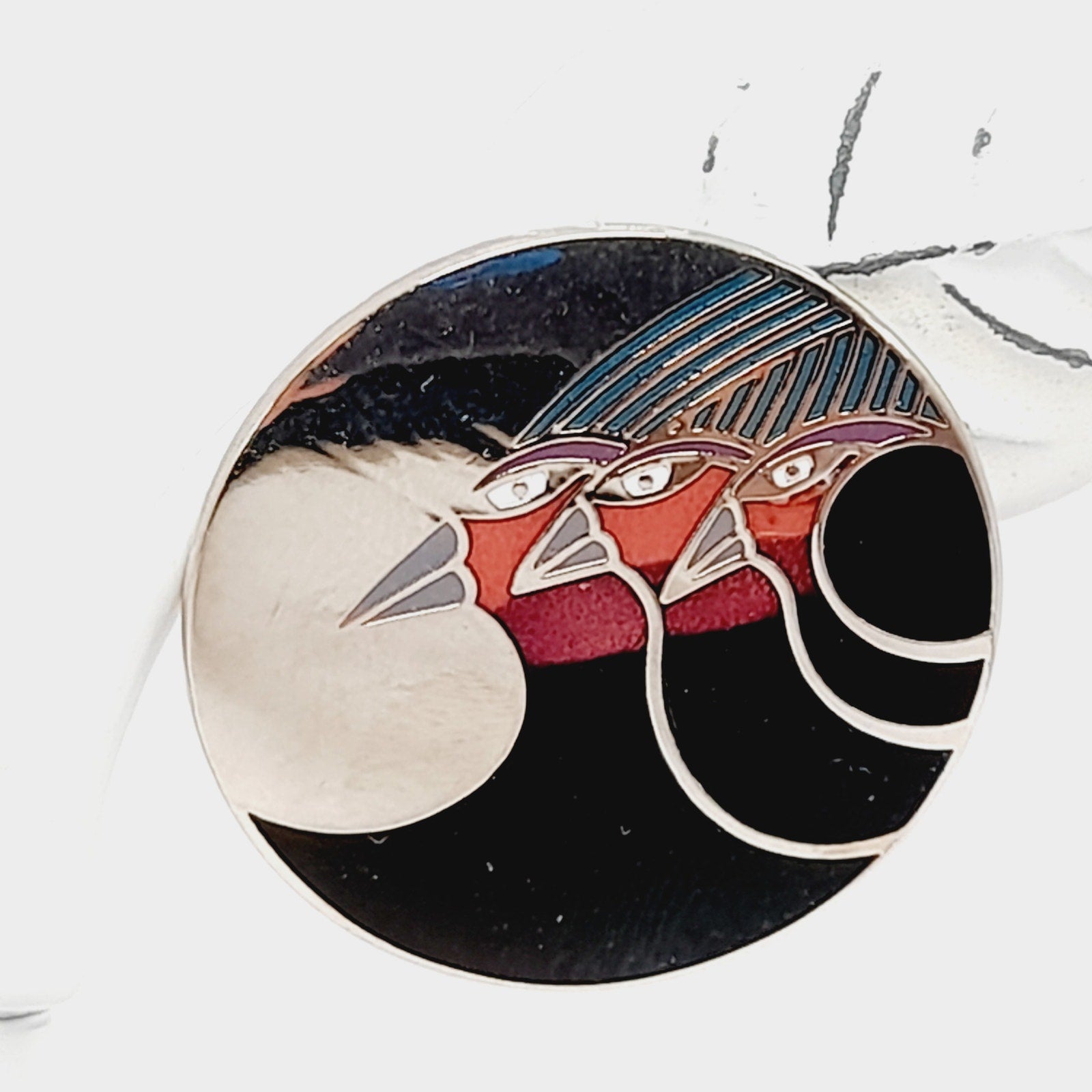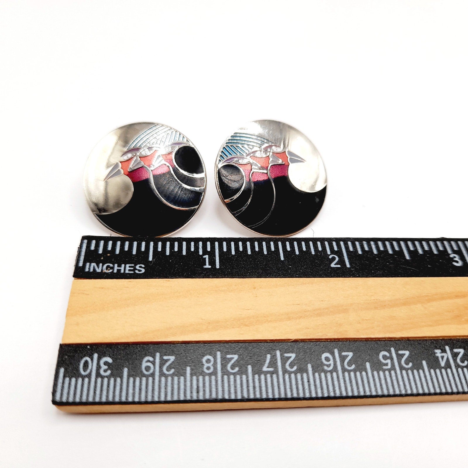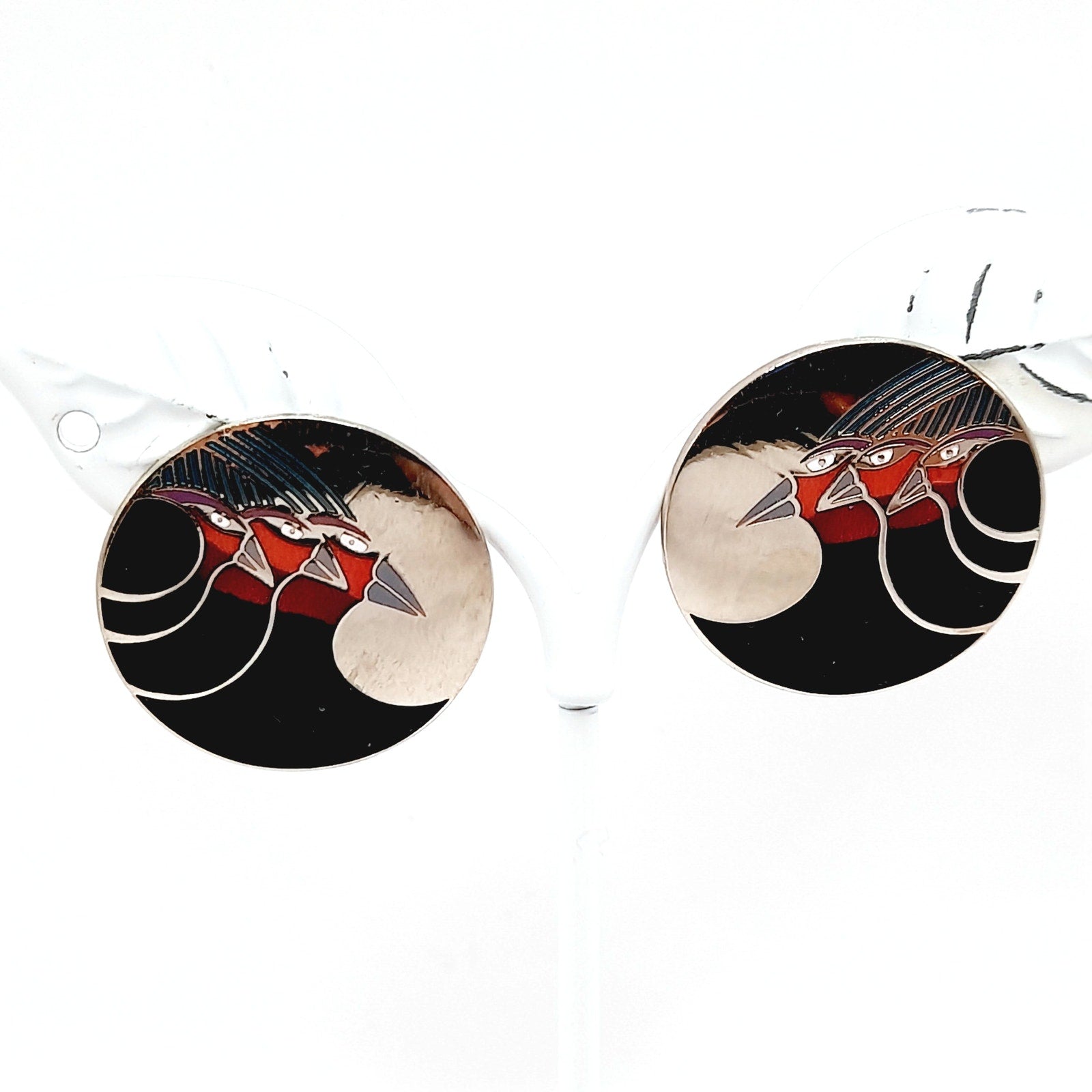 Elevate your vintage jewelry collection with these stunning Laurel Burch "Celestial Birds" Post Earrings from the 1980s. Crafted with rhodium plating for a highly reflective finish, these collectible statement earrings feature a bold enamel bird design in vibrant shades of red, black, and silver, embodying Laurel Burch’s signature artistic style.