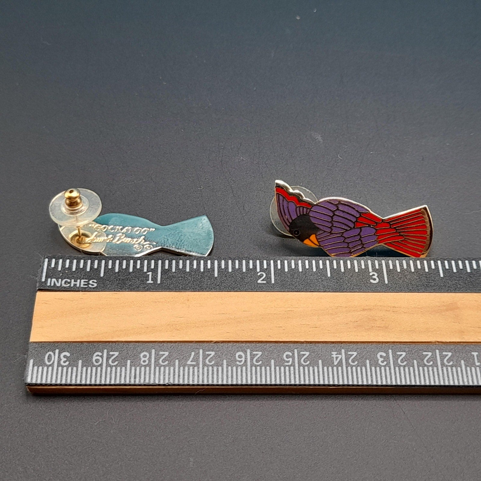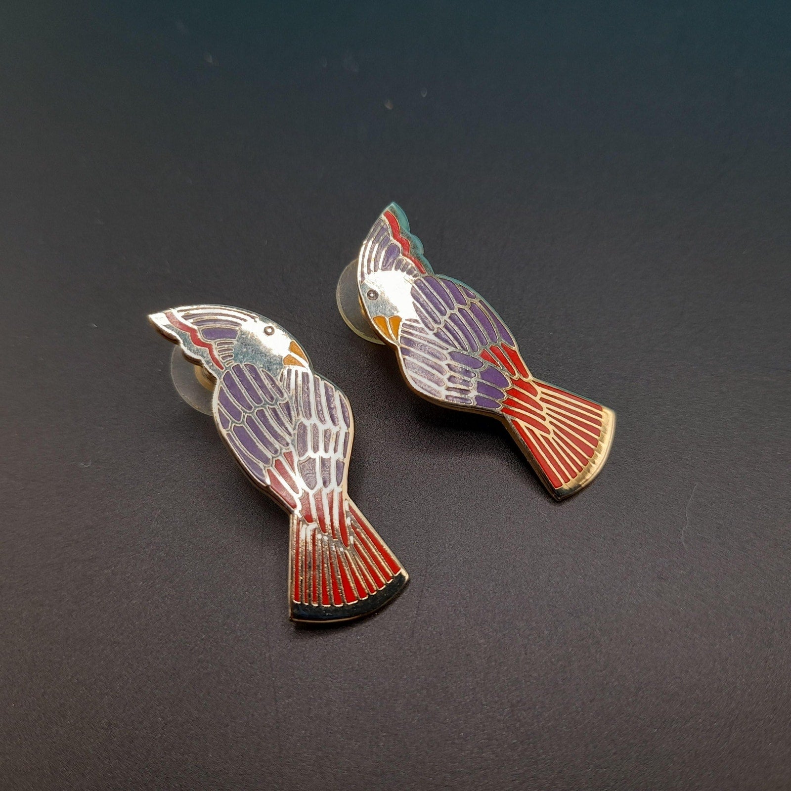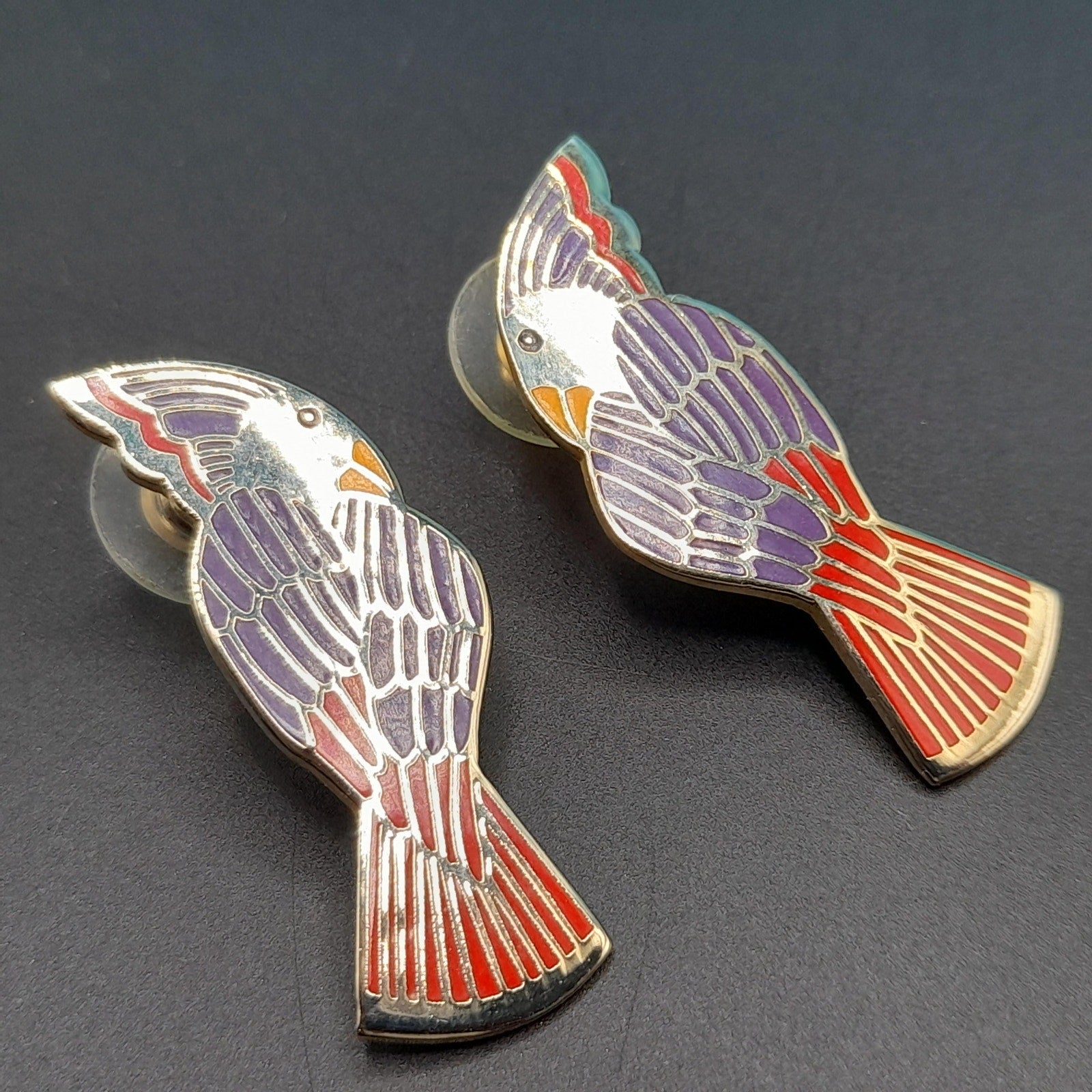 *Description: This is a beautiful pair of vintage Laurel Burch Cockatoo bird earrings from the 1980s. Each earring is stamped Laurel Burch and Cockatoo and is gold plated with very reflective outlines on the front and enamel in red, blue, and purple. This would be the perfect gift for the bird lover in your life.