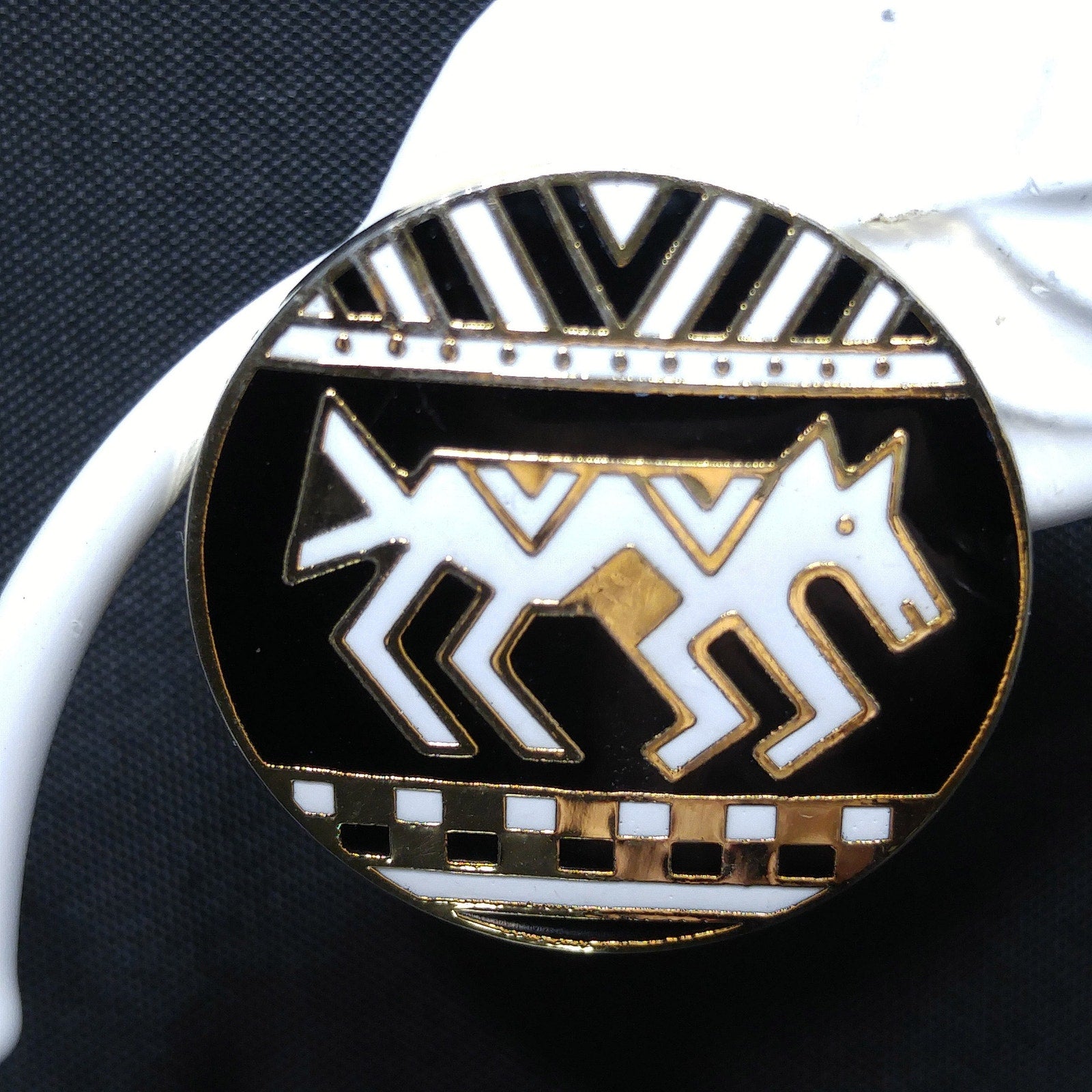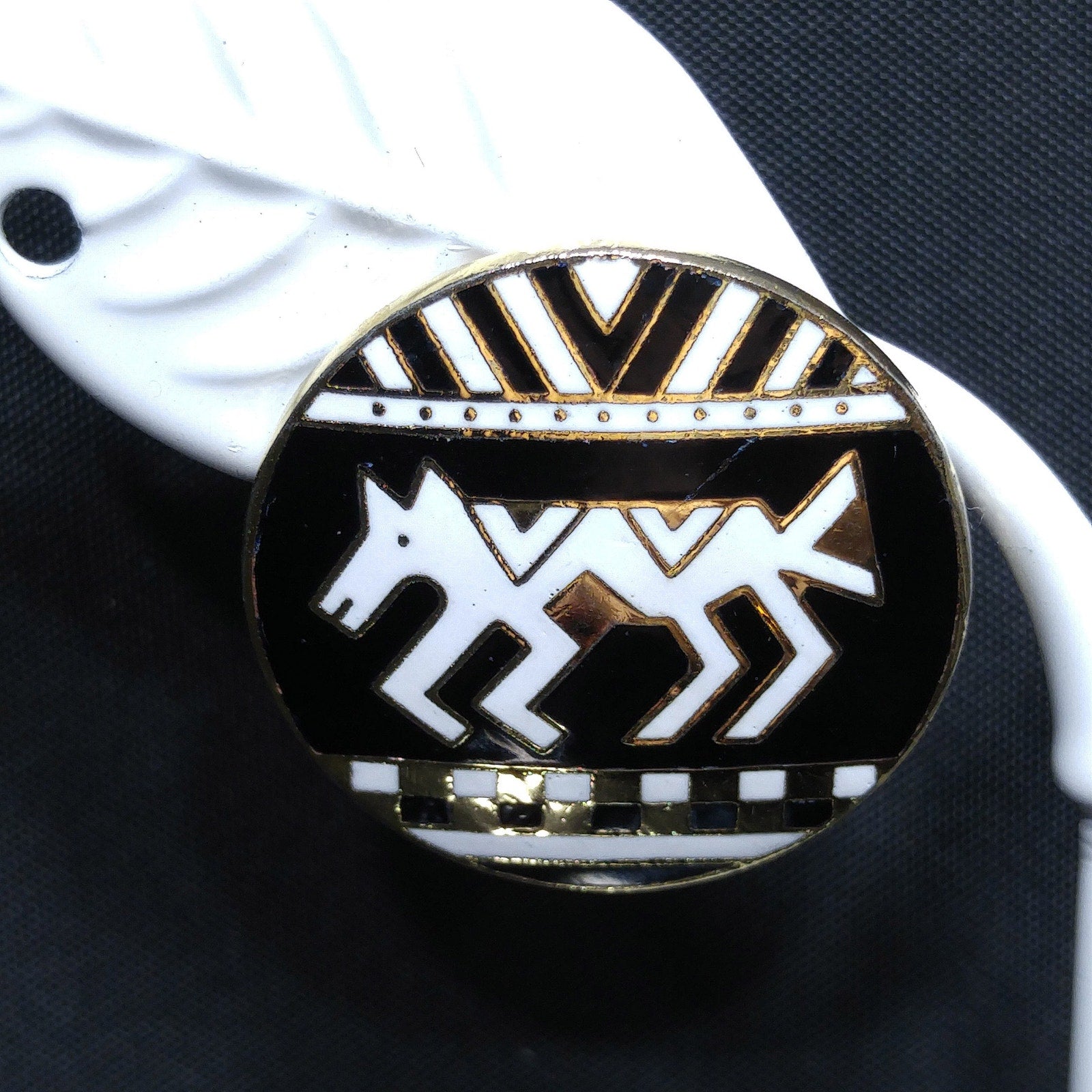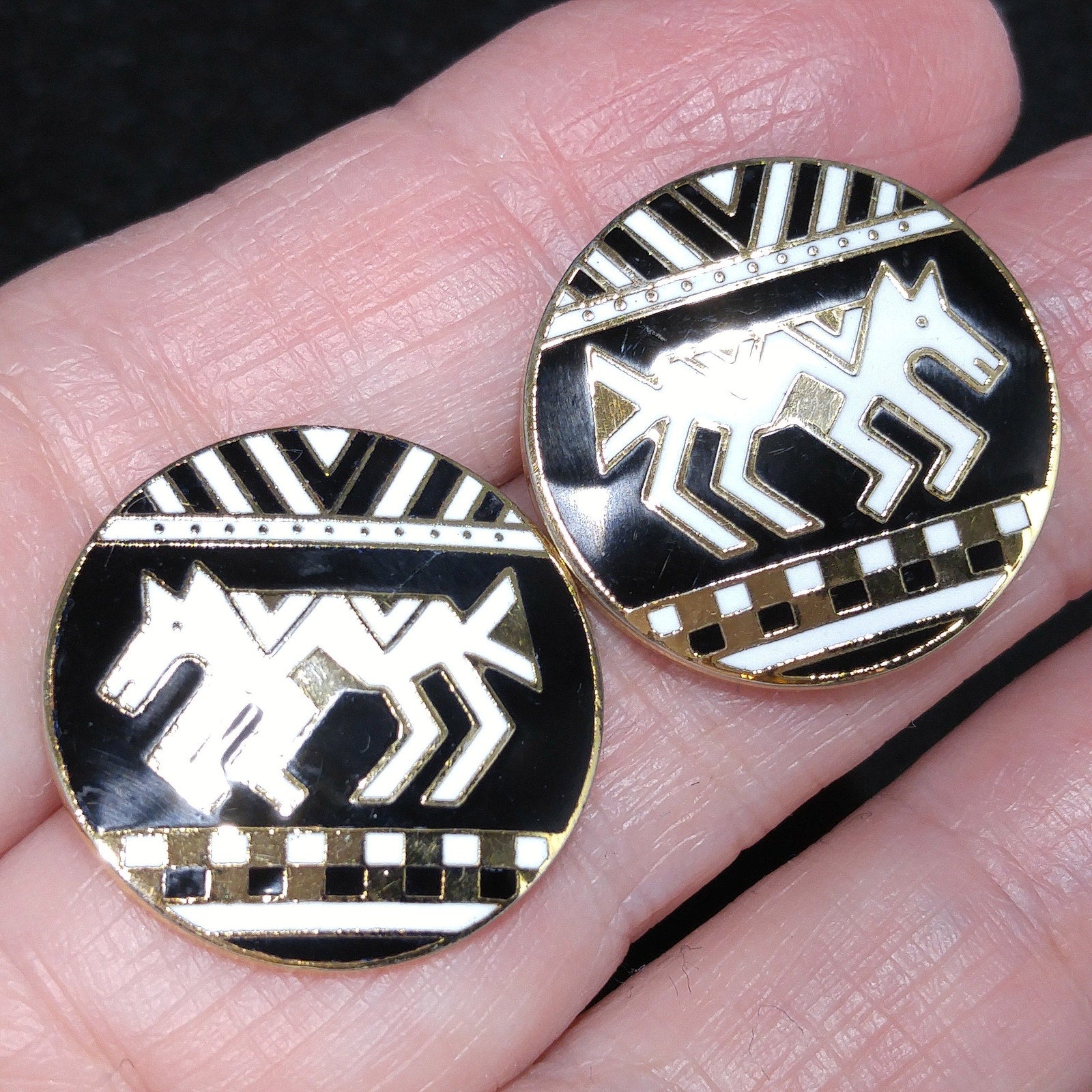Laurel Burch "Coptic Horse" Earrings, Gold Plated, Black & White Enamel, 1980s