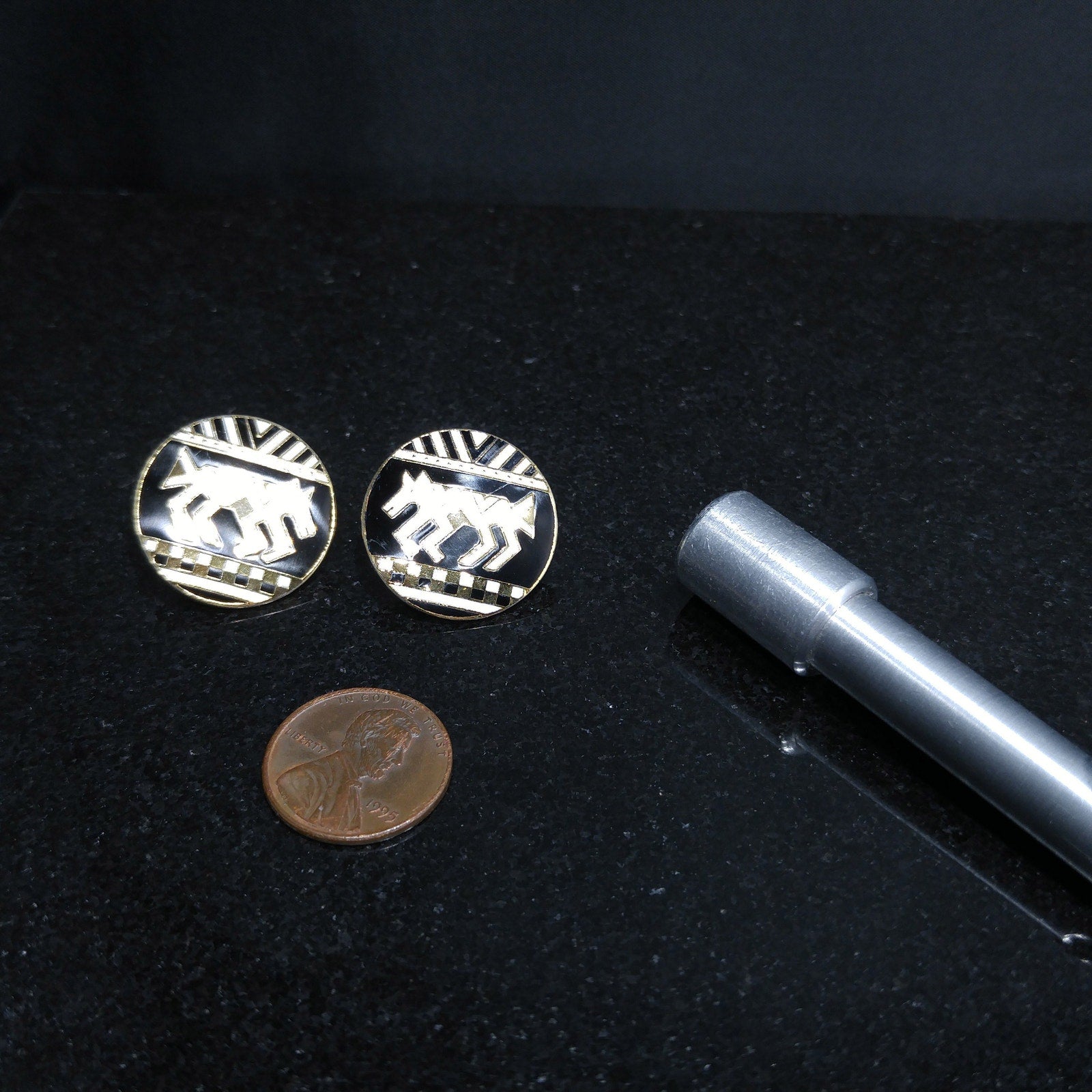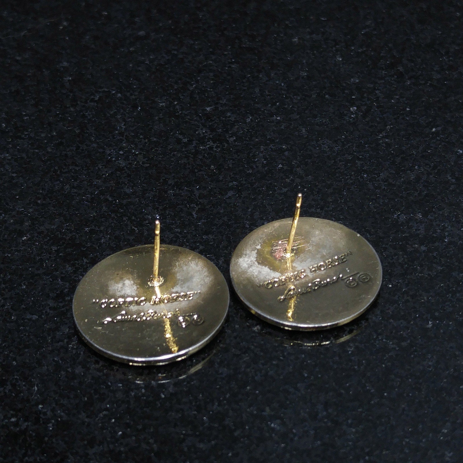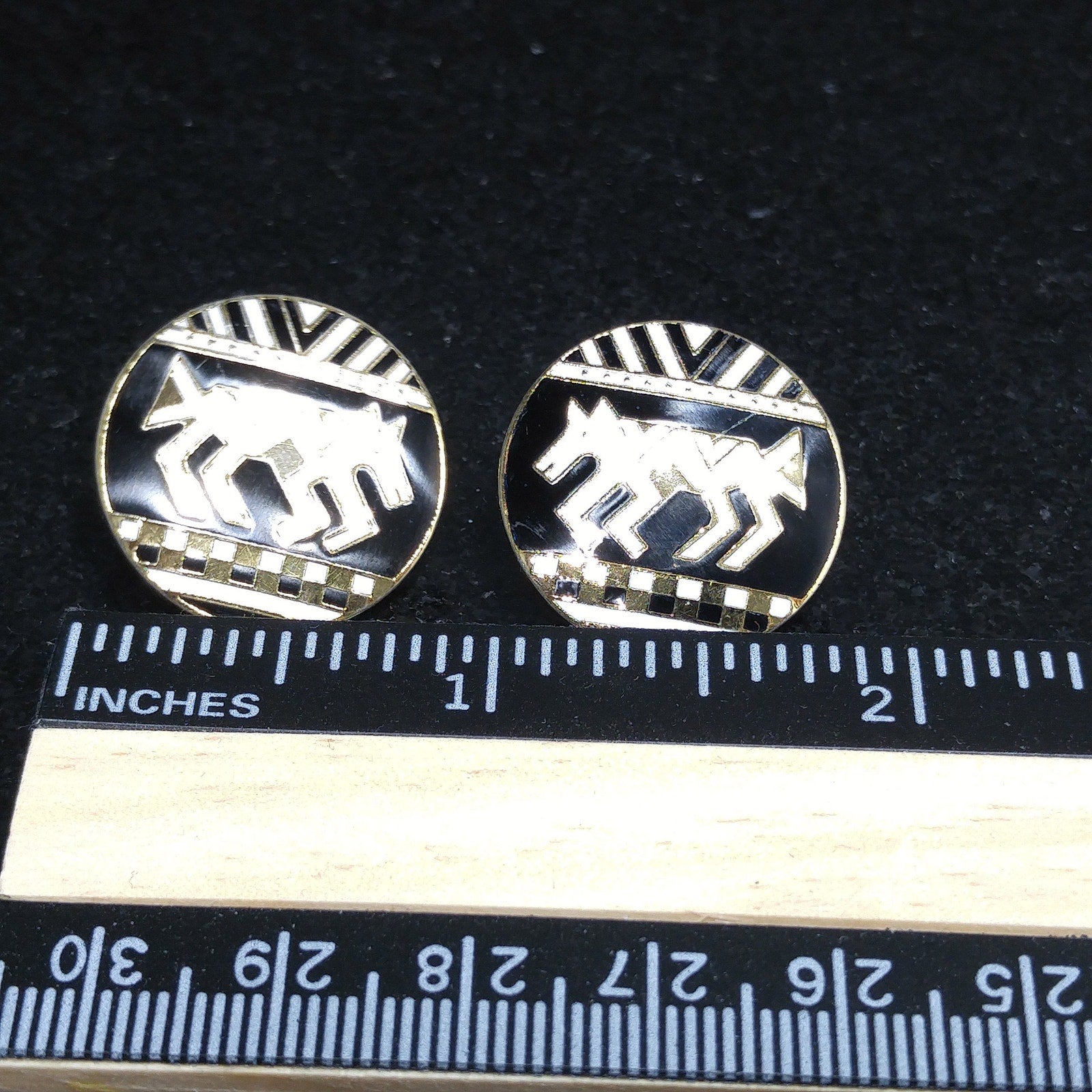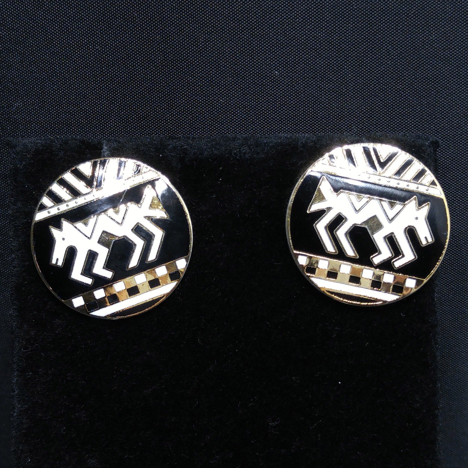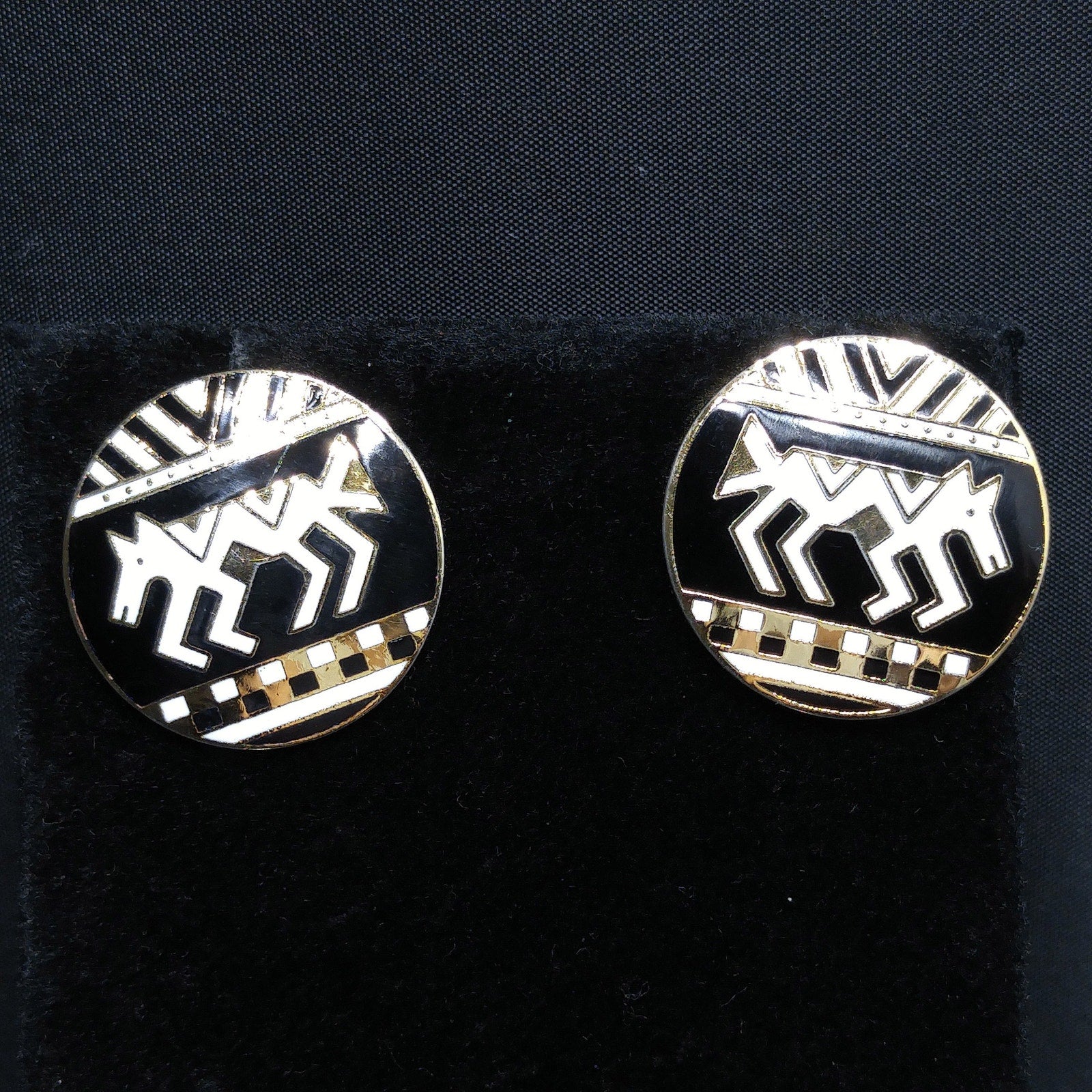 *Description: This is a great pair of Laurel Burch earrings from the 1980s entitled "Coptic Horse". The design and the designer are stamped on the back of each earring. The gold plate is used on the backing and through the cloisonne outlines which is filled in with black and white enamel. This is a great vintage pair of Laurel Burch post earrings.