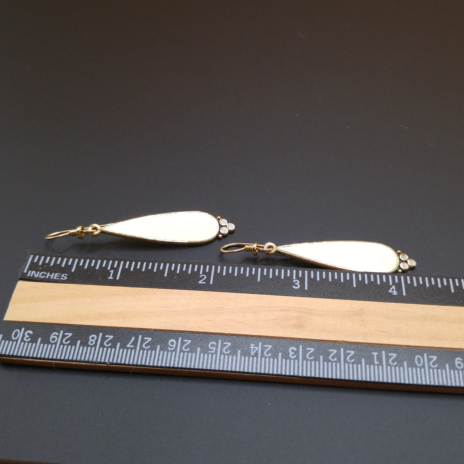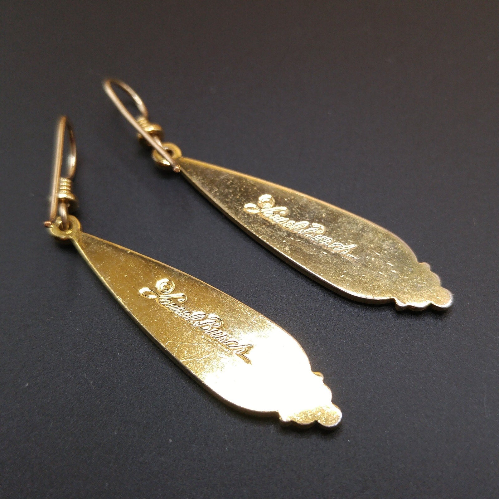 *Description: This is a beautiful pair of Laurel Burch creamy white enamel teardrop earrings with three dots, slightly greyer, at the bottom on a gold plated backing from the 1980s. The earrings have gold filled ear wires and each earrings is stamped Laurel Burch. This would be a great addition to your vintage jewelry collection or make a great vintage gift!