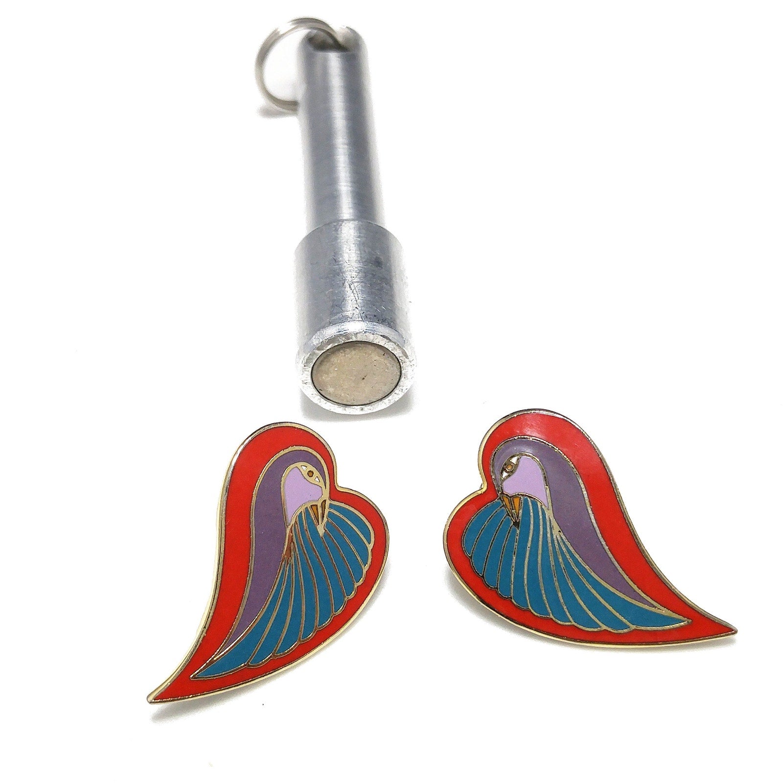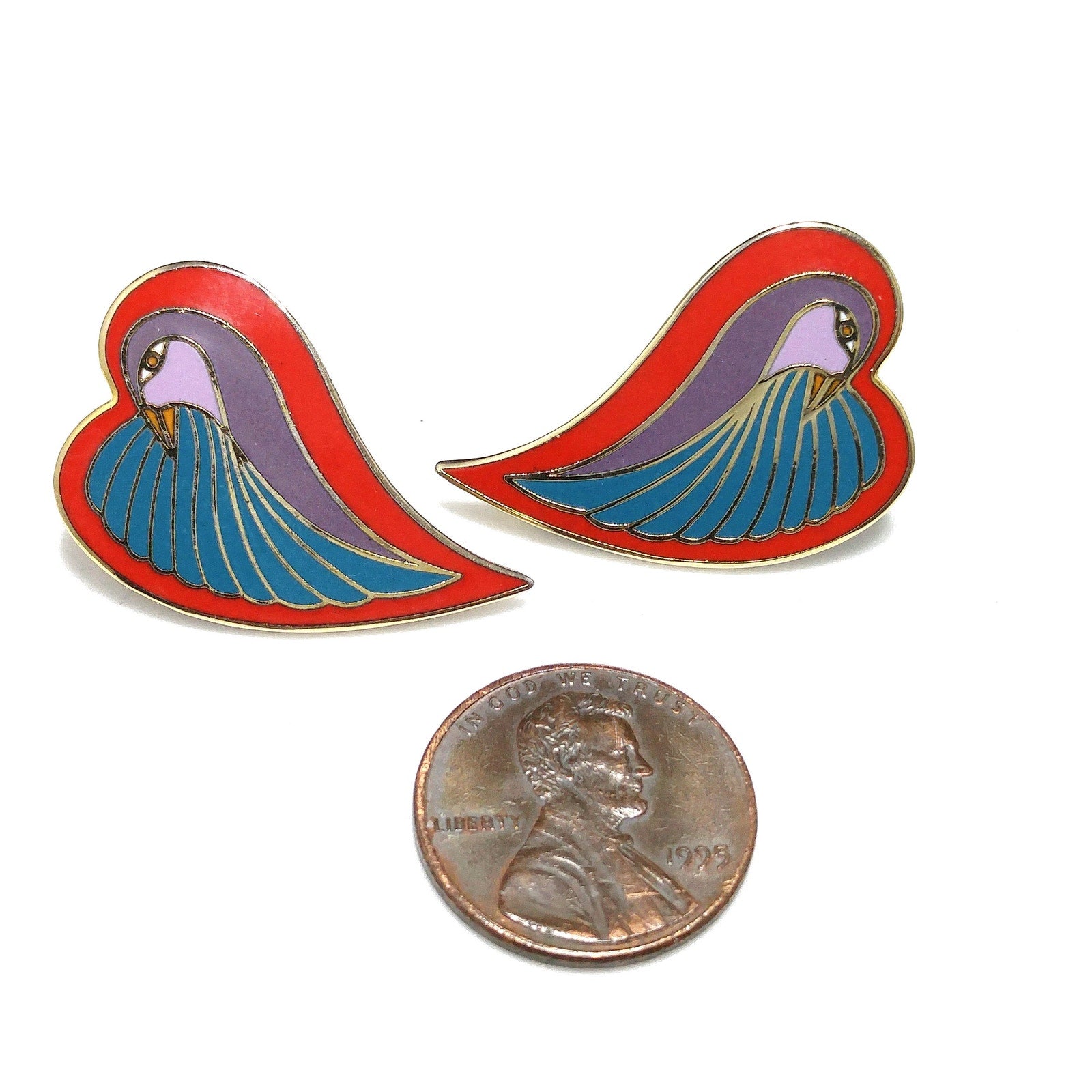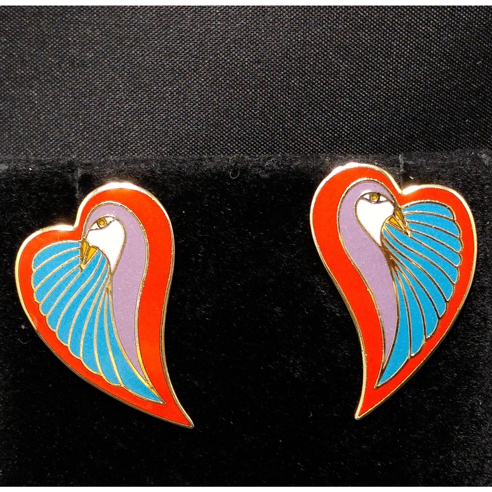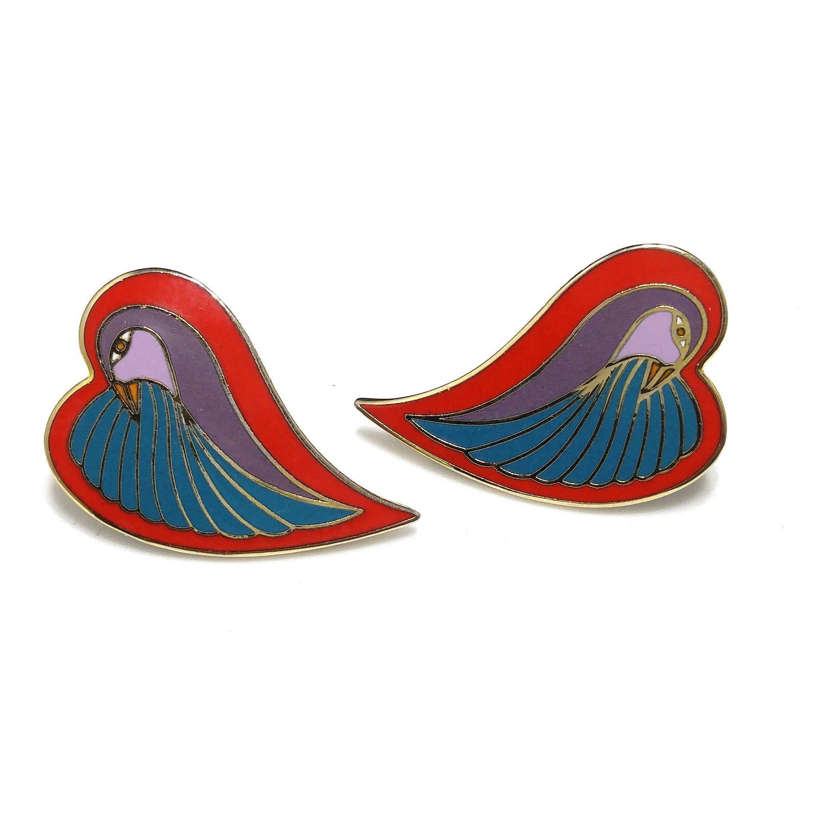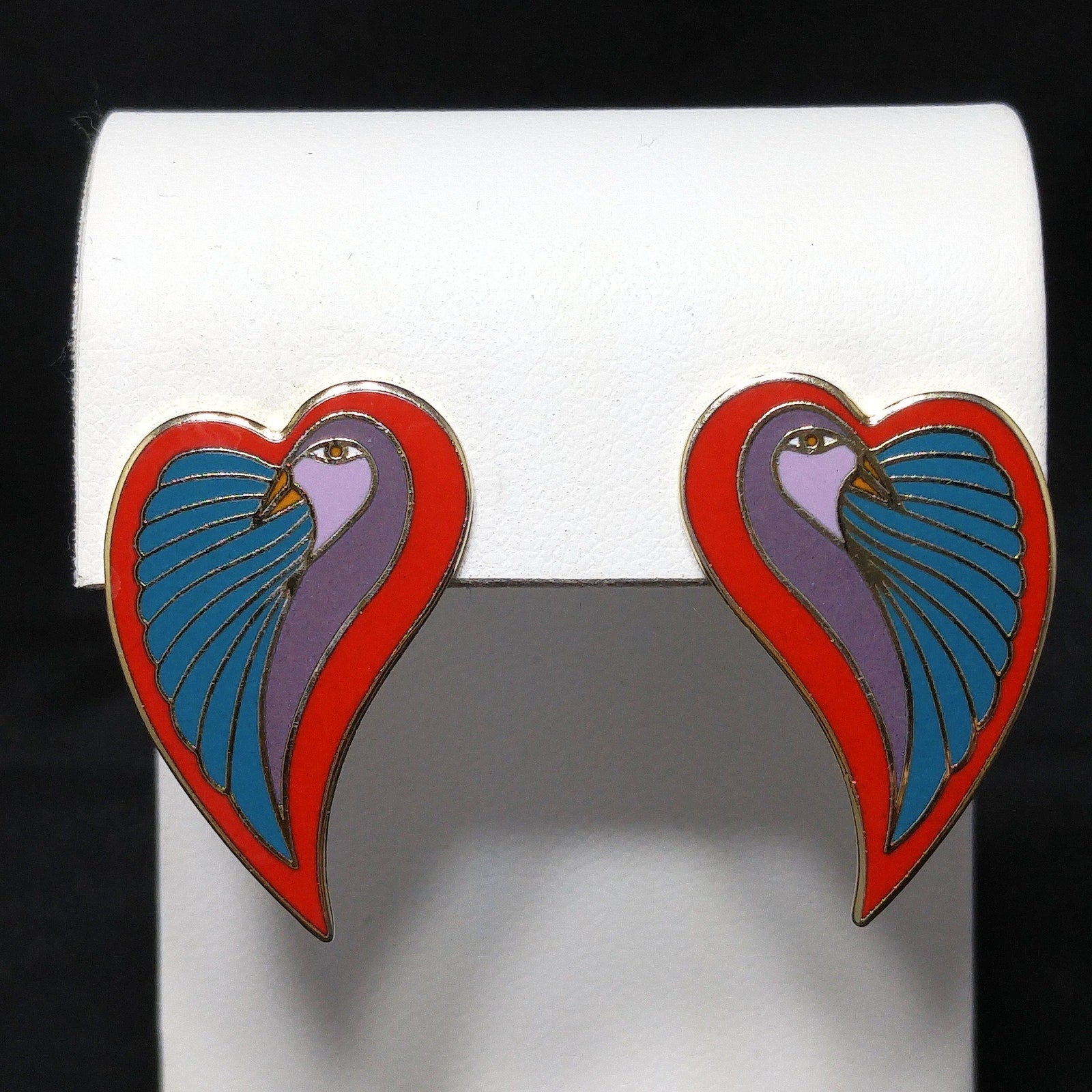 *Description: This is a great pair of Laurel Burch bird theme earrings entitled "Dove Heart" from the 1980s. The earrings are curved red enamel hearts with a dove in purple, lavender, and teal enamel, outlined in gold plated cloisonne design. This would be a great addition to your vintage jewelry collection or make a great vintage gift!