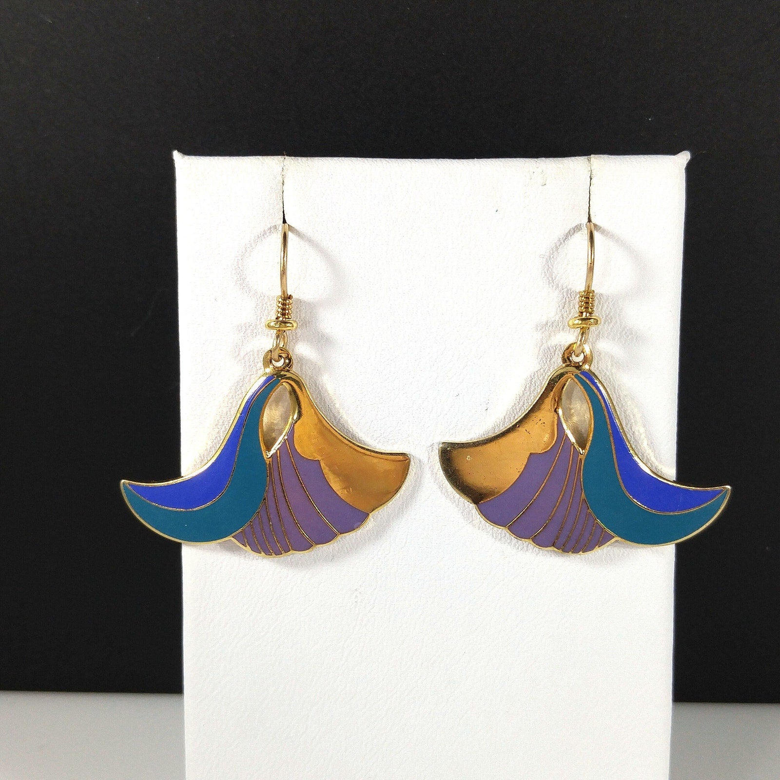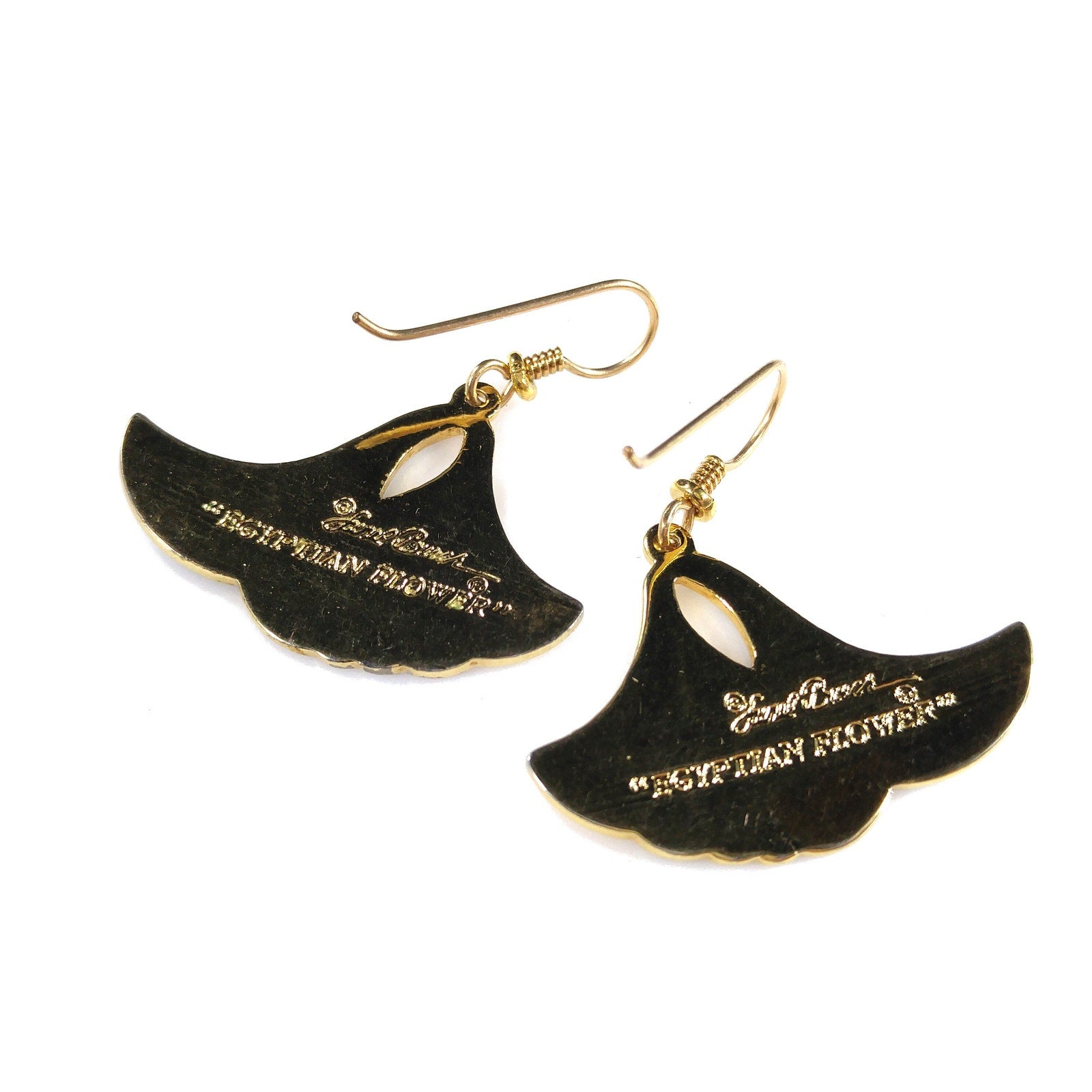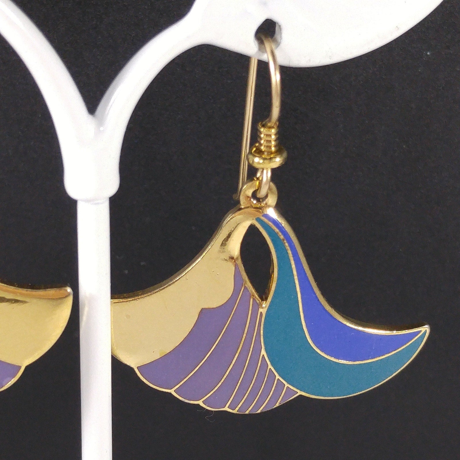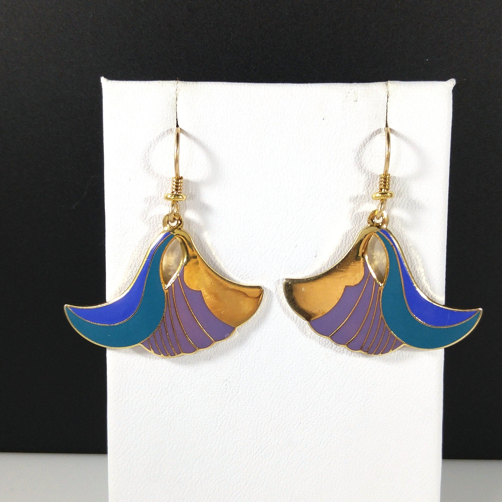 Laurel Burch "Egyptian Flower" Dangle Earrings, Gold Plated Cloisonne, Enamel Teal Purple, 1980s Vintage Jewelry