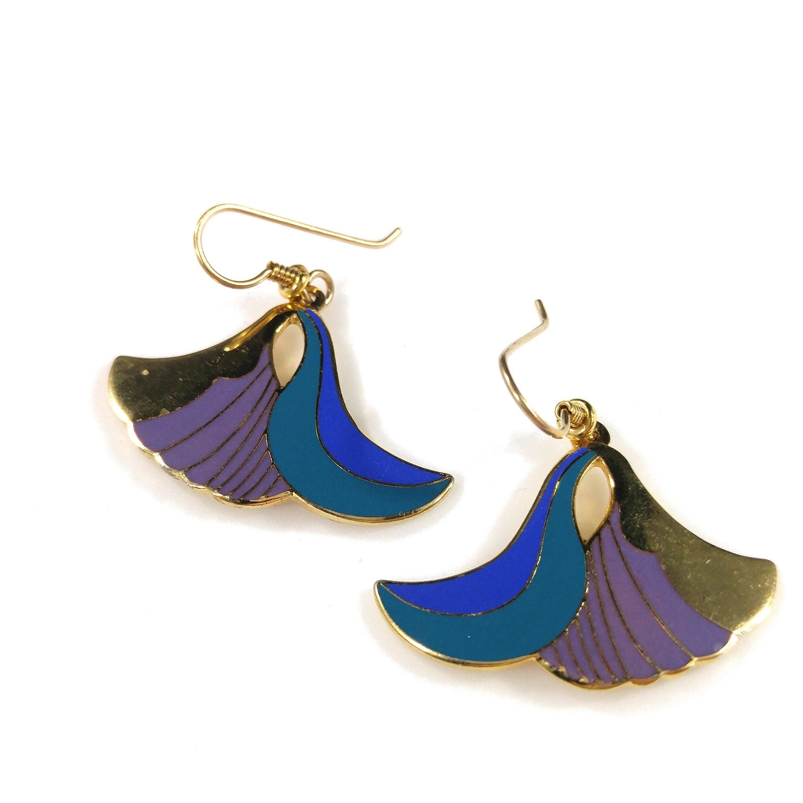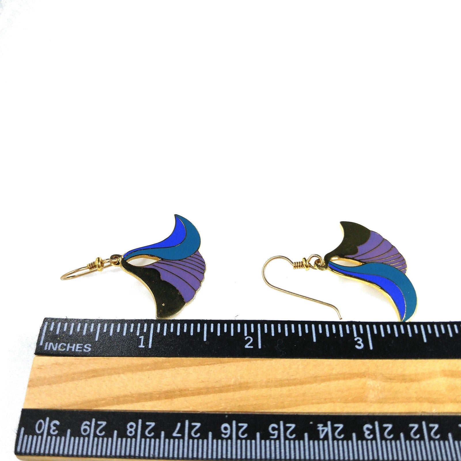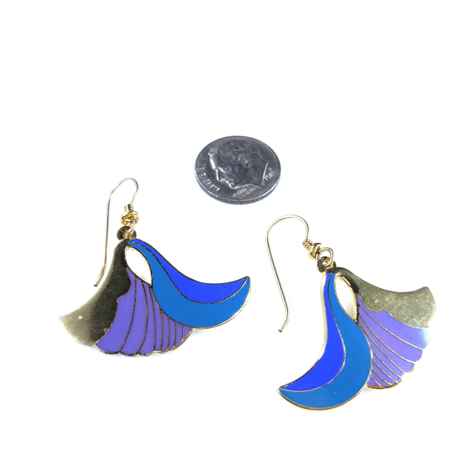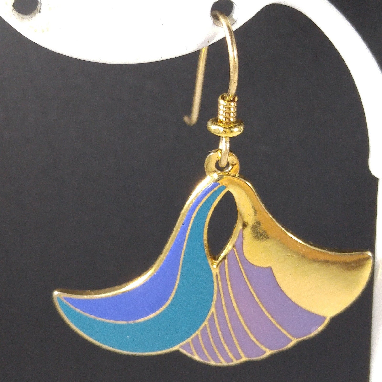 Laurel Burch "Egyptian Flower" Dangle Earrings, Gold Plated Cloisonne, Enamel Teal Purple, 1980s Vintage Jewelry