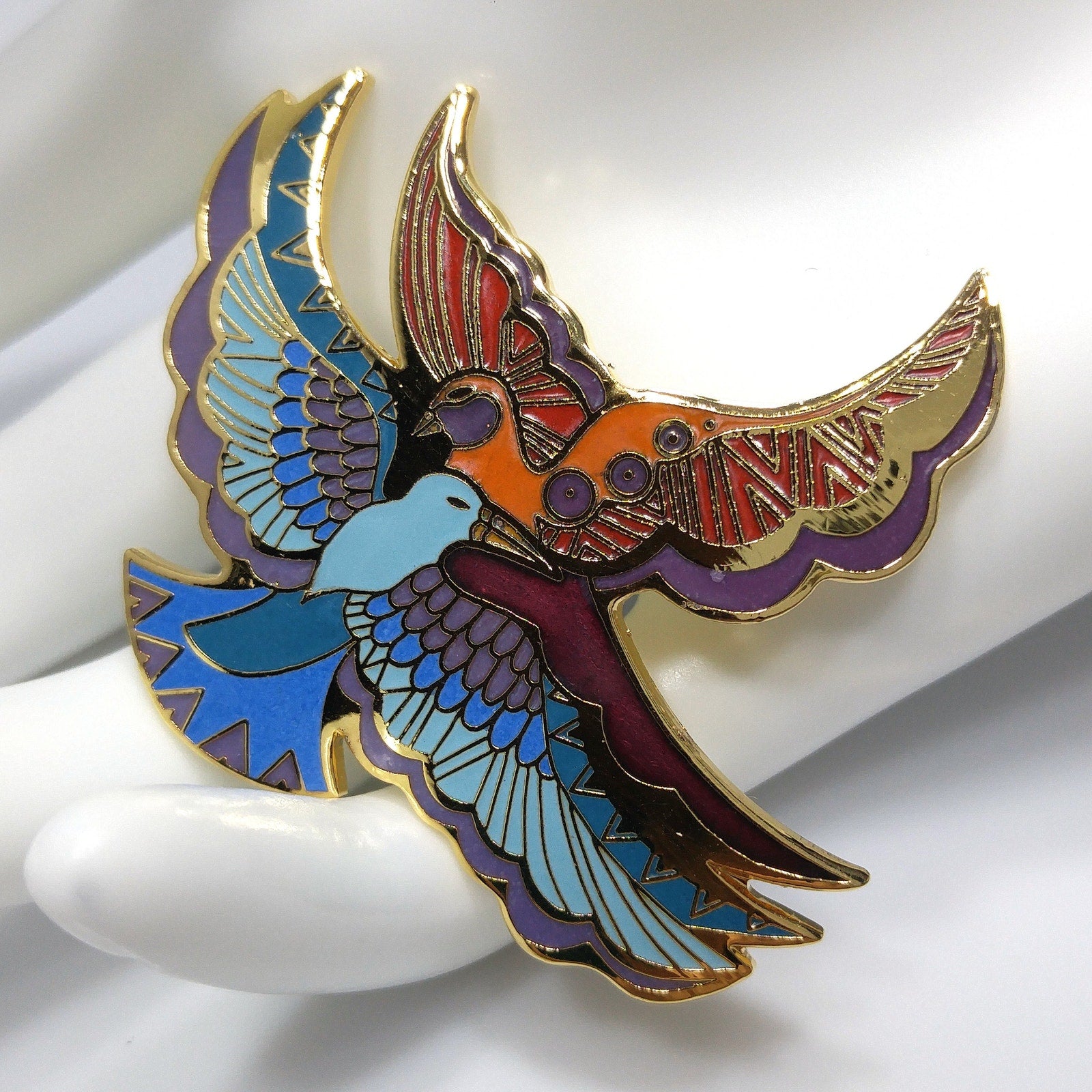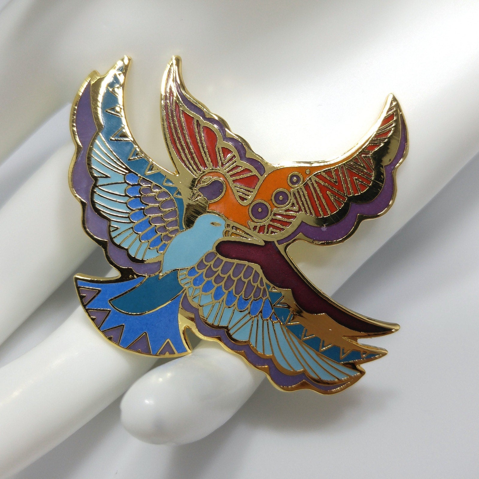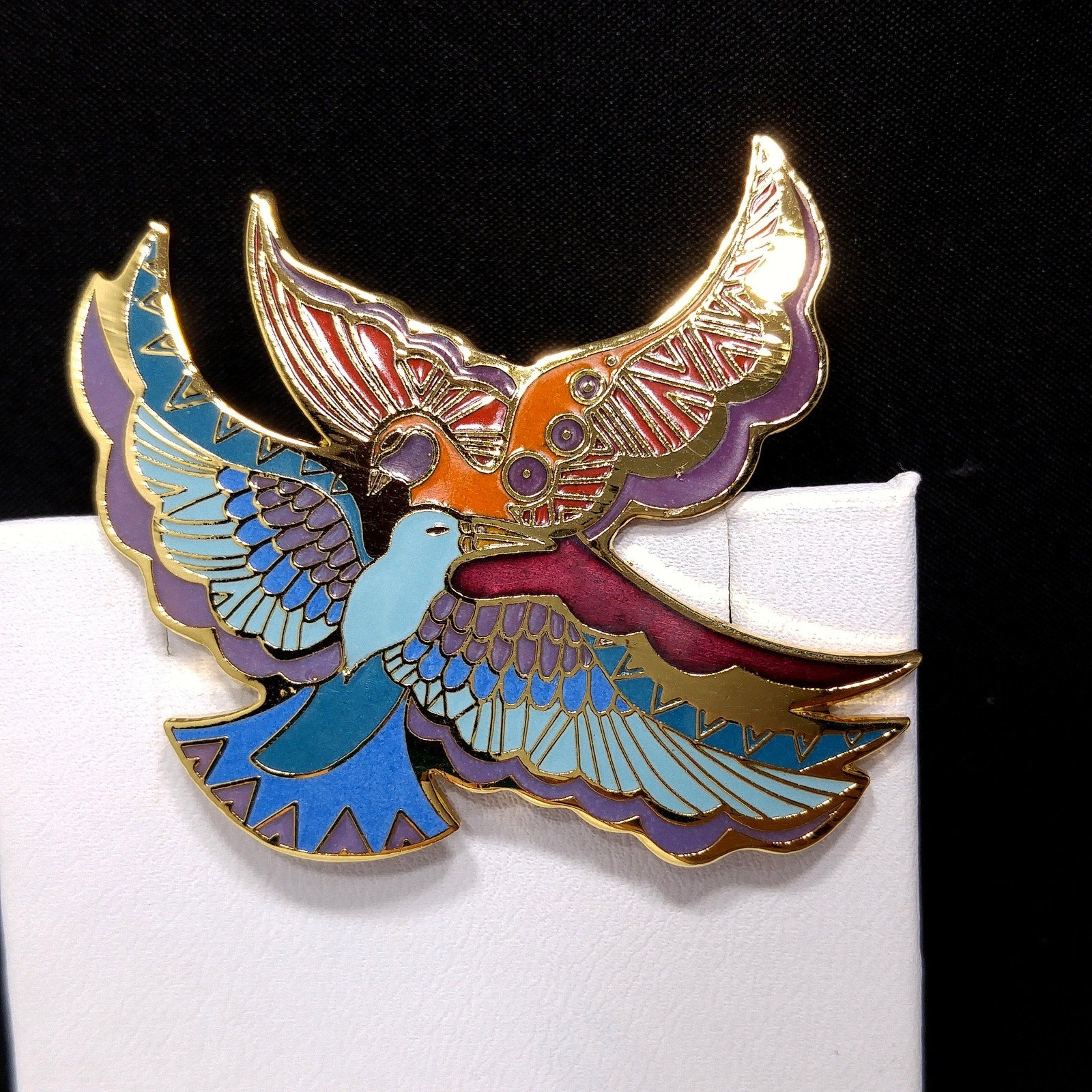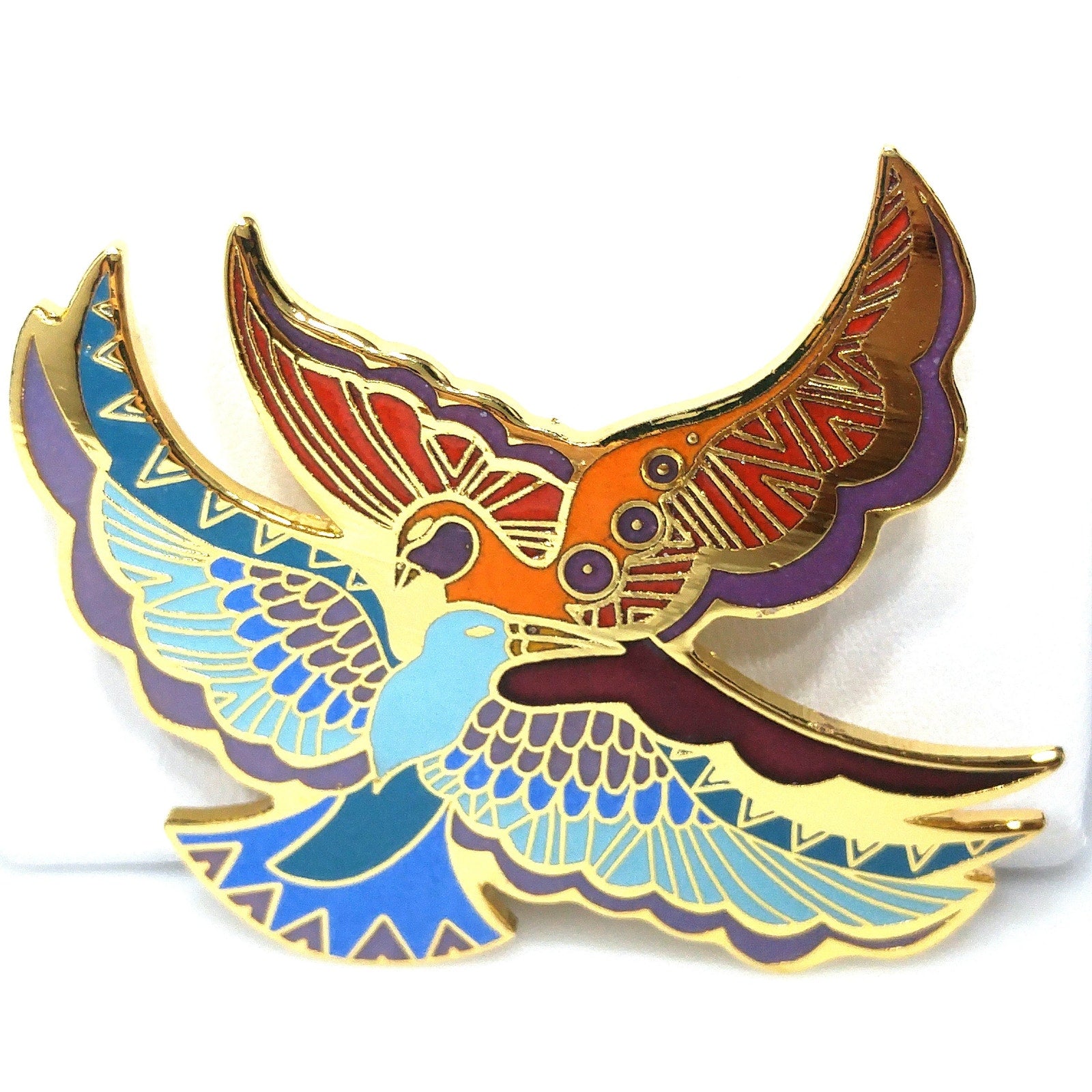 *Description: This is a beautiful Laurel Burch brooch entitled "Ethereal Birds" from the 1980s. It has gold plated cloisonné and backing with enamel in metallic purple, purple, red, orange, teal, blue, and light blue; all decorating the feathers of two gorgeous birds in flight. The brooch is in great condition and would be a great addition to your vintage jewelry collection or make a great vintage gift!