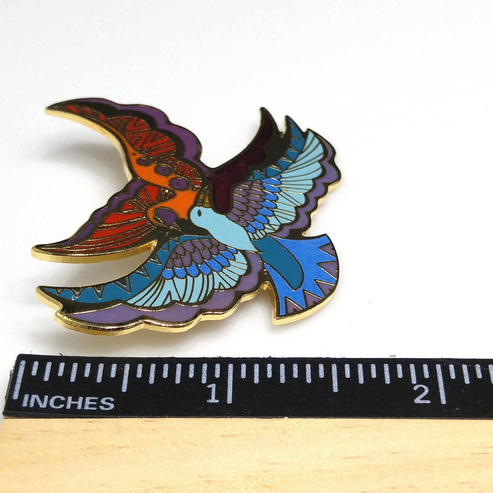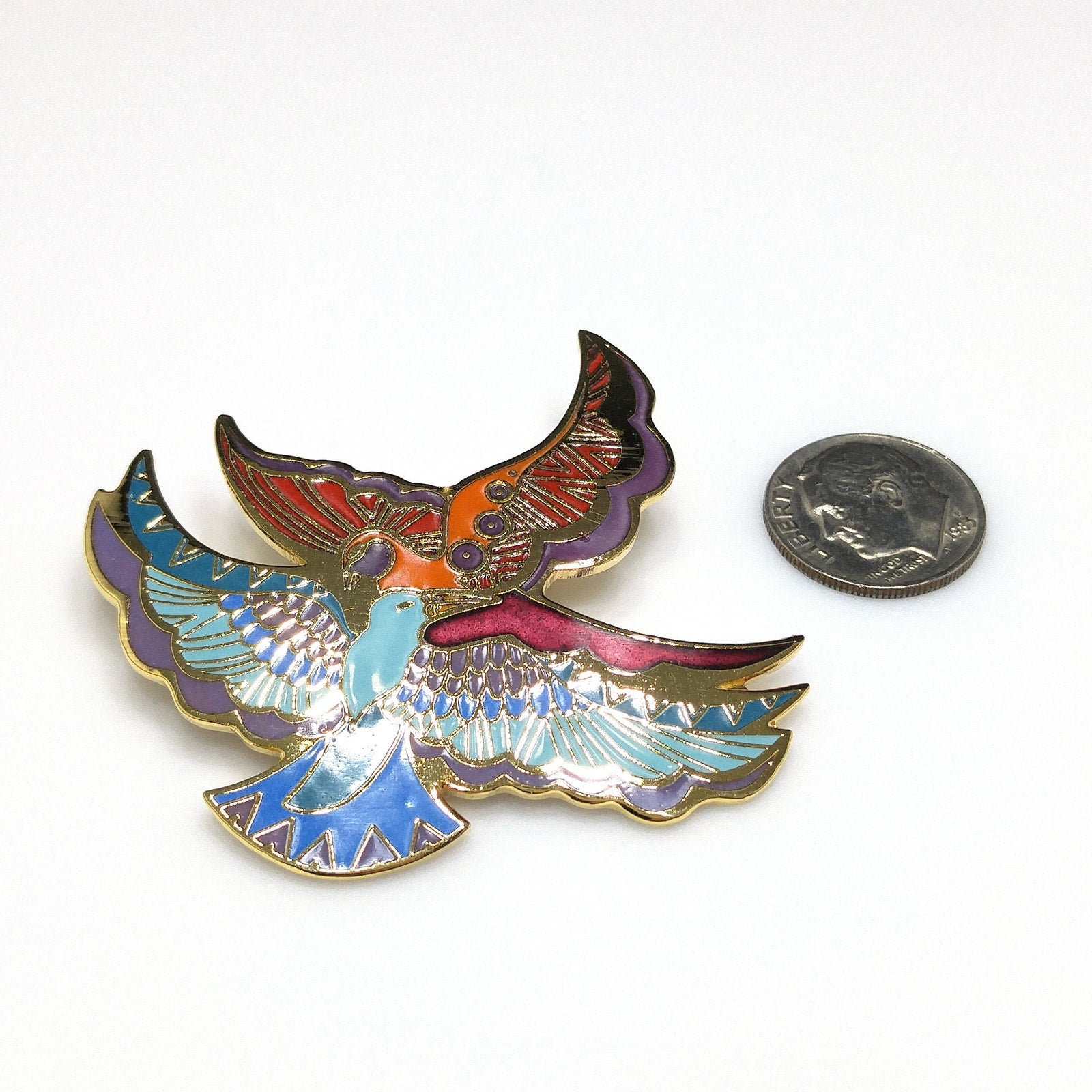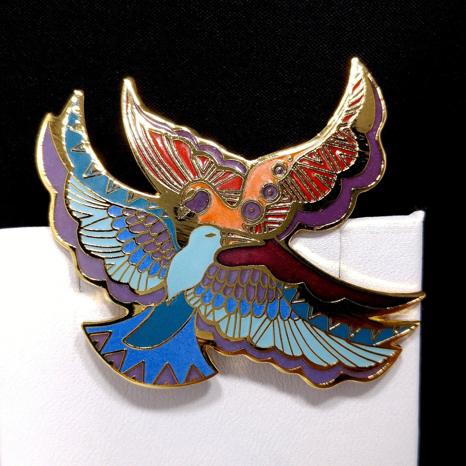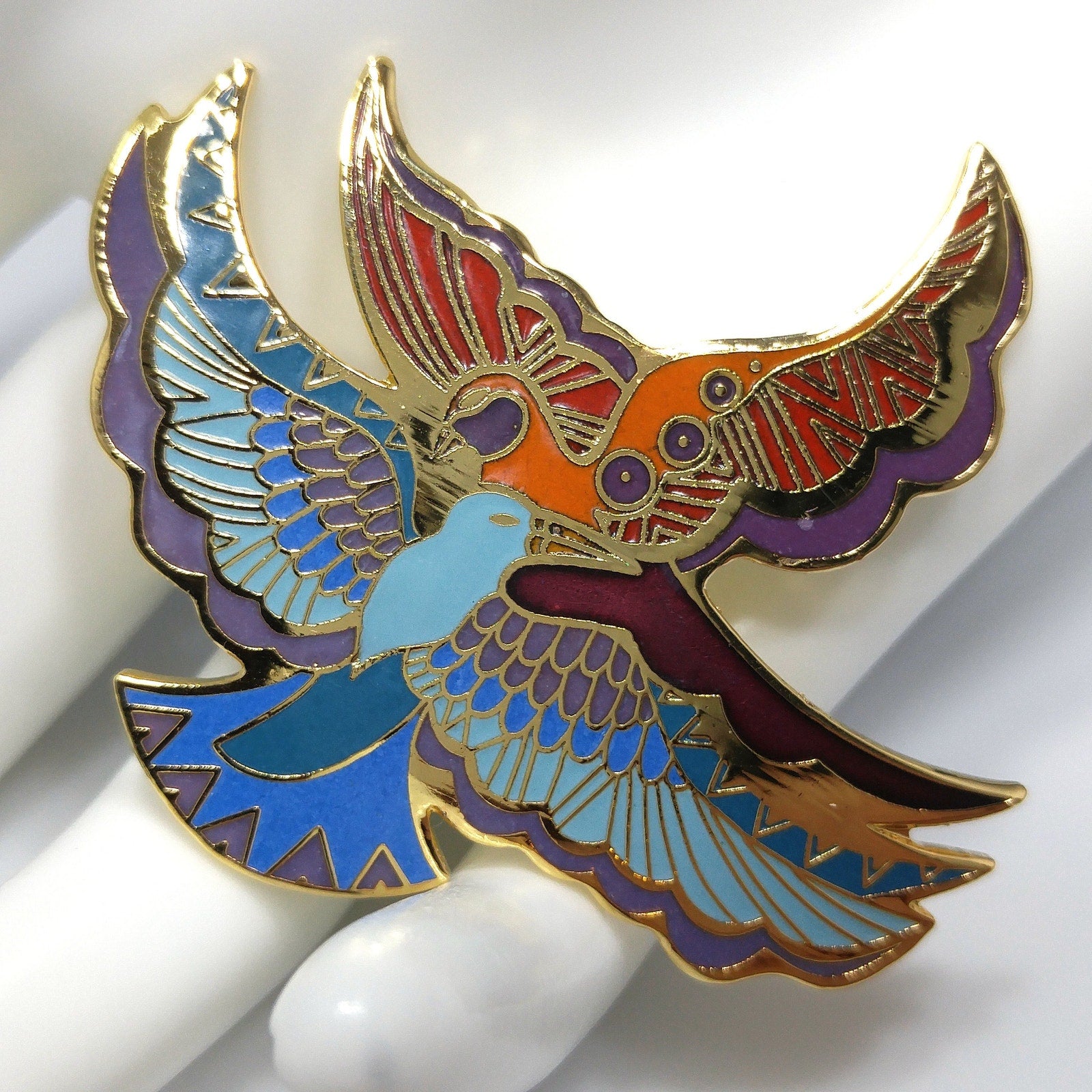 *Description: This is a beautiful Laurel Burch brooch entitled "Ethereal Birds" from the 1980s. It has gold plated cloisonné and backing with enamel in metallic purple, purple, red, orange, teal, blue, and light blue; all decorating the feathers of two gorgeous birds in flight. The brooch is in great condition and would be a great addition to your vintage jewelry collection or make a great vintage gift!