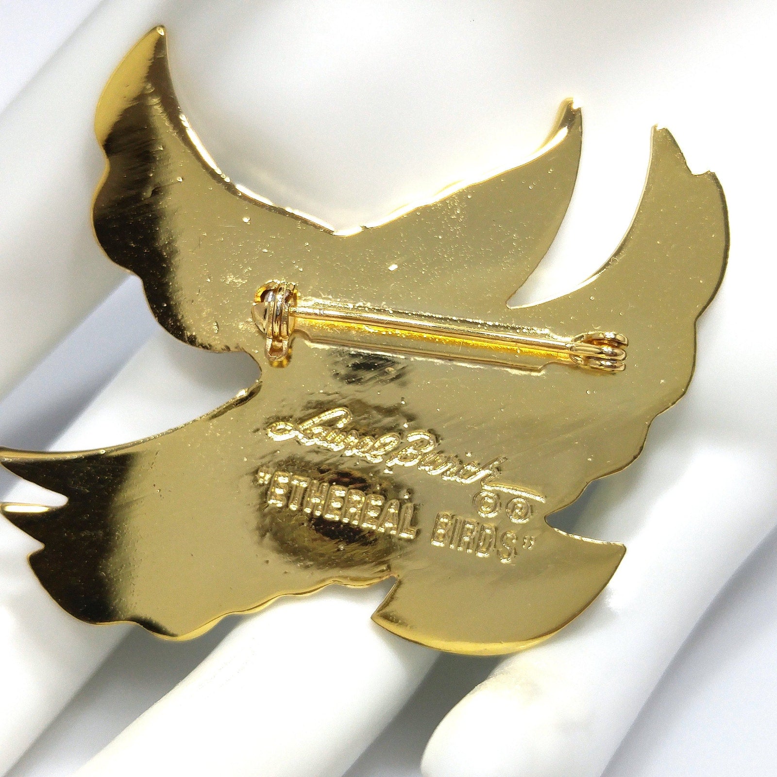 Laurel Burch "Ethereal Birds" Brooch, Cloisonné and Enamel, Gold Plated, 1980s Vintage Jewelry