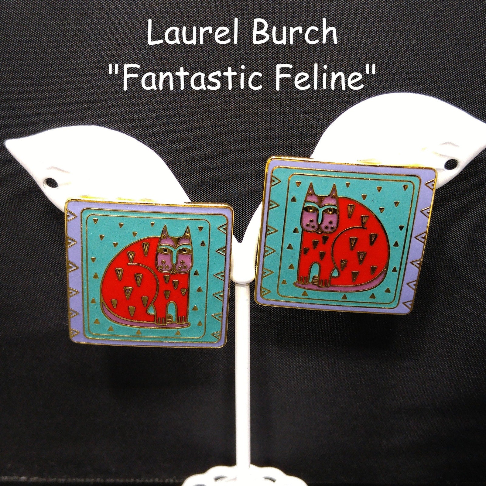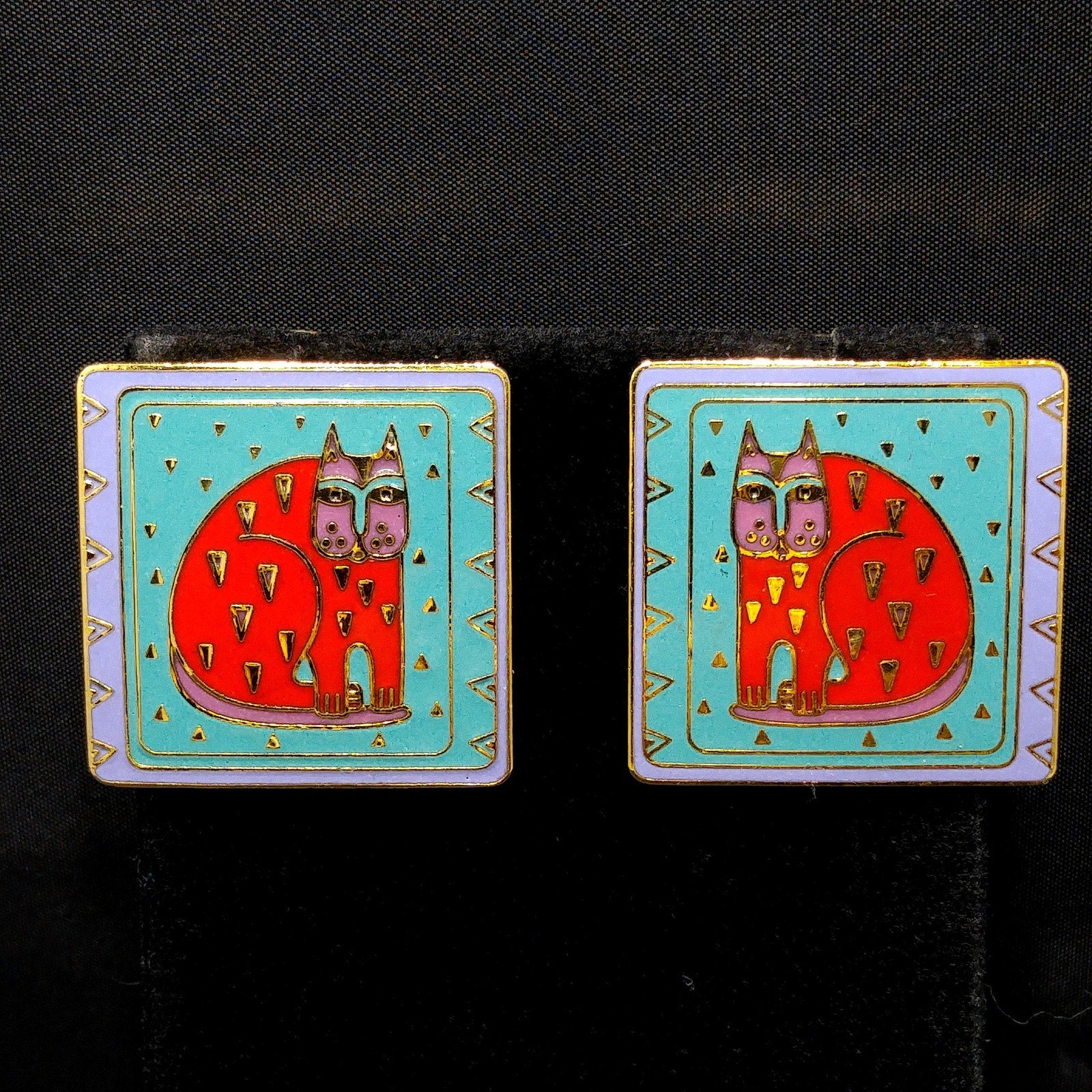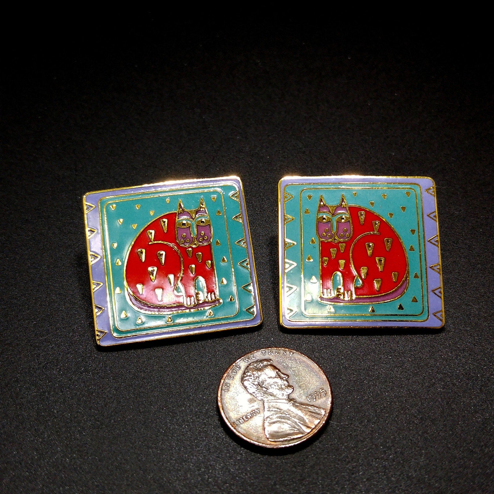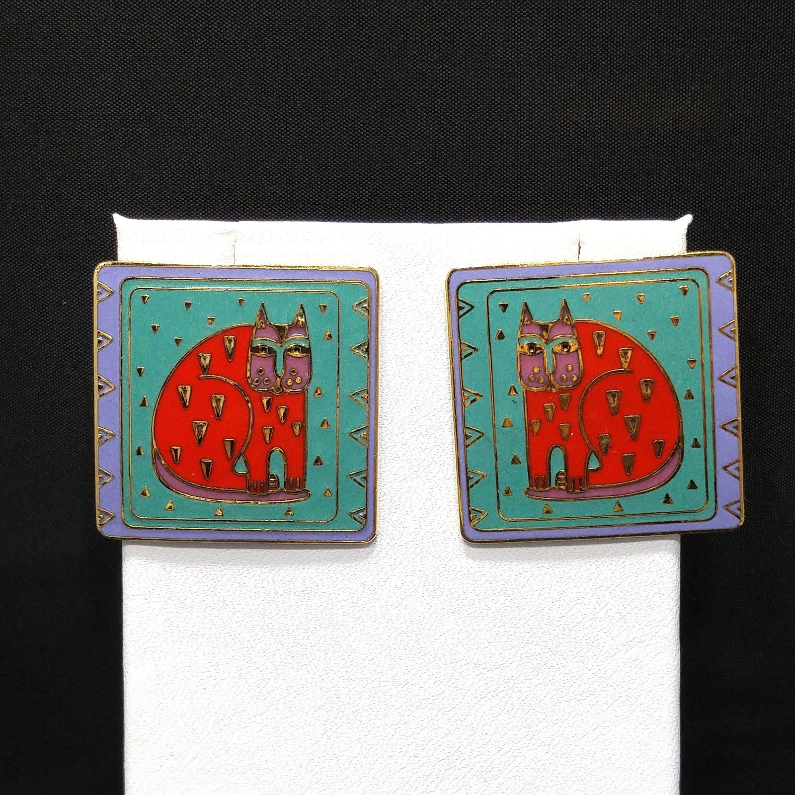 *Description: This is a great pair of Laurel Burch "Fantastic Felines" large post earrings from the 1980s. The gold plated cloisonne and backing have a red enamel cat on each earring with a purple face and tail with markings and background in teal green. Each earring has little gold triangles on the cat and gold hearts in the background on the teal enamel. Each earring is framed with the purple enamel. This design is difficult to find and the backs show some prior wear but no plating damage. The posts are 14K gold filled. This would be a great addition to your vintage jewelry collection or make a great vintage gift!
