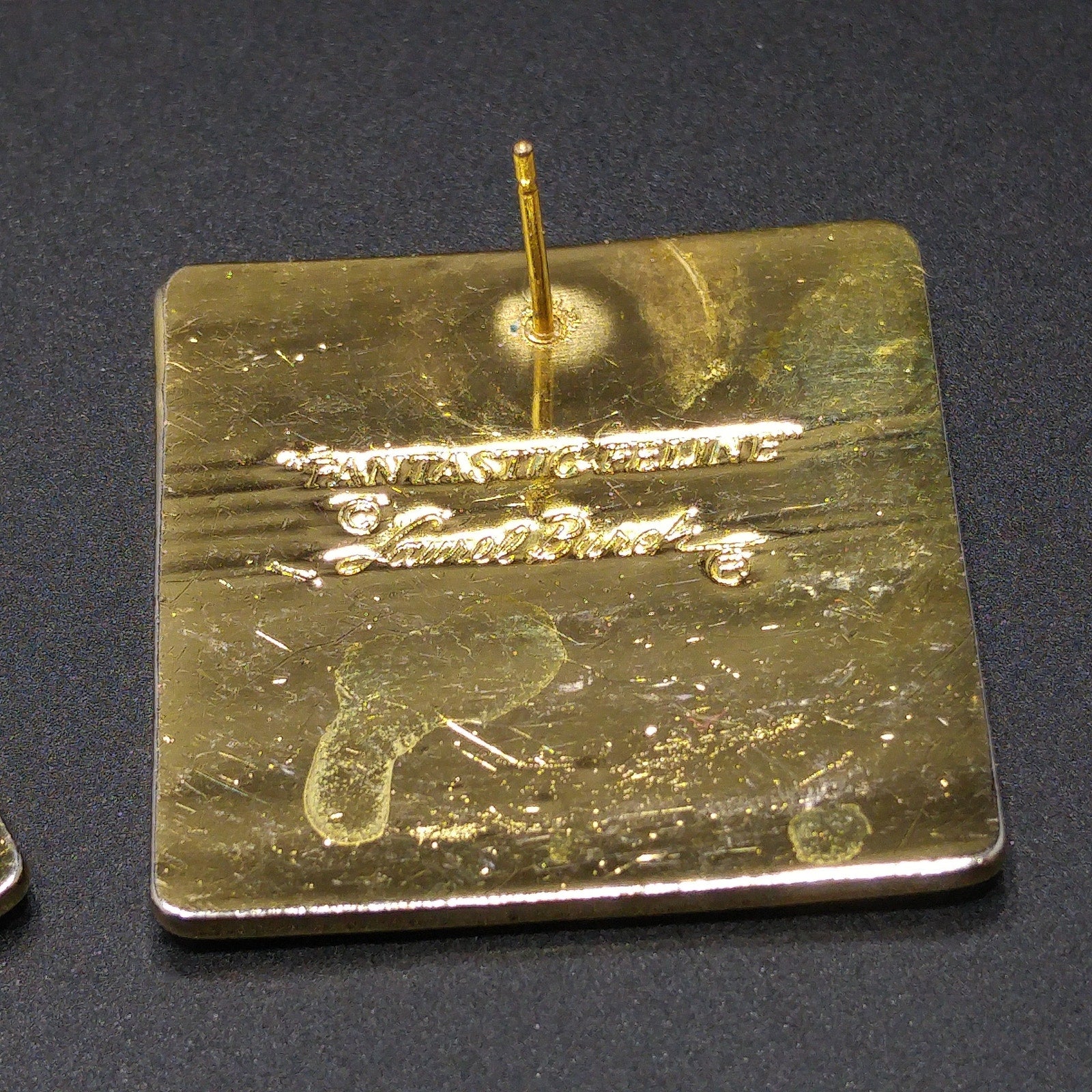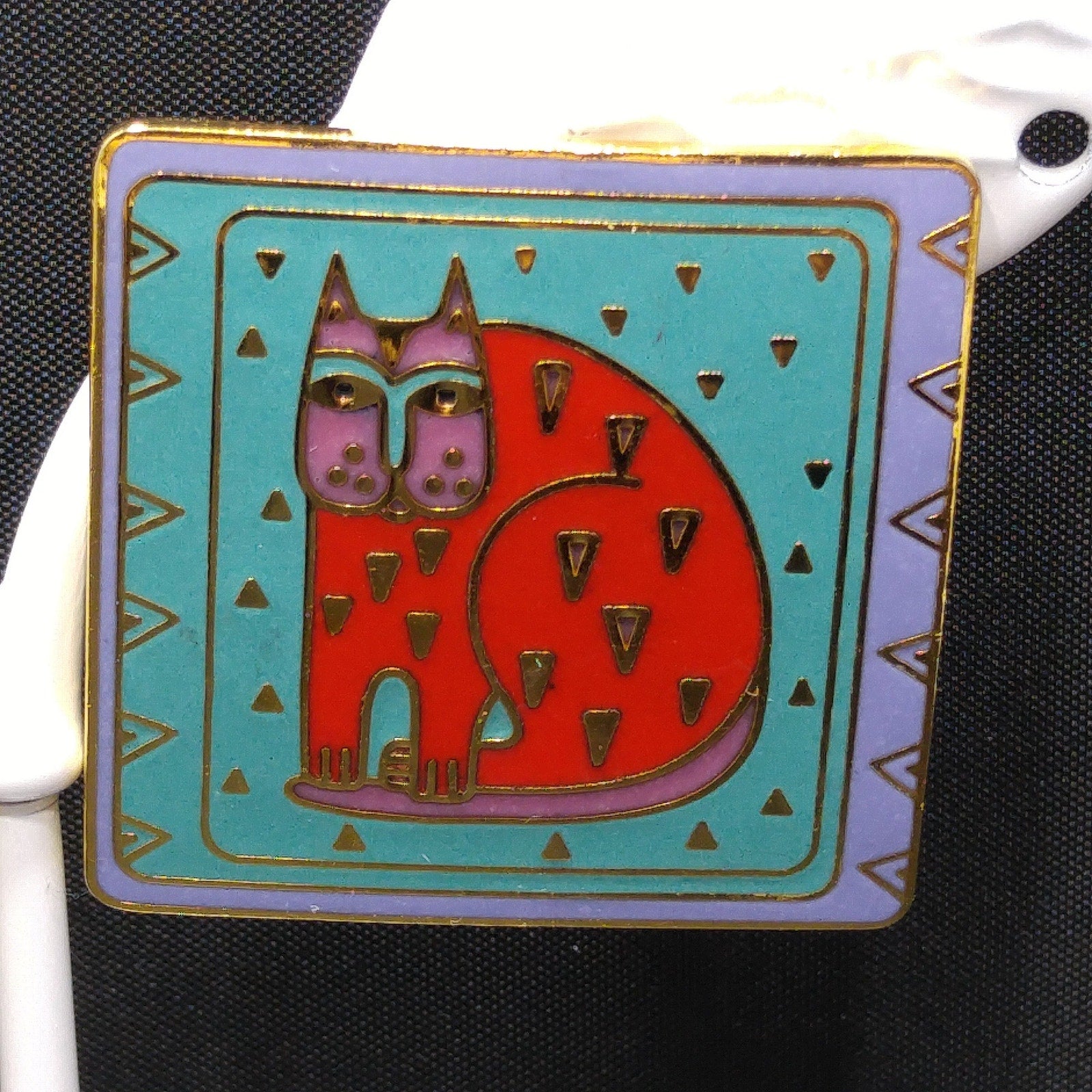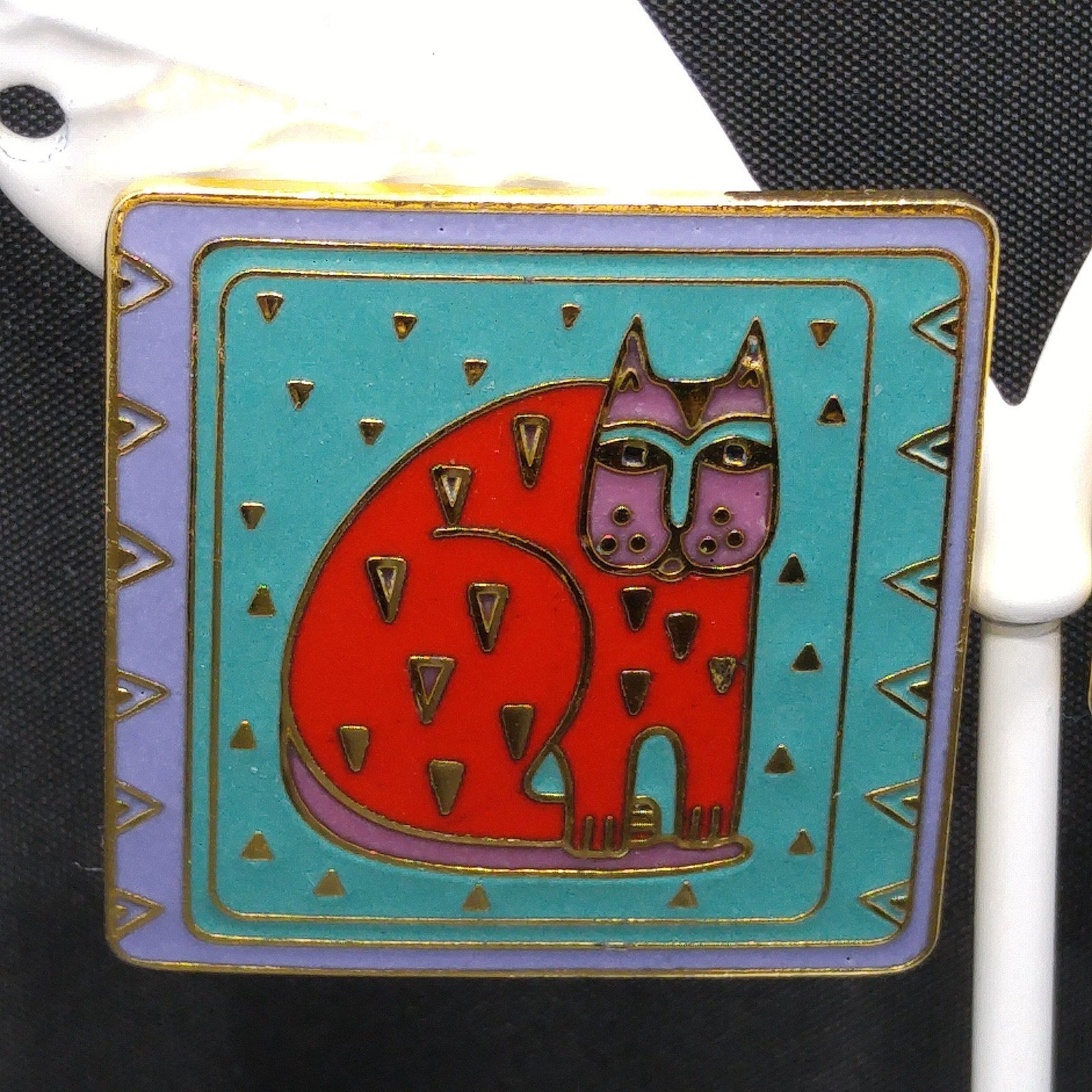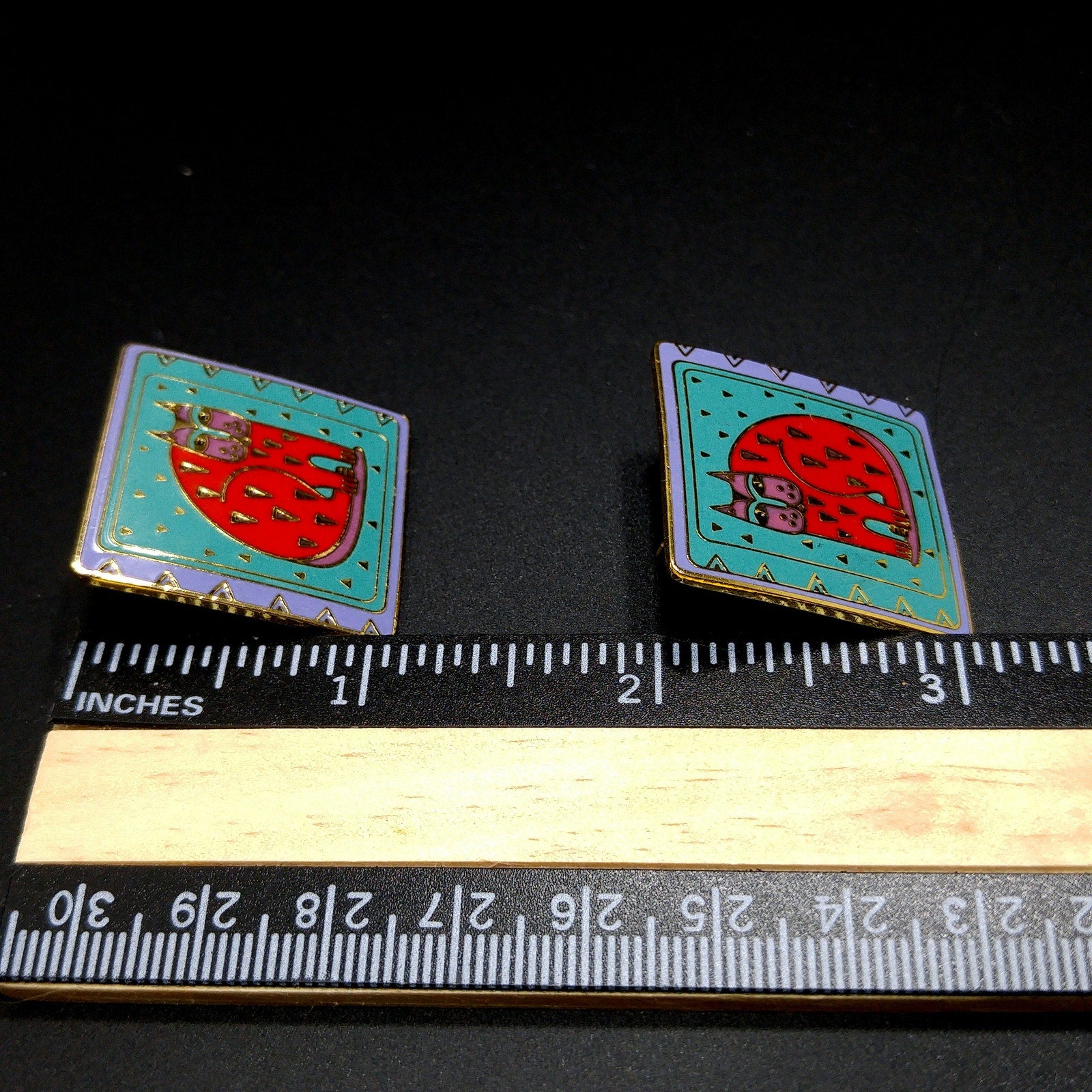 *Description: This is a great pair of Laurel Burch "Fantastic Felines" large post earrings from the 1980s. The gold plated cloisonne and backing have a red enamel cat on each earring with a purple face and tail with markings and background in teal green. Each earring has little gold triangles on the cat and gold hearts in the background on the teal enamel. Each earring is framed with the purple enamel. This design is difficult to find and the backs show some prior wear but no plating damage. The posts are 14K gold filled. This would be a great addition to your vintage jewelry collection or make a great vintage gift!