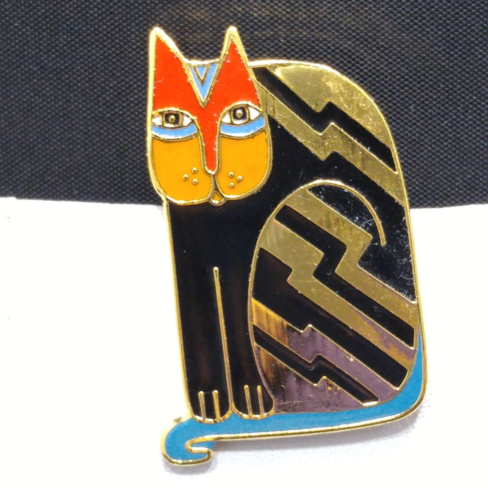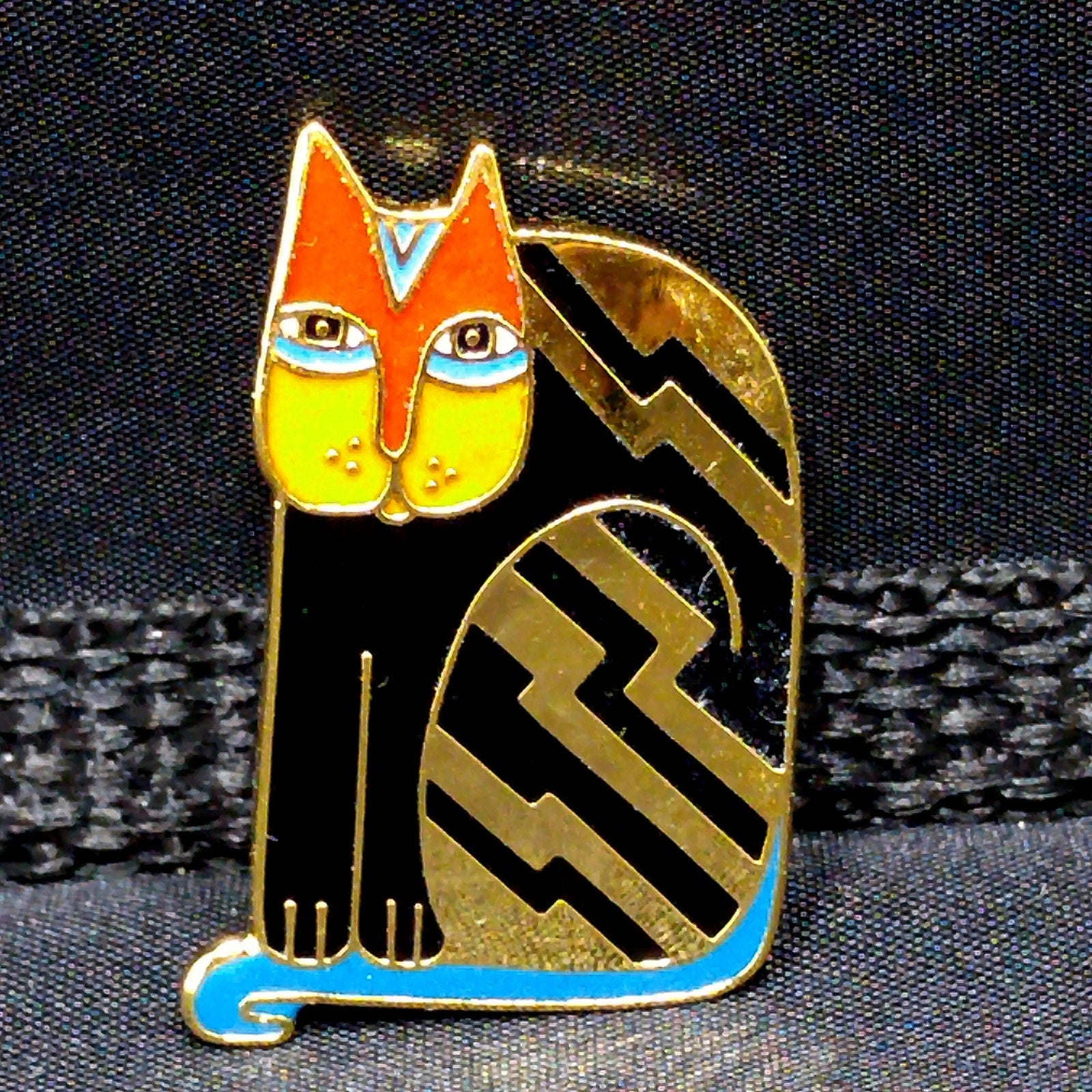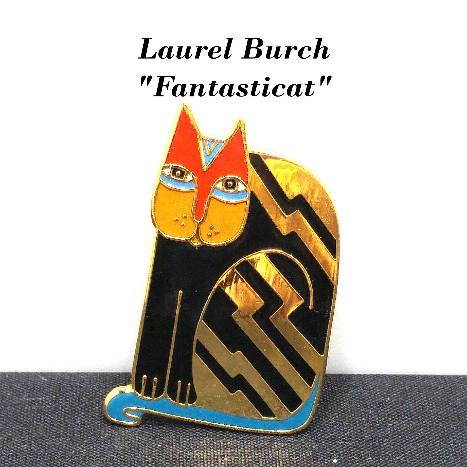 *Description: This is a great cat brooch by designer Laurel Burch entitled "FANTASTICAT" from the 1980s. The enamel cloisonne brooch is gold plated with enamel colors in black, teal, yellow, red, and blue. This is a perfect gift for someone who loves cats! This would be a great addition to your vintage jewelry collection or make a great vintage gift!
