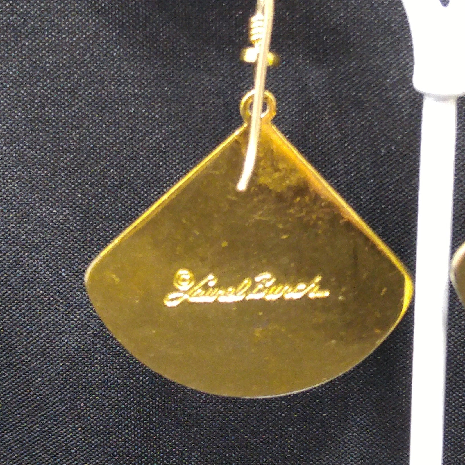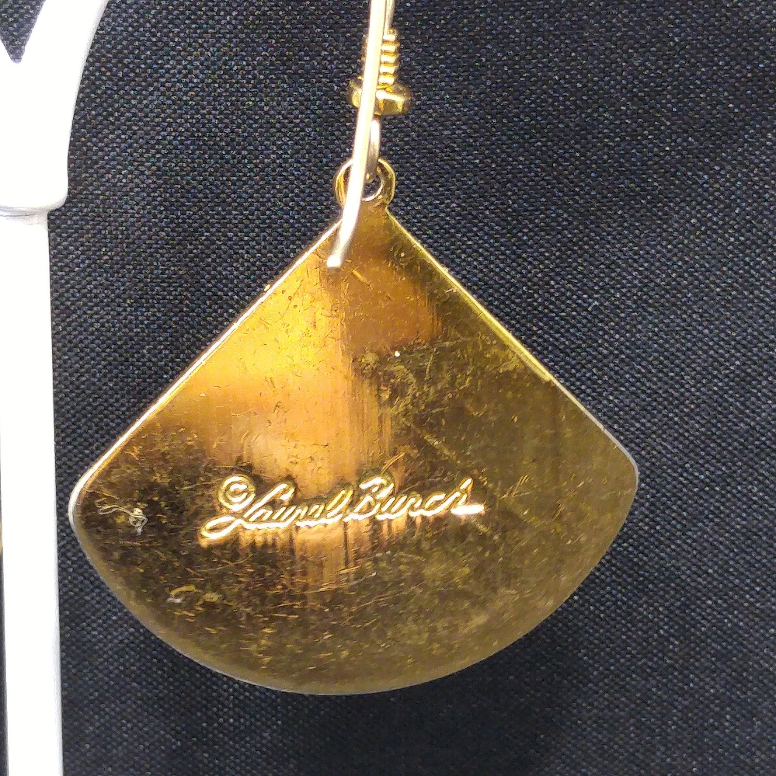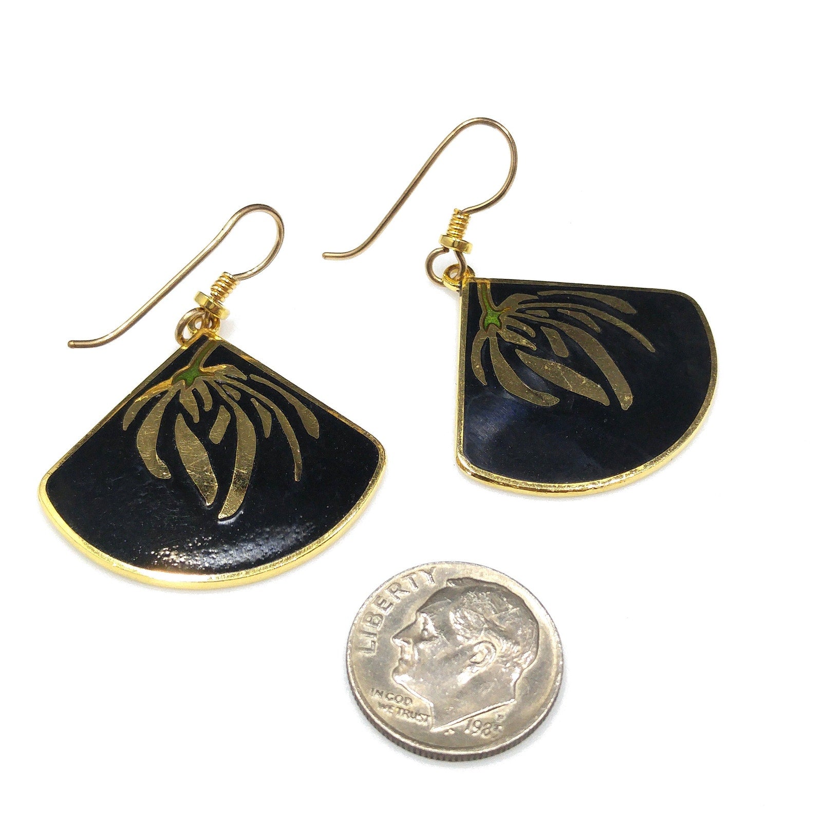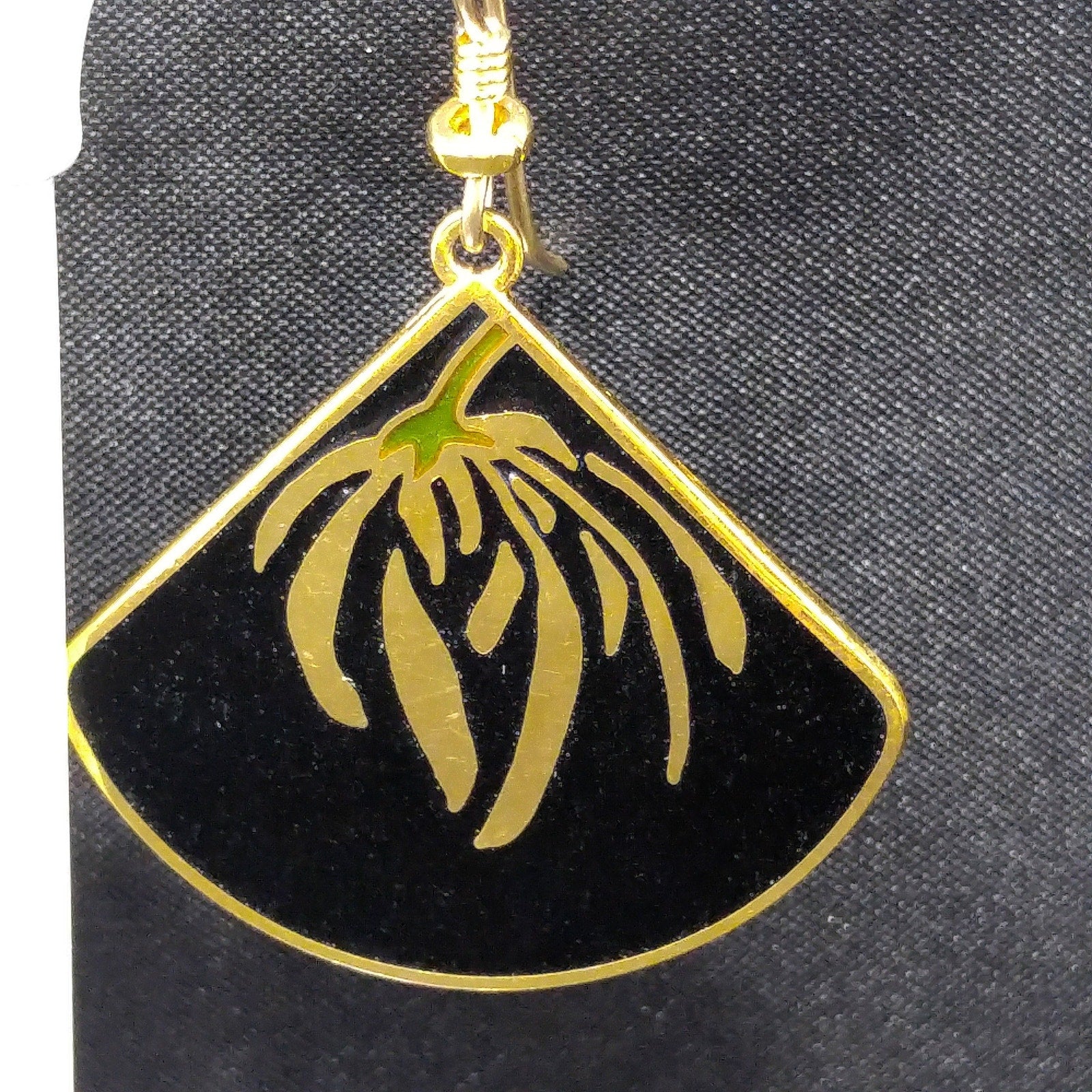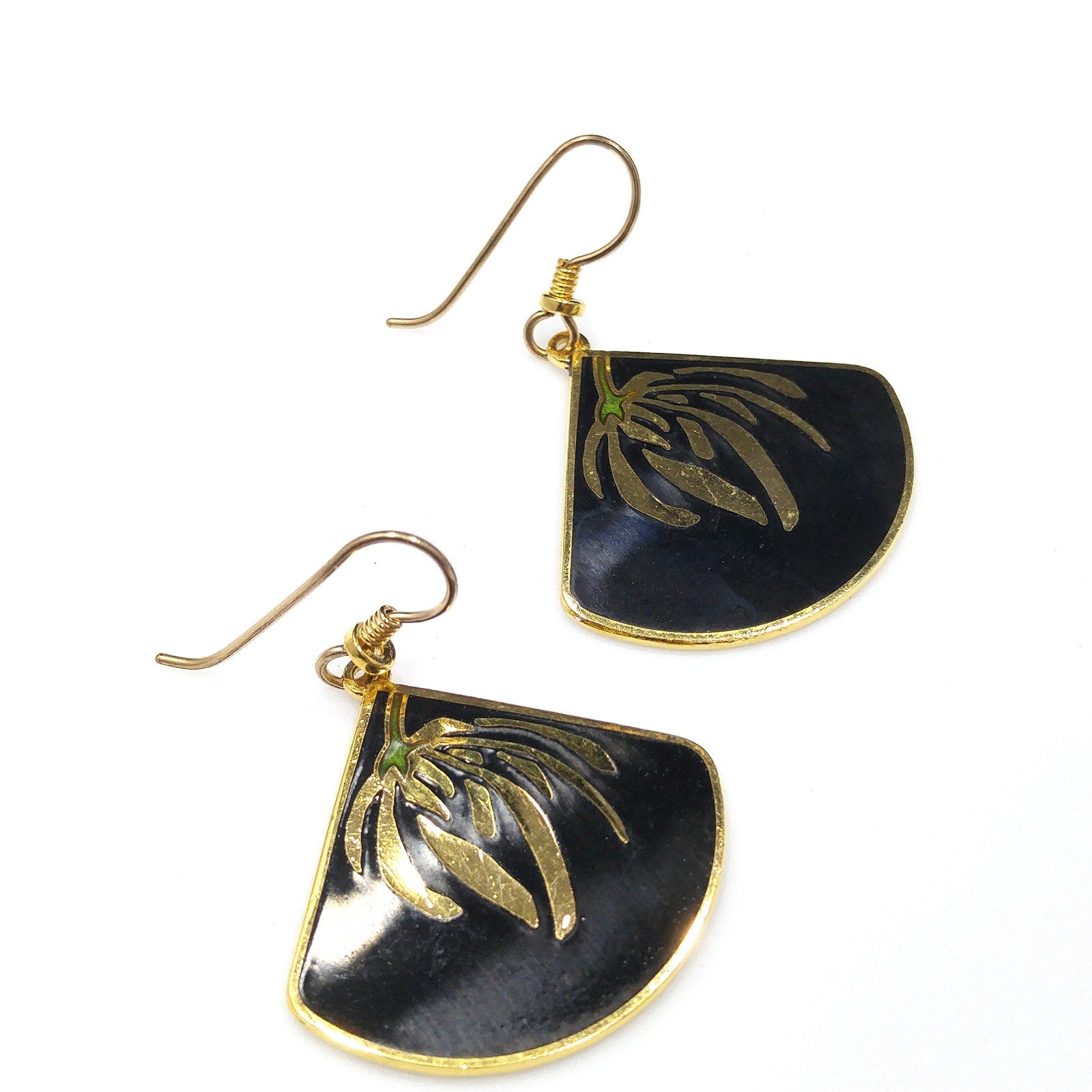 Laurel Burch Floral Earrings, Gold Plating, Black Enamel, Willow Fan, 1980s Vintage Jewelry