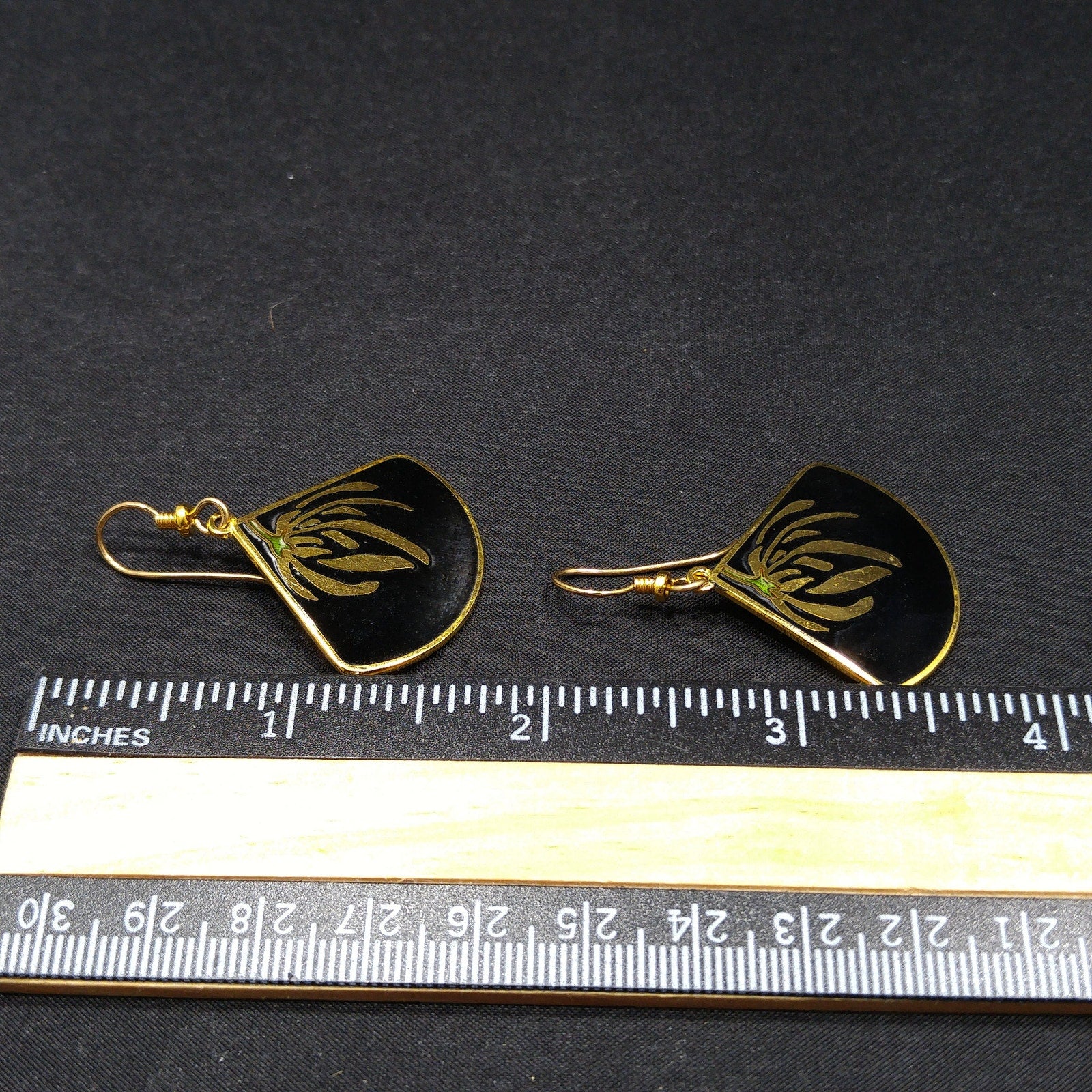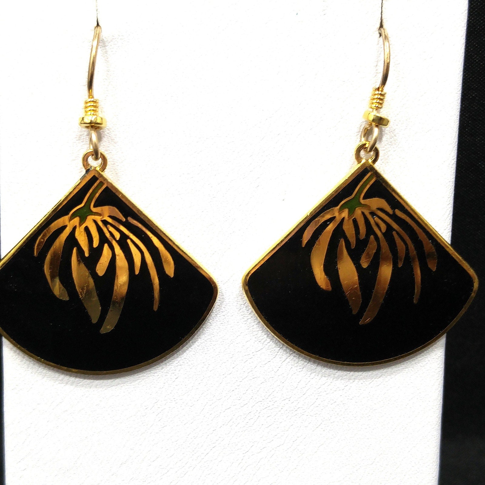 *Description: This is a beautiful pair of floral cloisonne and enamel Laurel Burch earrings from the 1980s. The delicate floral design is gold with a touch of green enamel near the top on the flower stem. The background is black enamel trimmed in gold plating. The earrings are stamped LAUREL BURCH on the back of each earring. The design is entitled "Willow Fan" however this pair of earrings is not stamped with the design name, only the designer. The ear wires are gold filled. This would be a great addition to your vintage jewelry collection or make a great vintage gift!